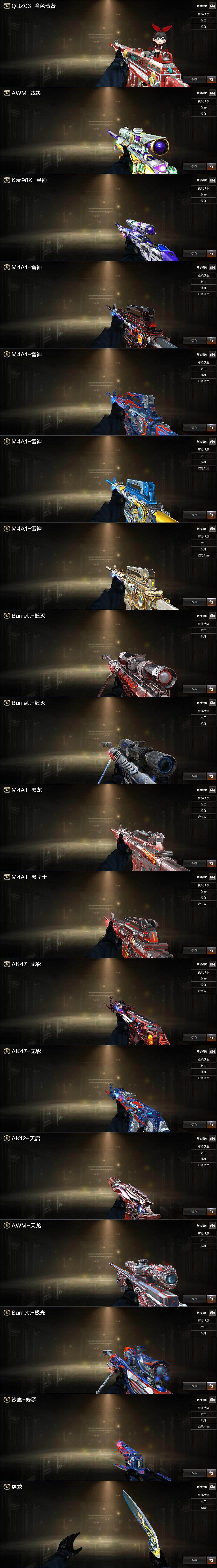 【热门武器】:传说圣谕,M200-幻神,死亡之眼,Kar98K-星神,M4A1-黑骑士,汤姆逊-烈龙*7,RPK-盘龙*7,加特林-炼狱*2,沙鹰-修罗*5