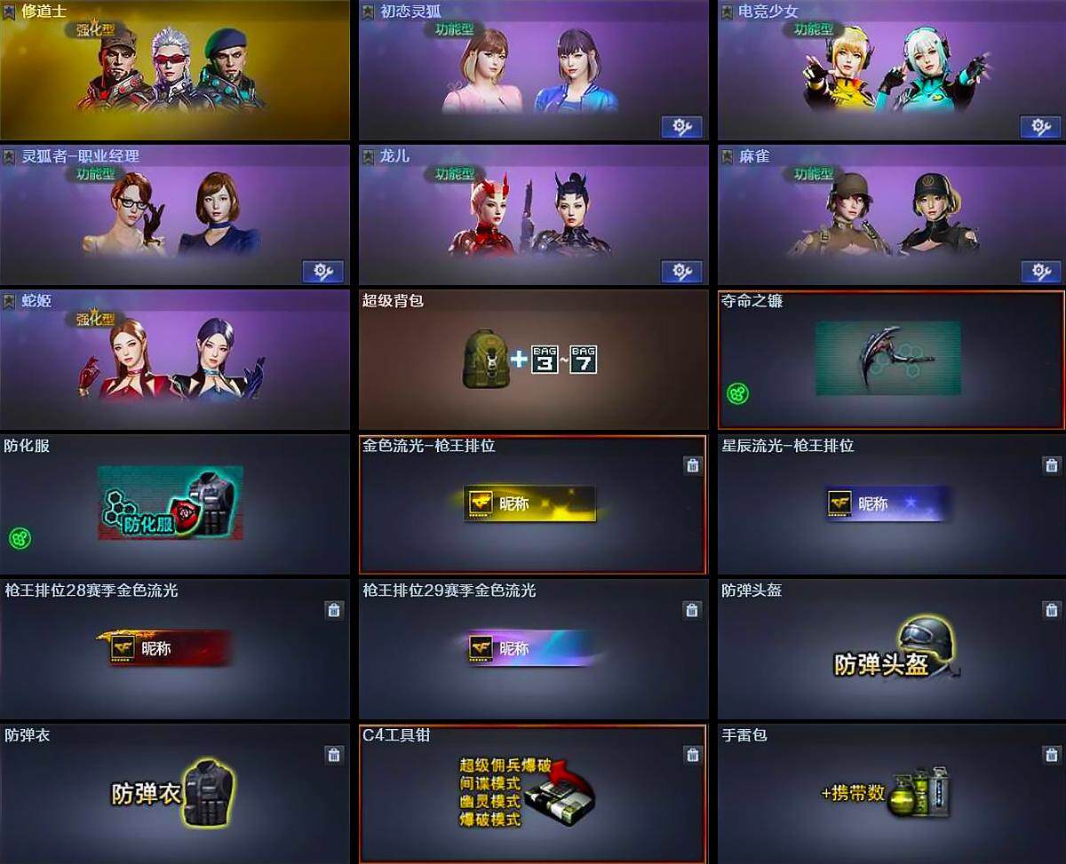 【道具】:超级背包,夺命之镰,防化服,金色流光-枪王排位,星辰流光-枪王排位,枪王排位28赛季金色流光,枪王排位29赛季金色流光,防弹头盔,防弹