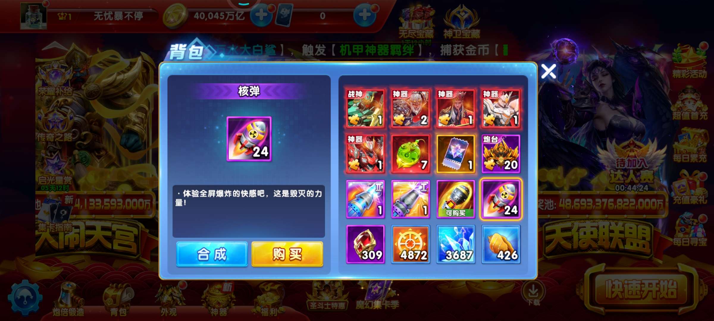 带号出 4兆金币 50炮 带滋炮台 巅峰12级 加速翅膀2天 4级狂2天 狂暴3822 核弹24