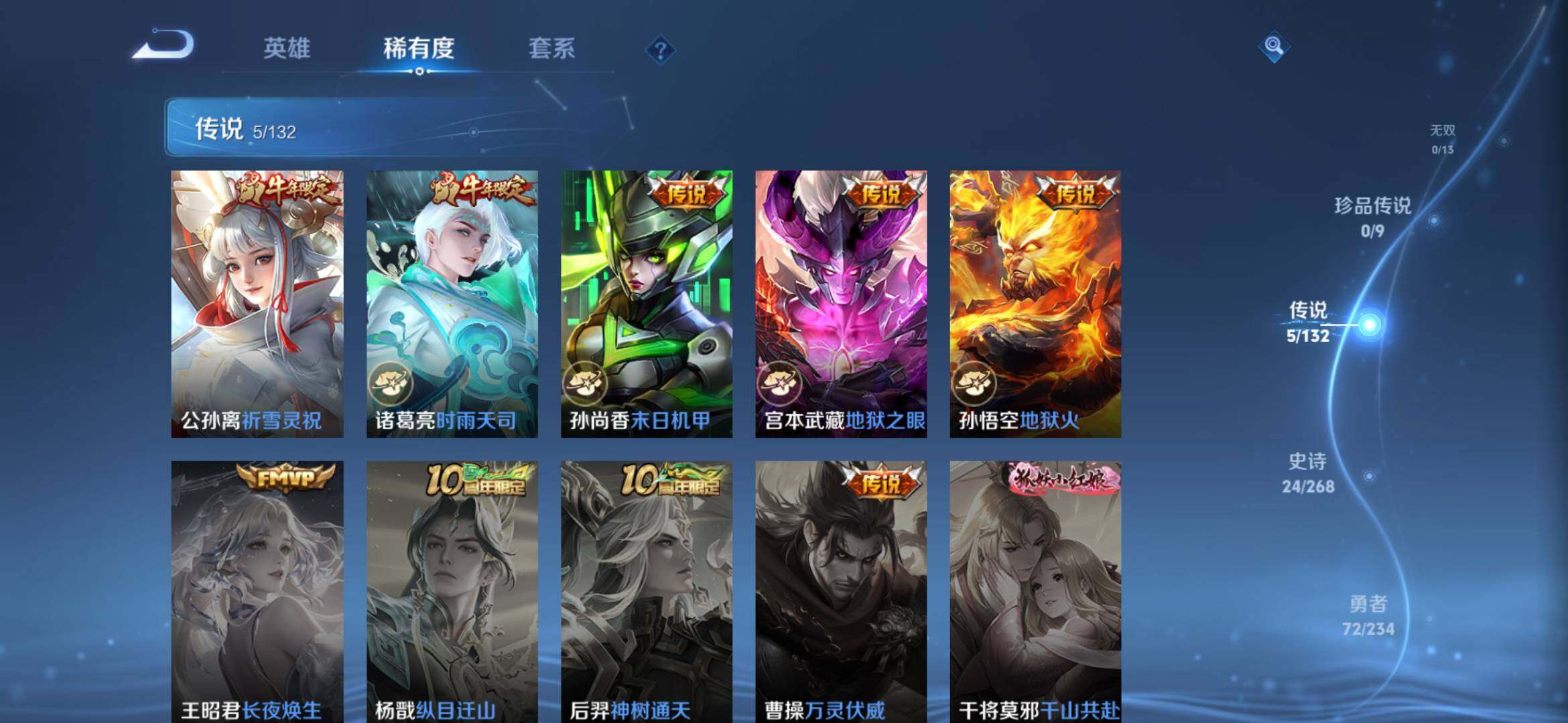 【传说皮肤】:公孙离祈雪灵祝,诸葛亮时雨天司,孙尚香末日机甲,宫本武藏地狱之眼,孙悟空地狱火