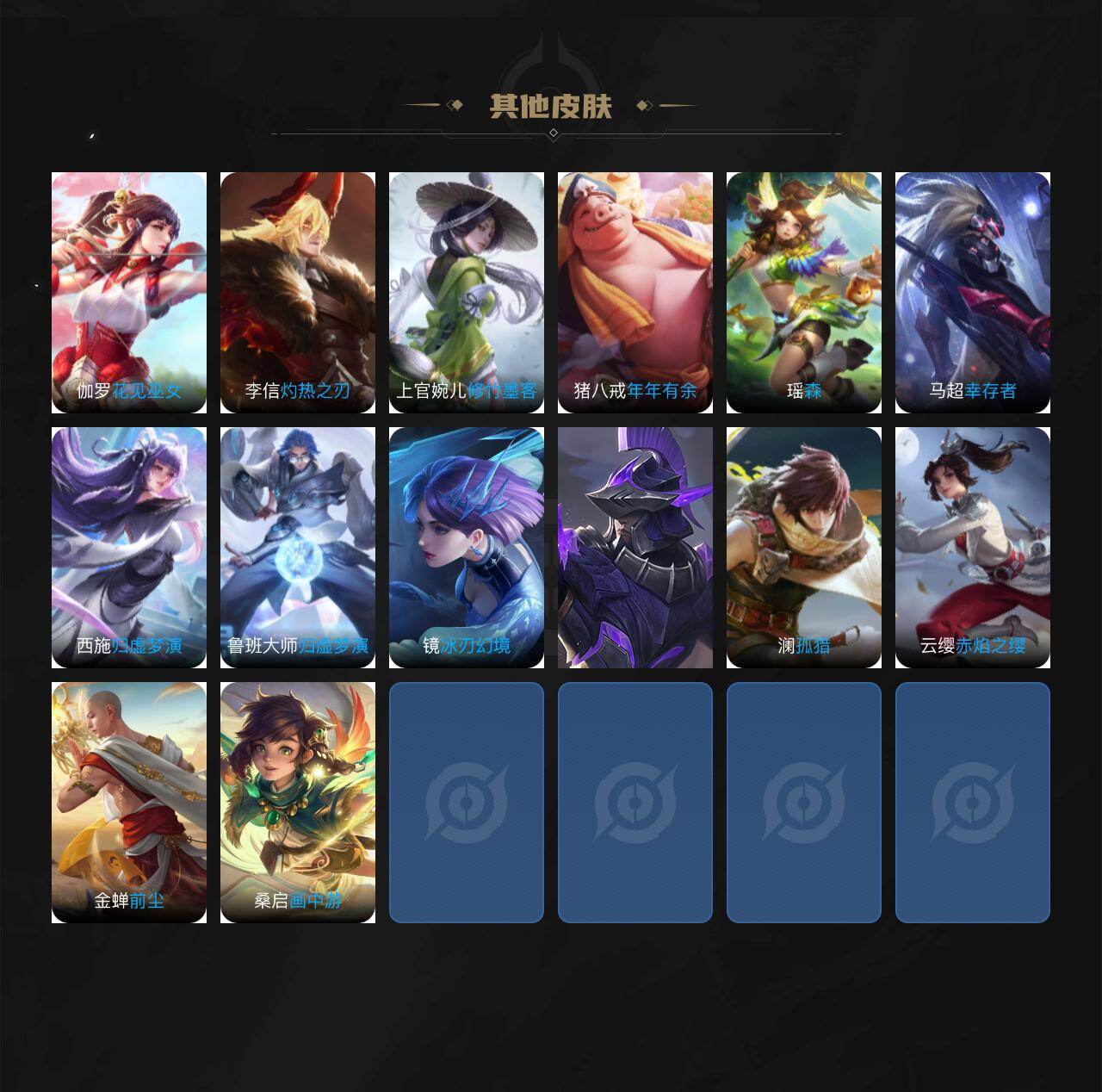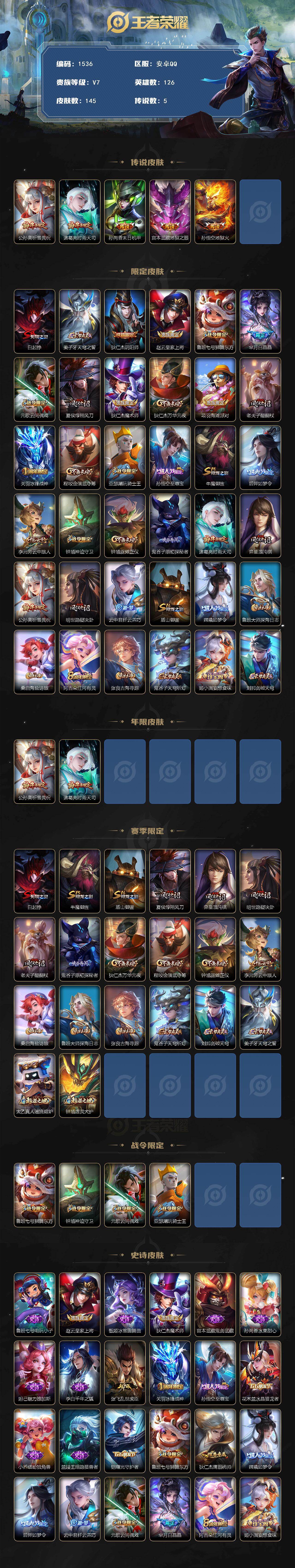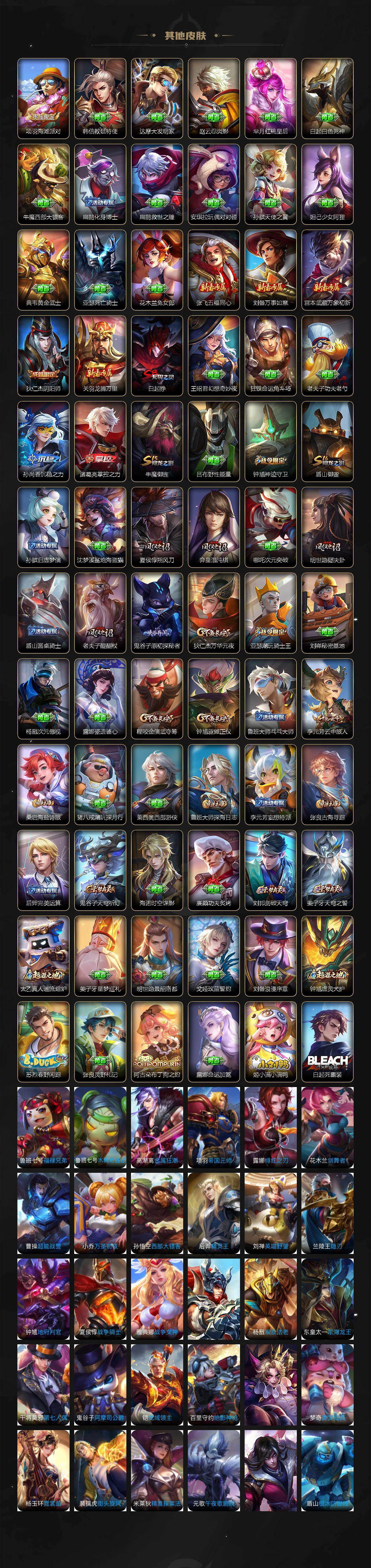 【限定皮肤】:白起狰,姜子牙天穹之誓,狄仁杰阴阳师,赵云皇家上将,鲁班七号狮舞东方,芈月白晶晶,元歌云间偶戏,夏侯惇朔风刀,狄仁杰魔术师