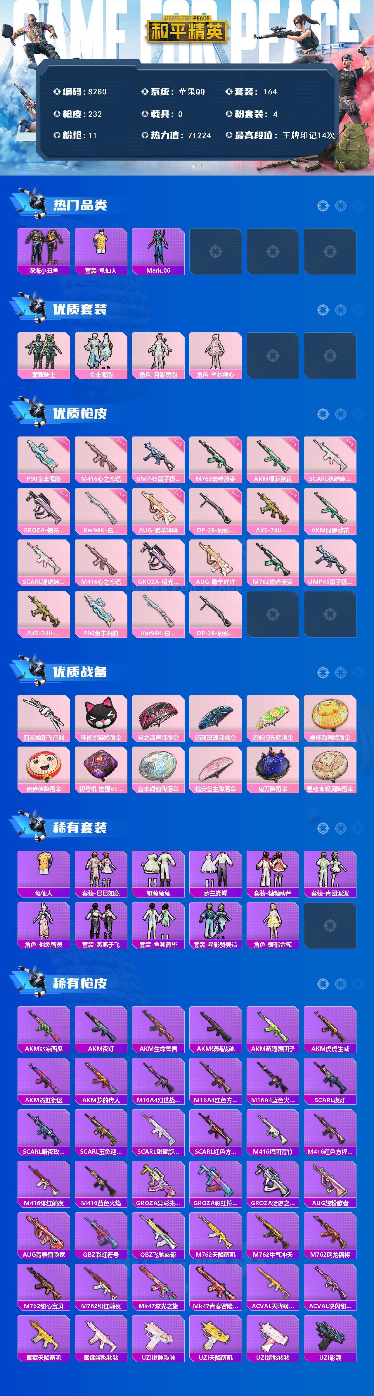 【8280】4粉装-11特效枪-0载具-2粉色飞行器-71224热力值-14王牌印记-164套装-232枪皮