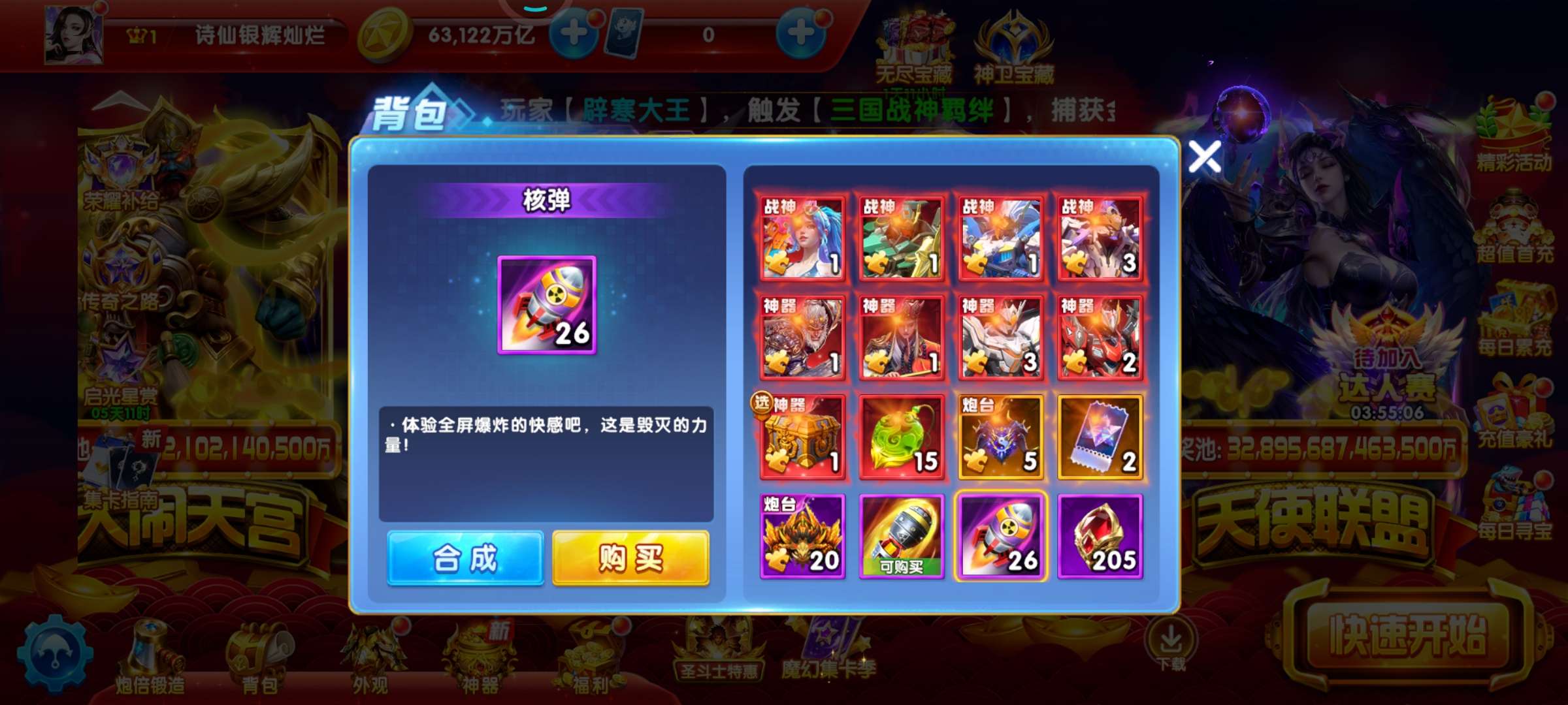 带号出 6.3兆金币 60炮 水枪出战 巅峰10级 狂暴3498 核弹26