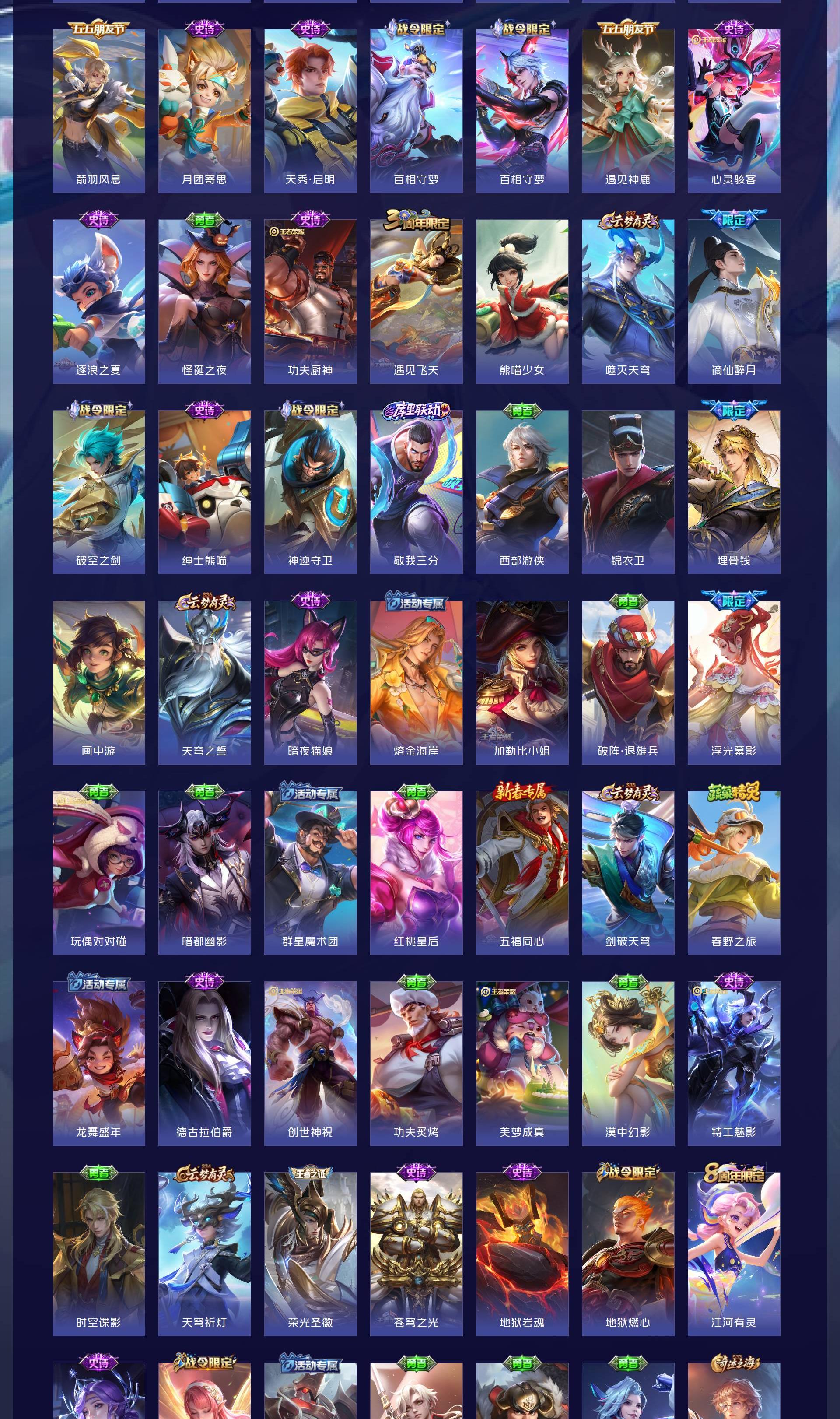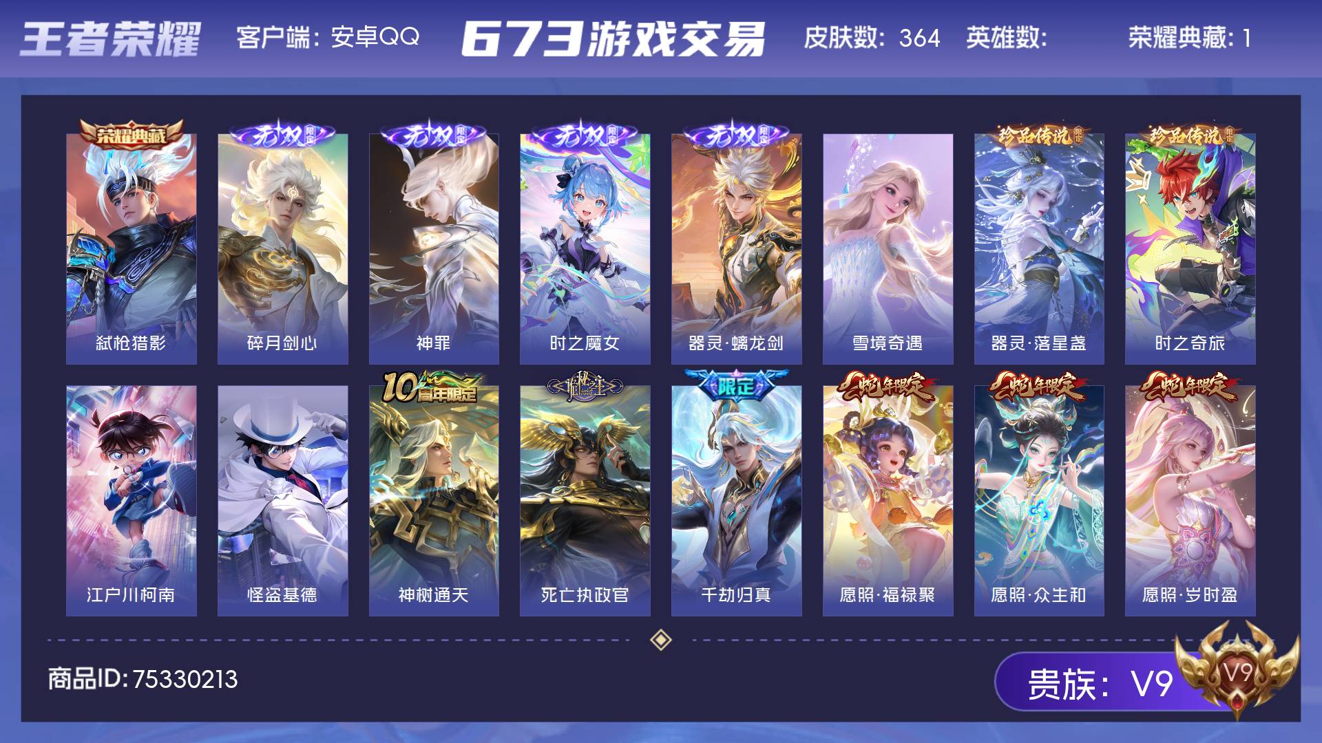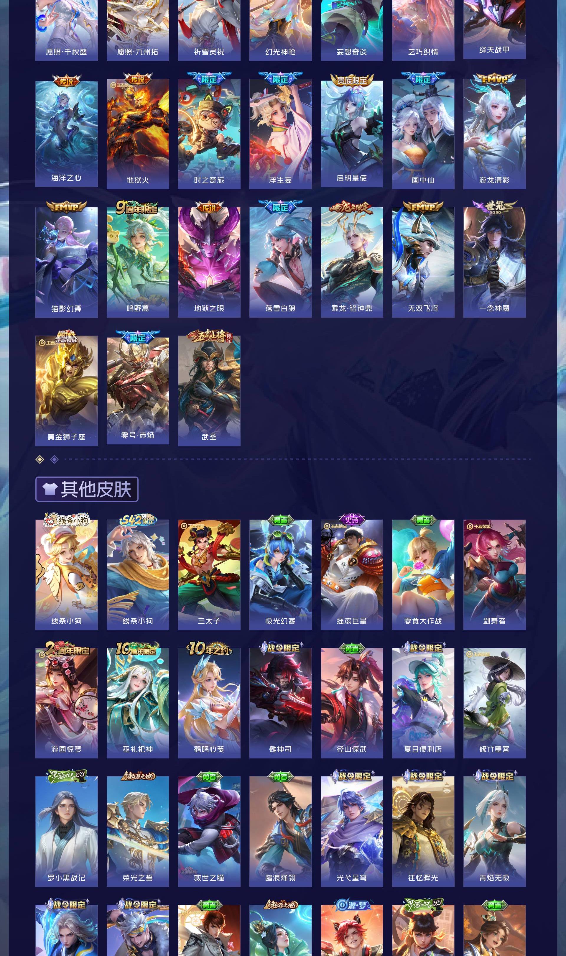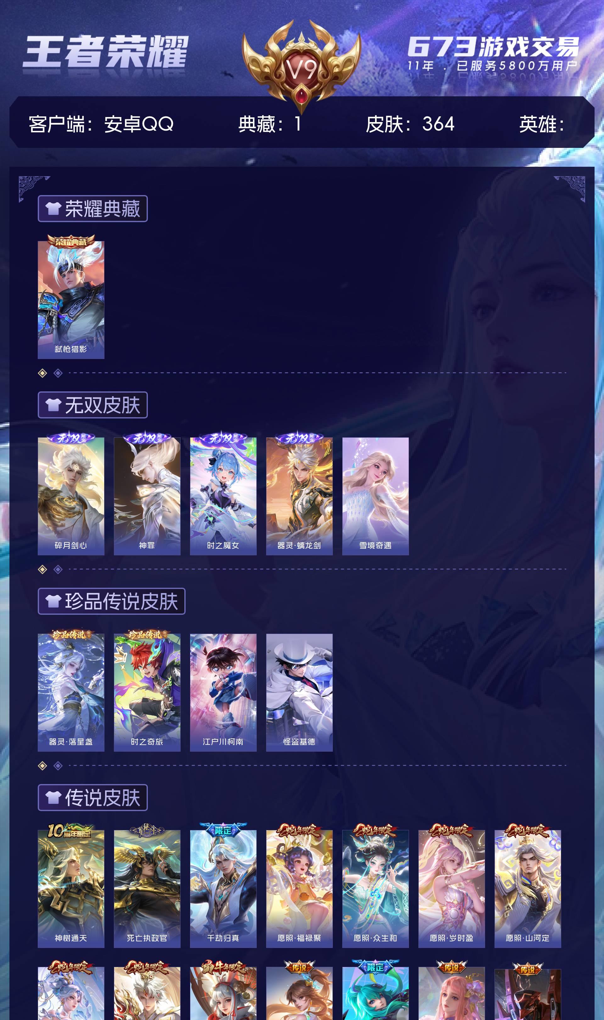 V9 皮肤364 至尊星耀 荣耀典藏1 无双皮肤5 珍品传说4 传说32 其他皮肤326