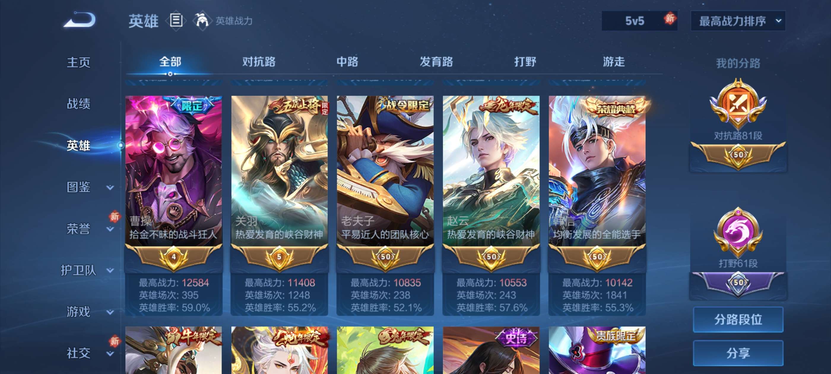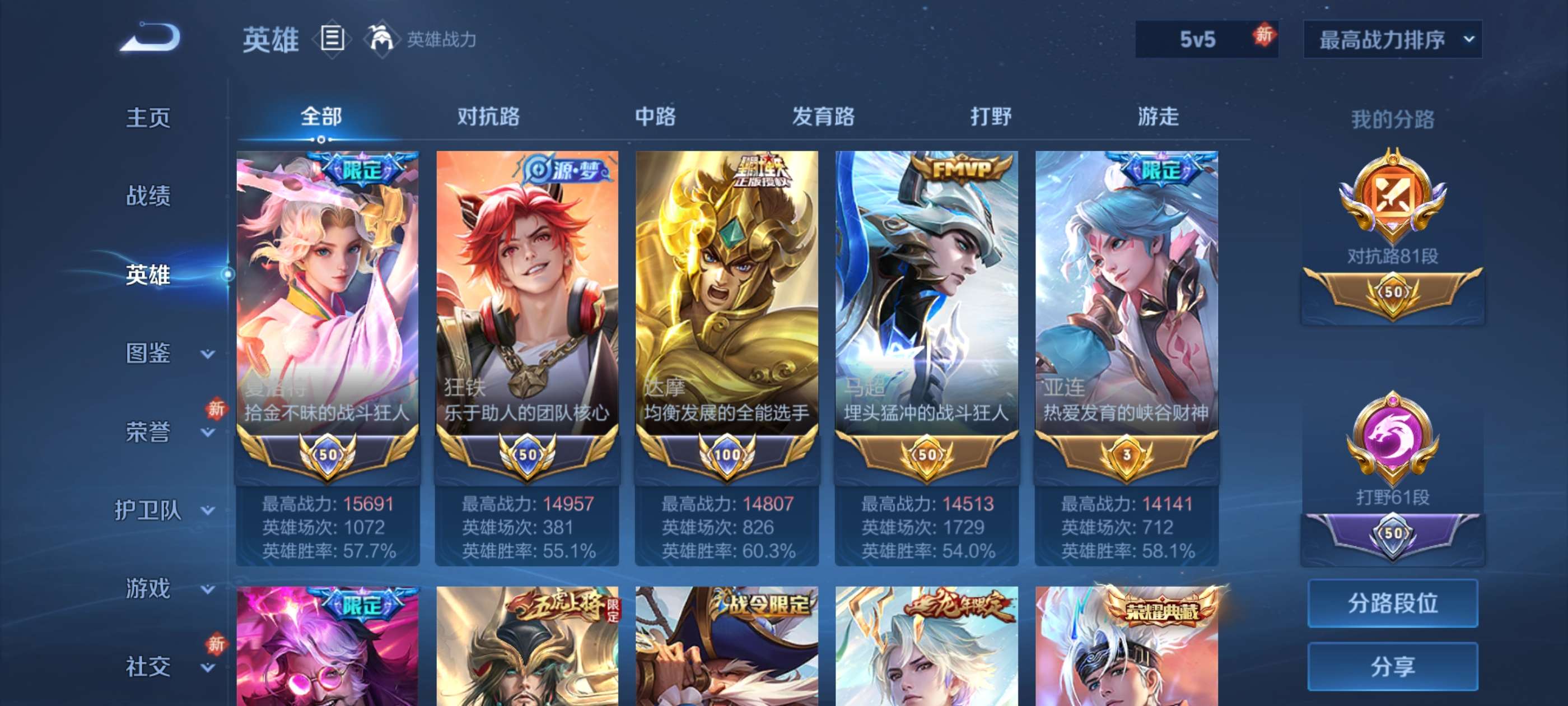 81段对抗路,61段打野精品男神账号带妹首选带小魔方全都是质量皮肤