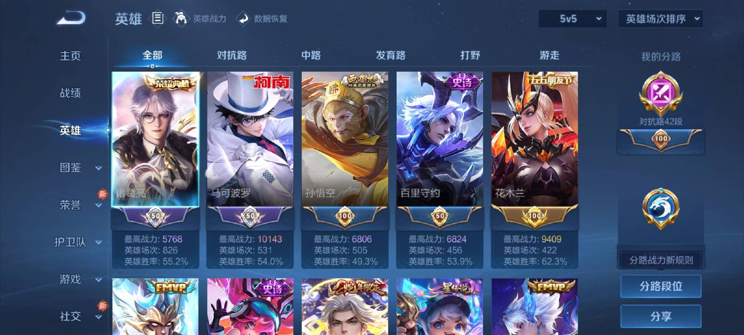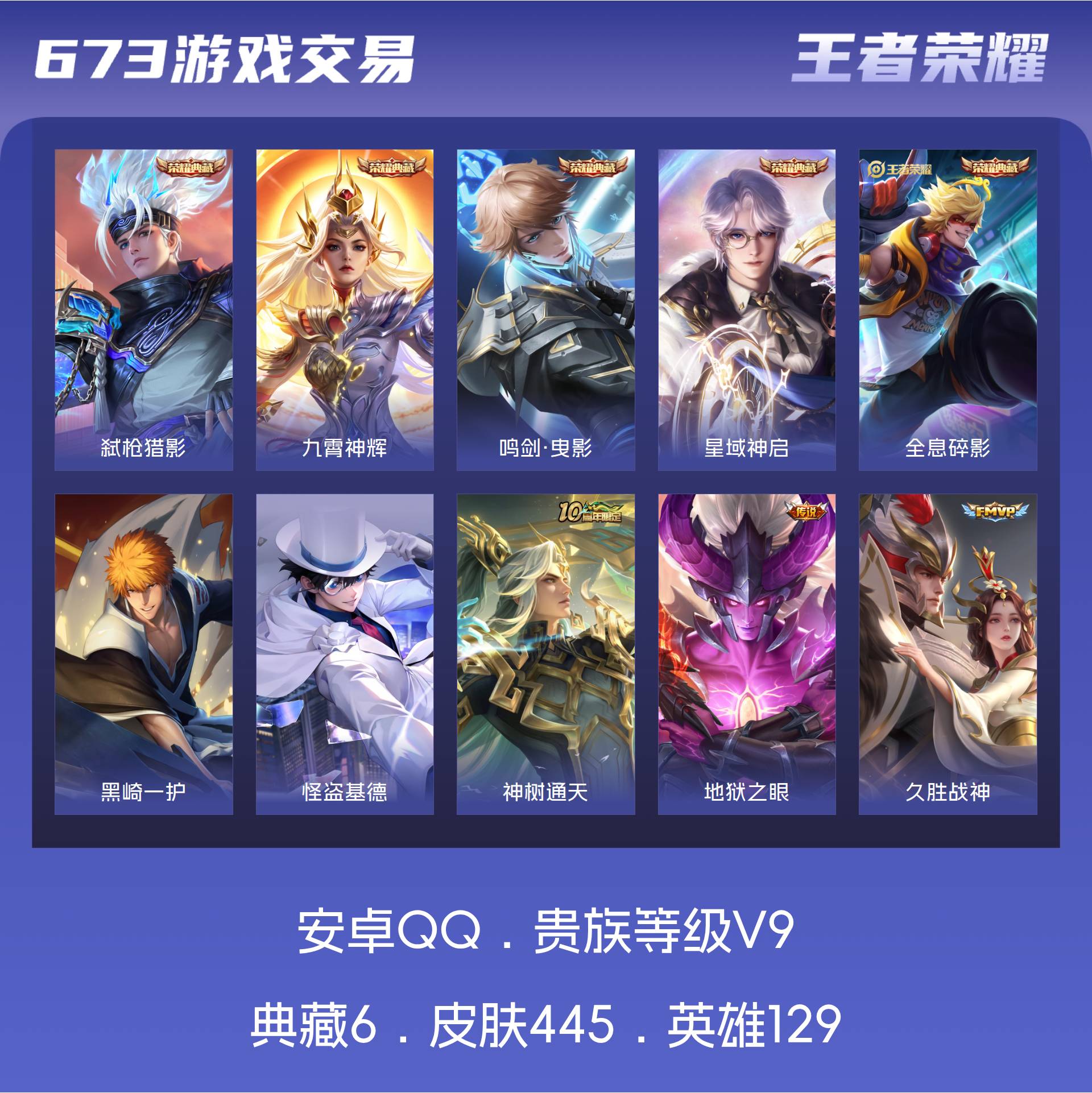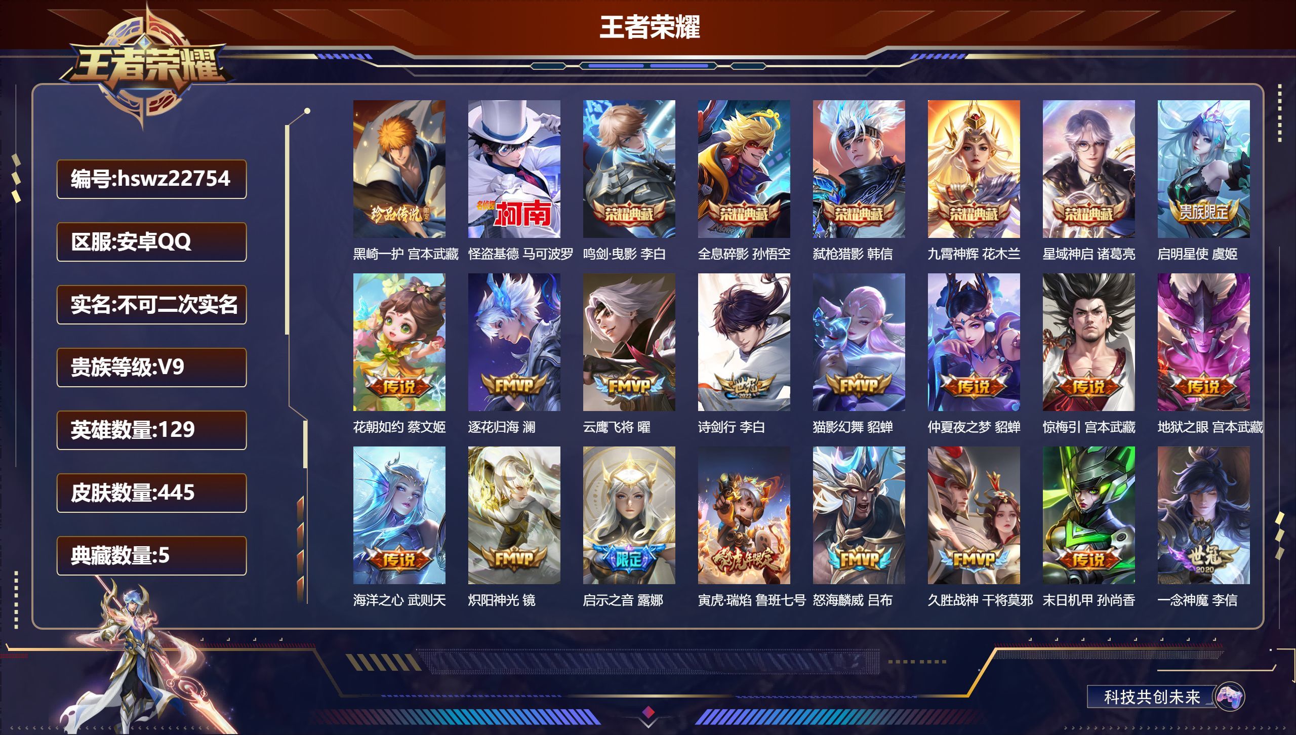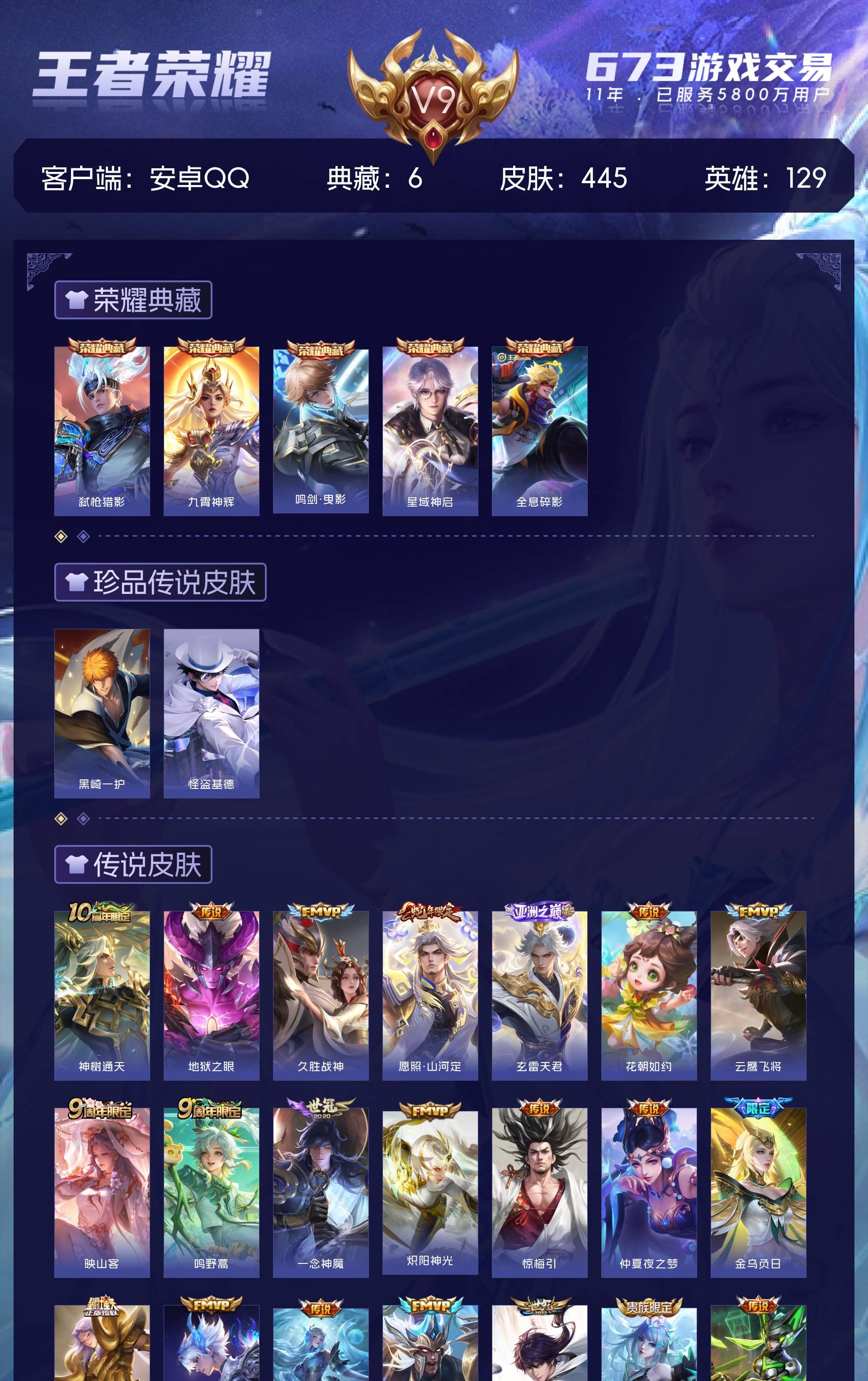 安卓QQ/最强王者/445皮肤/129英雄/5典藏/0珍品无双/0无双/2珍品传说/25传说/136