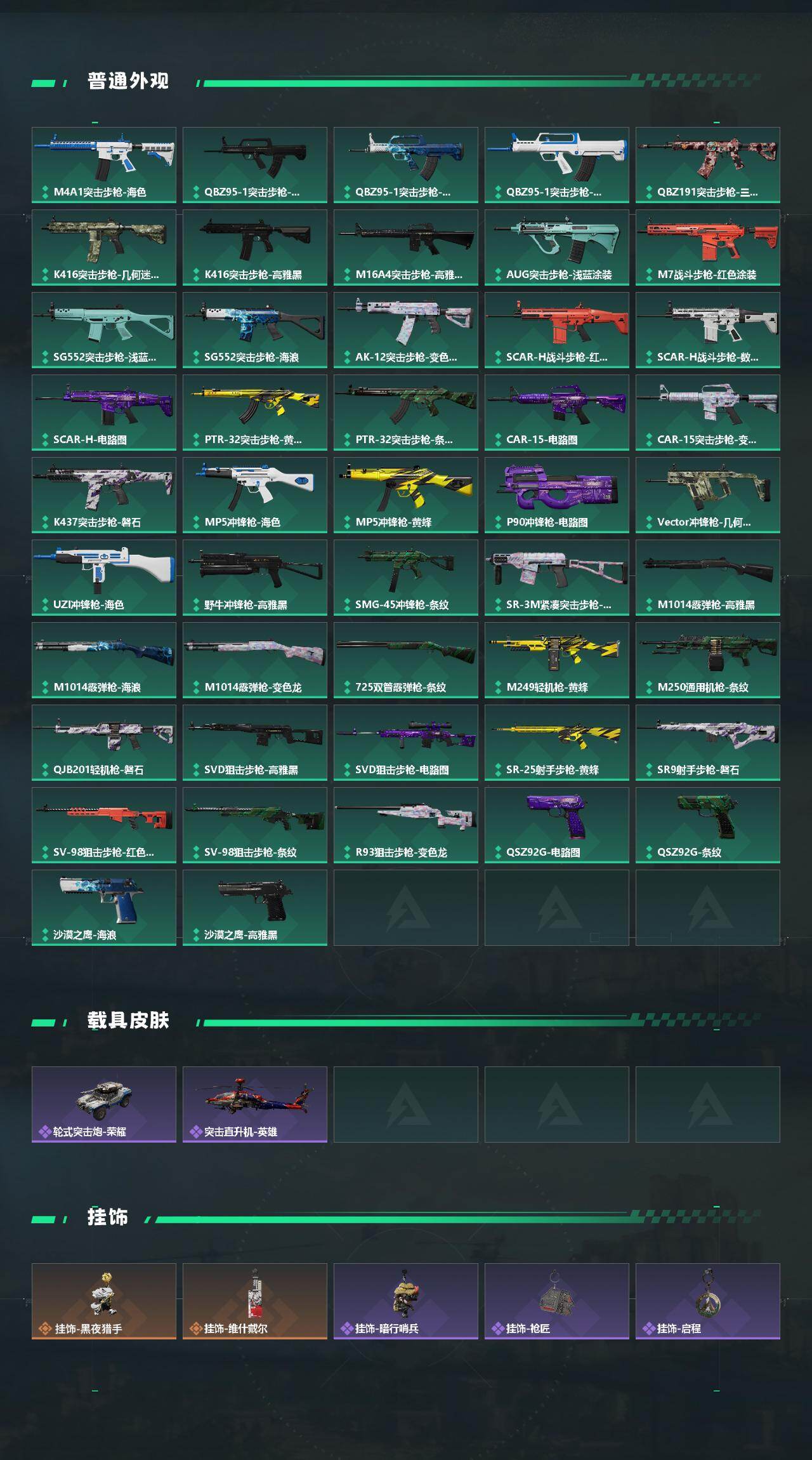 【传说外观】:M4A1突击步枪-阿米娅,SG552突击步枪-运动员,SCAR-H战斗步枪-启航,KC17突击步枪-电锯惊魂,P90冲锋枪-信条,M250通用机枪-骑士之心,M14射手步枪-电锯惊魂,SR-25