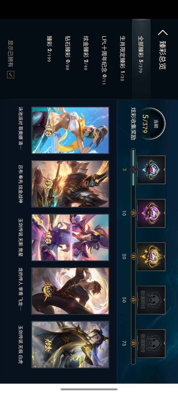 【臻彩皮肤】:龙的传人李青飞龙在天,玉剑传说无极白虎,吕布奉先炫金战神,玉剑传说无影竞星,泳池派对菲奥娜清凉苹果冰