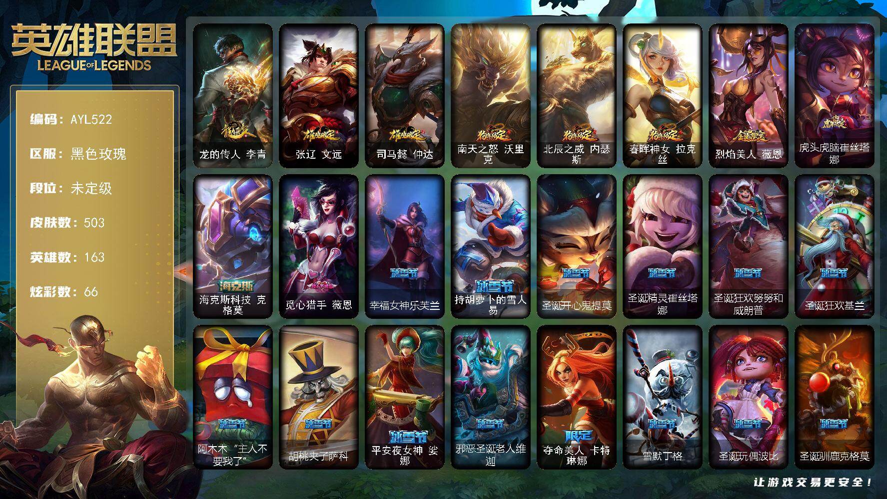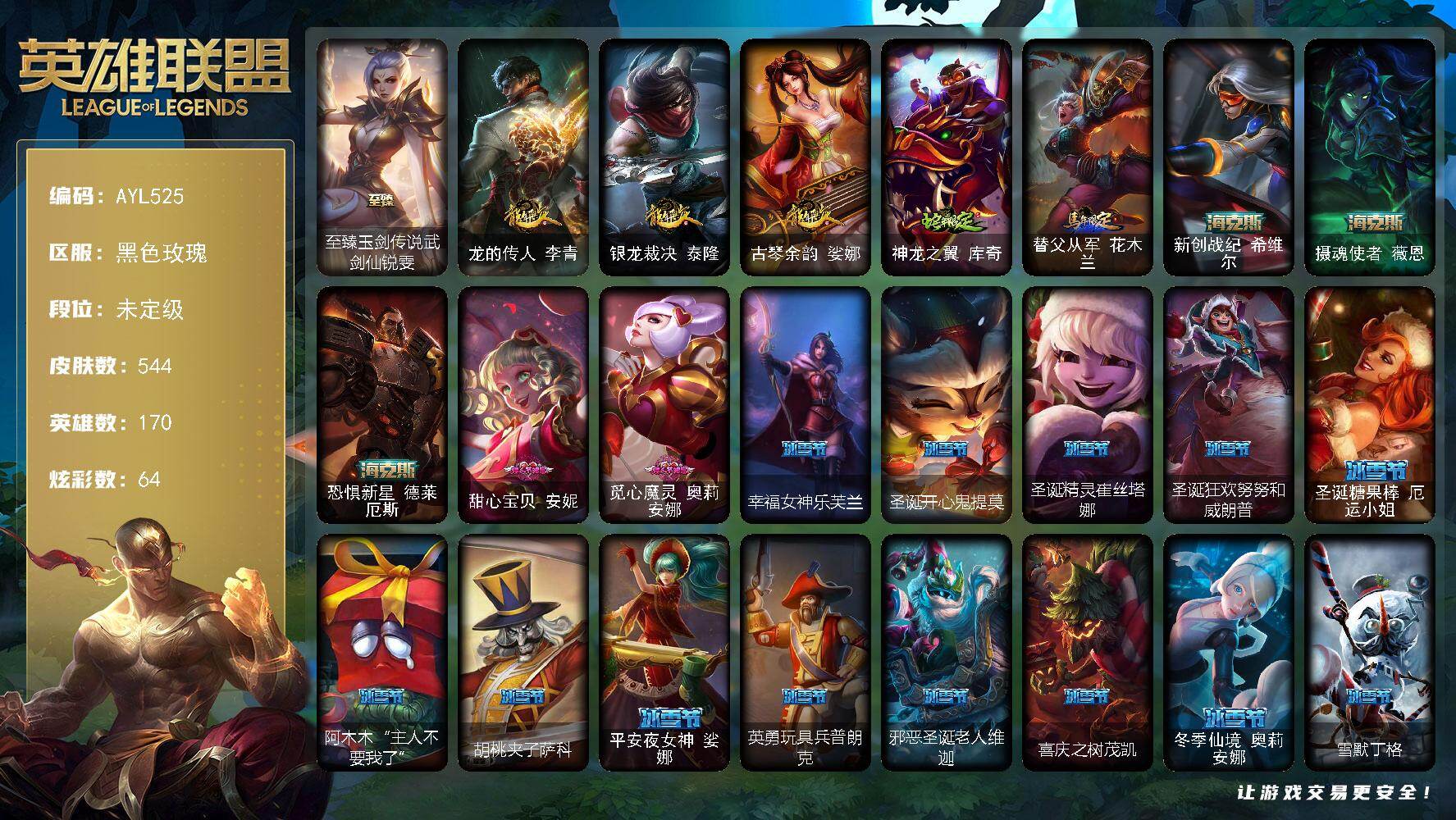 【店主推荐捡漏号】青铜段位-172英雄-551皮肤-245炫彩-1终极-9神话-87限定-52传说-143史诗