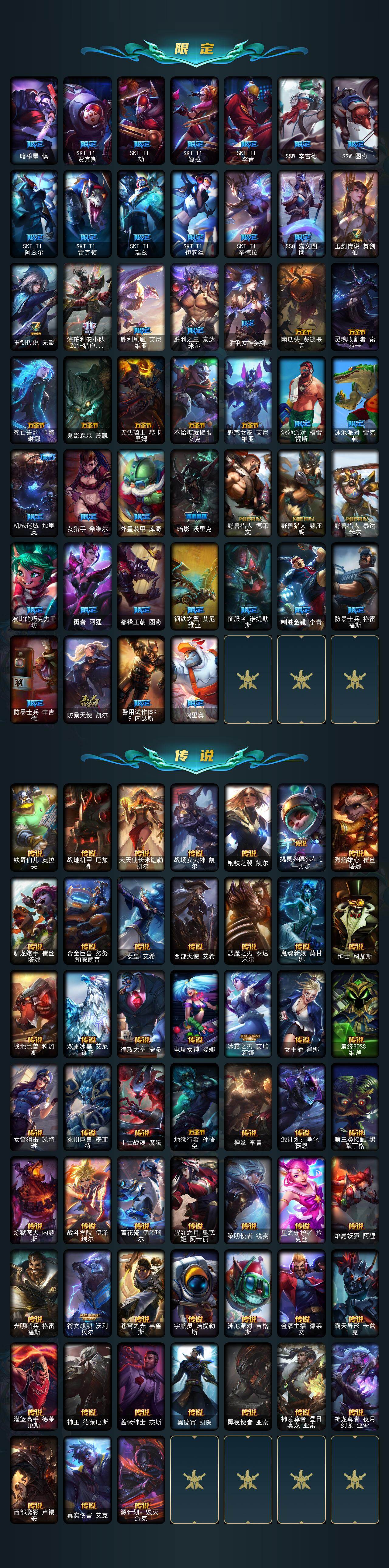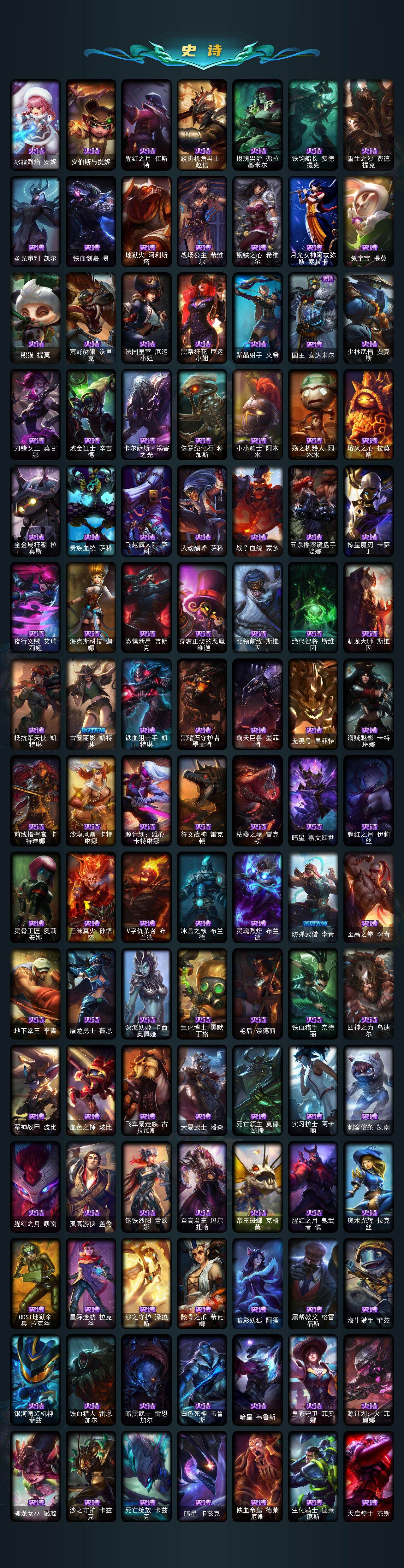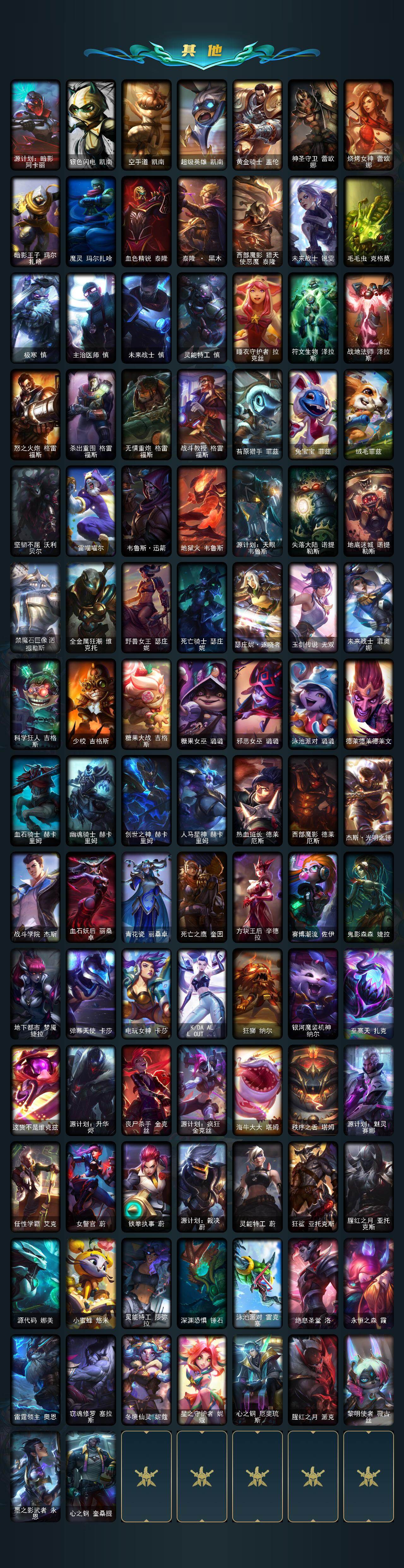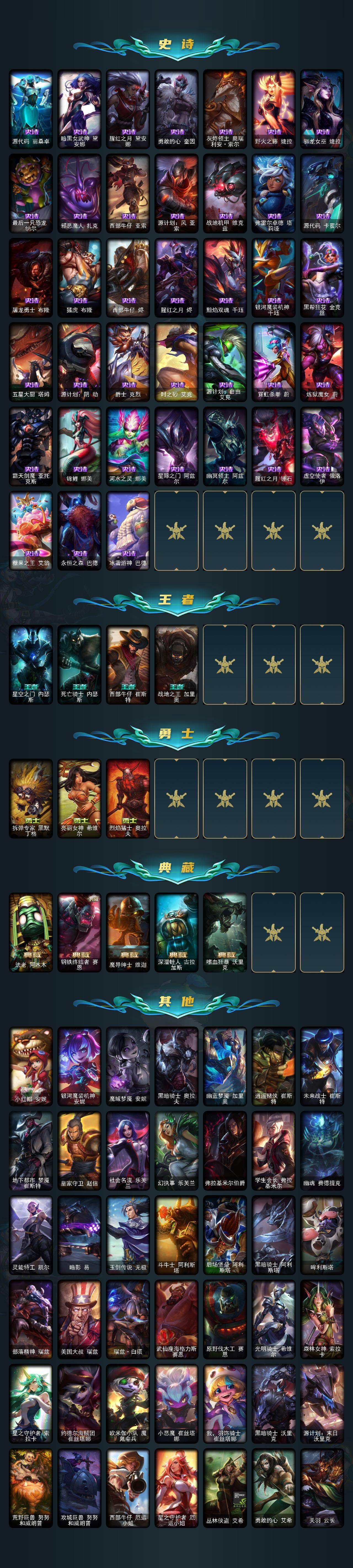 【臻彩皮肤】:天龙之子卡莎飞龙乘云,无畏骑士瑟庄妮赤子初心,墨之影武者亚索金墨耀影,冠军之血希瓦娜凯旋圣装,雾雨之刃锐雯,弹幕天使卡莎炽天使公正,可爱可爱粉