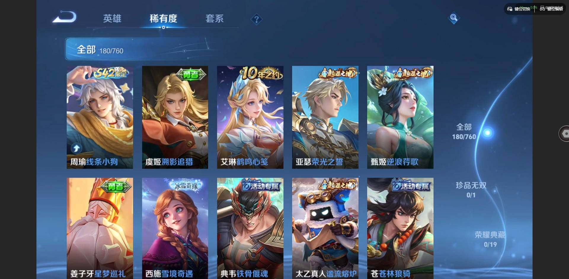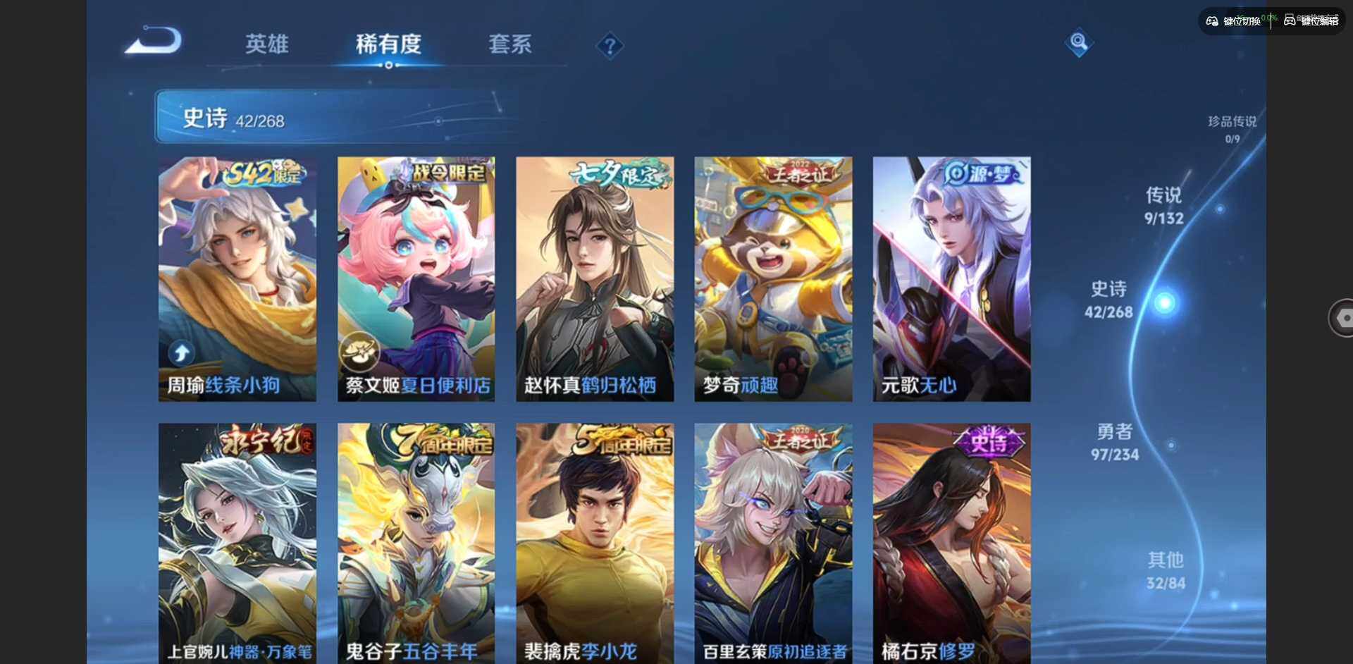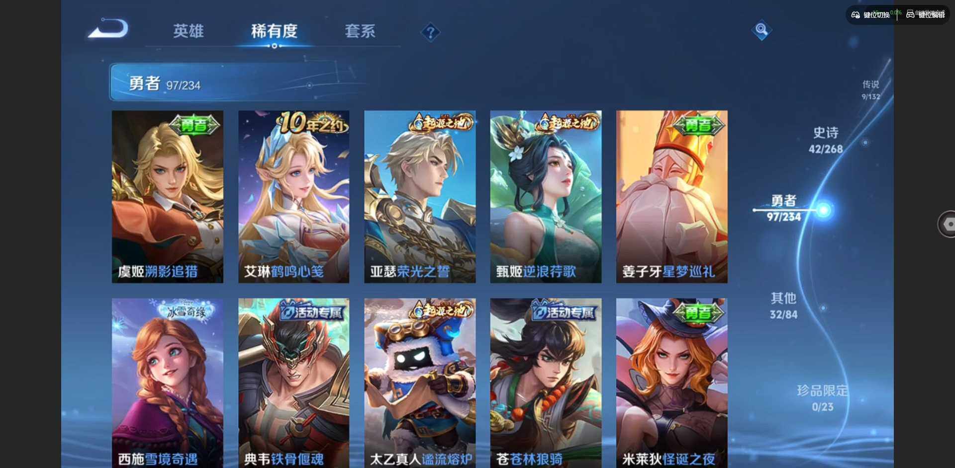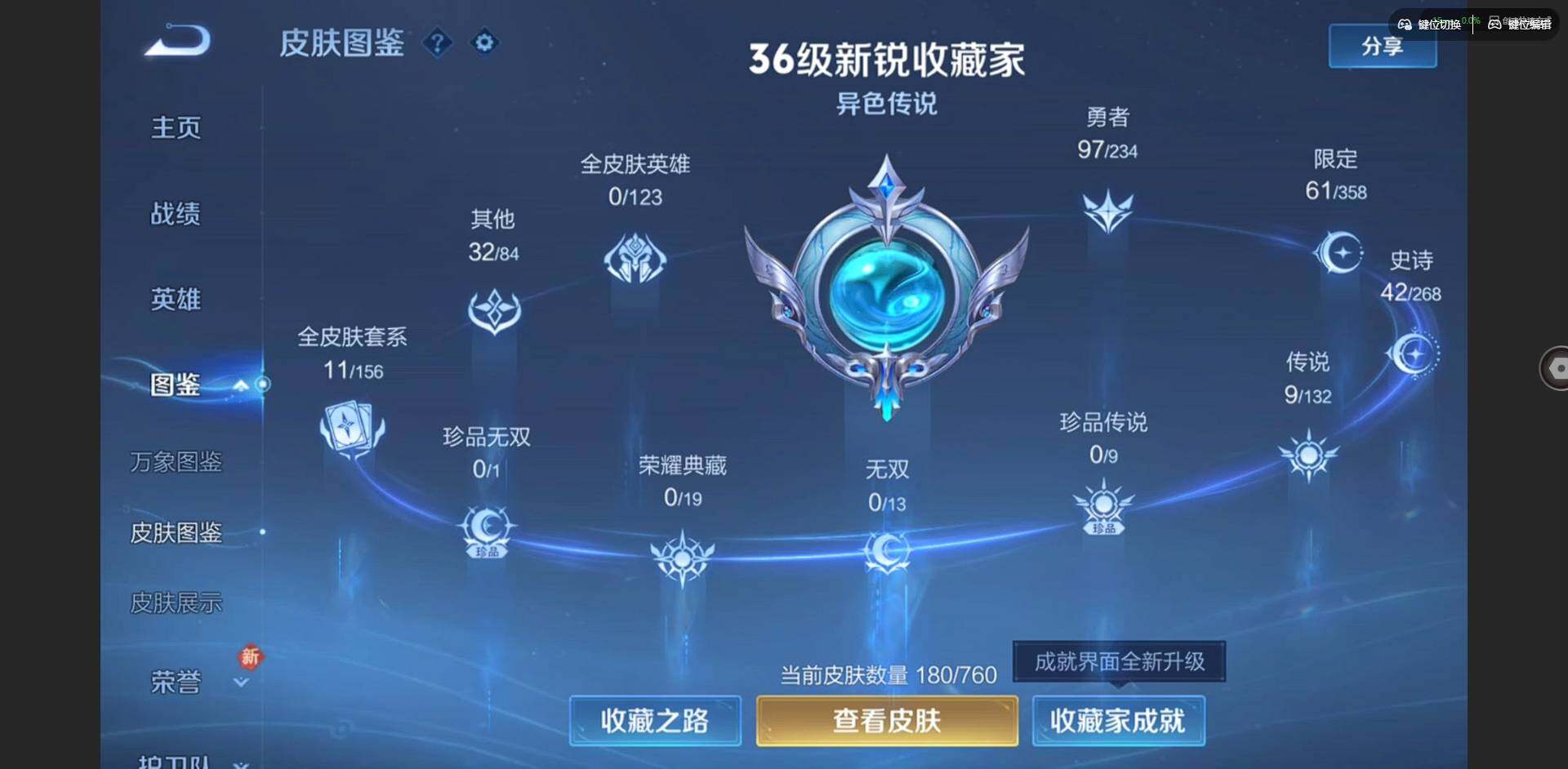 实名: 可修改 贵族等级: V7 英雄数: 127 皮肤数: 180 星传说: