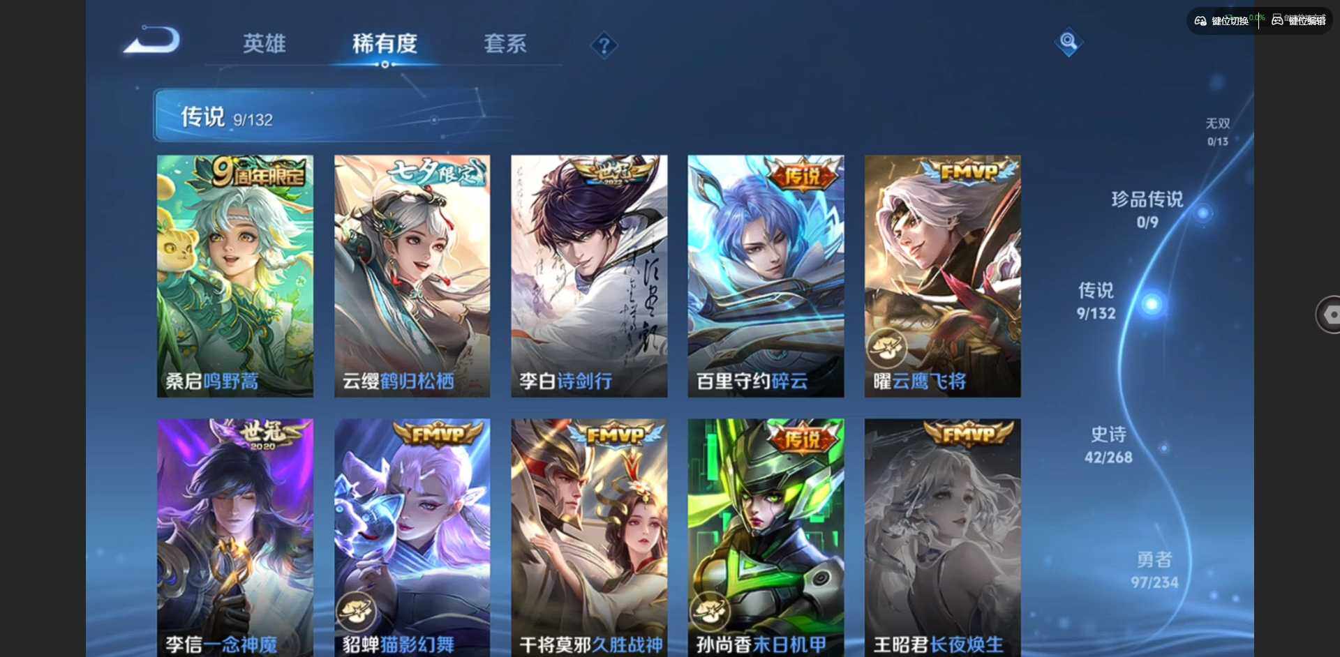 /实名: 可修改 贵族等级: V7 英雄数: 127 皮肤数: 180 星传说: 未来机甲 传说皮: 云鹰飞将,猫影幻舞,久胜战神,一念神魔,末日机甲-孙尚香,碎云,鹤归松栖(云缨) 限定皮: 遇见飞天,李小龙,梁祝,至尊宝,大圣娶亲,五谷丰年,神器·万象笔,诗剑行,鸣野蒿