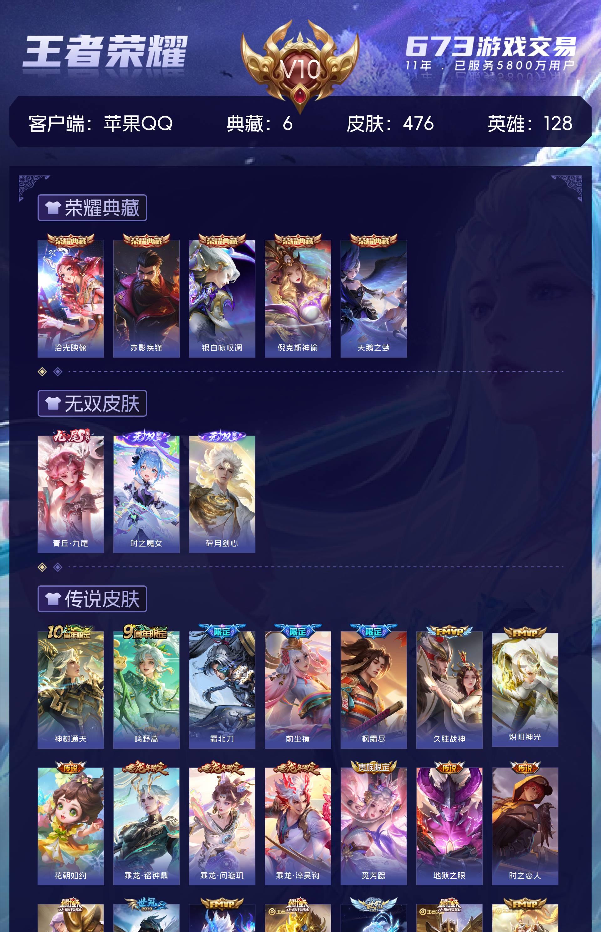 苹果QQ/至尊星耀/476皮肤/128英雄/5典藏/0珍品无双/3无双/0珍品传说/58传说/144