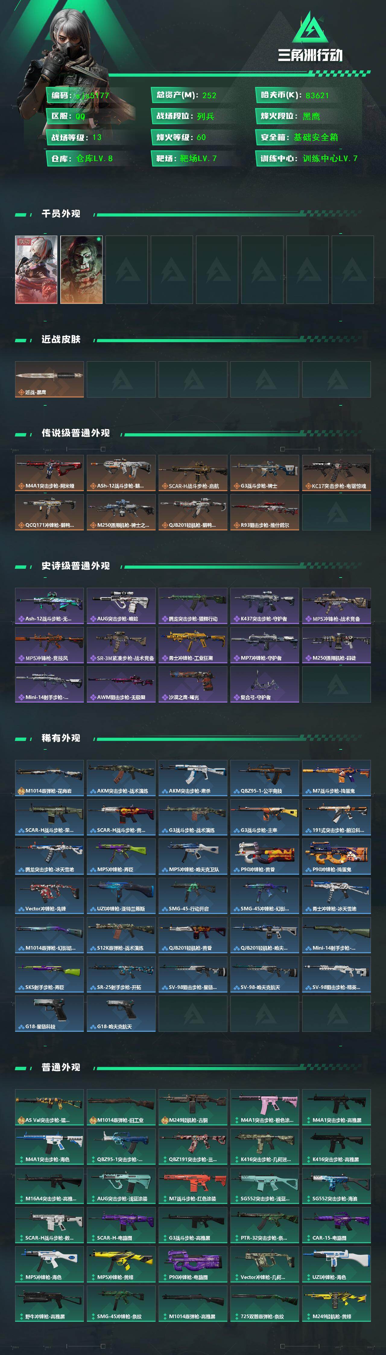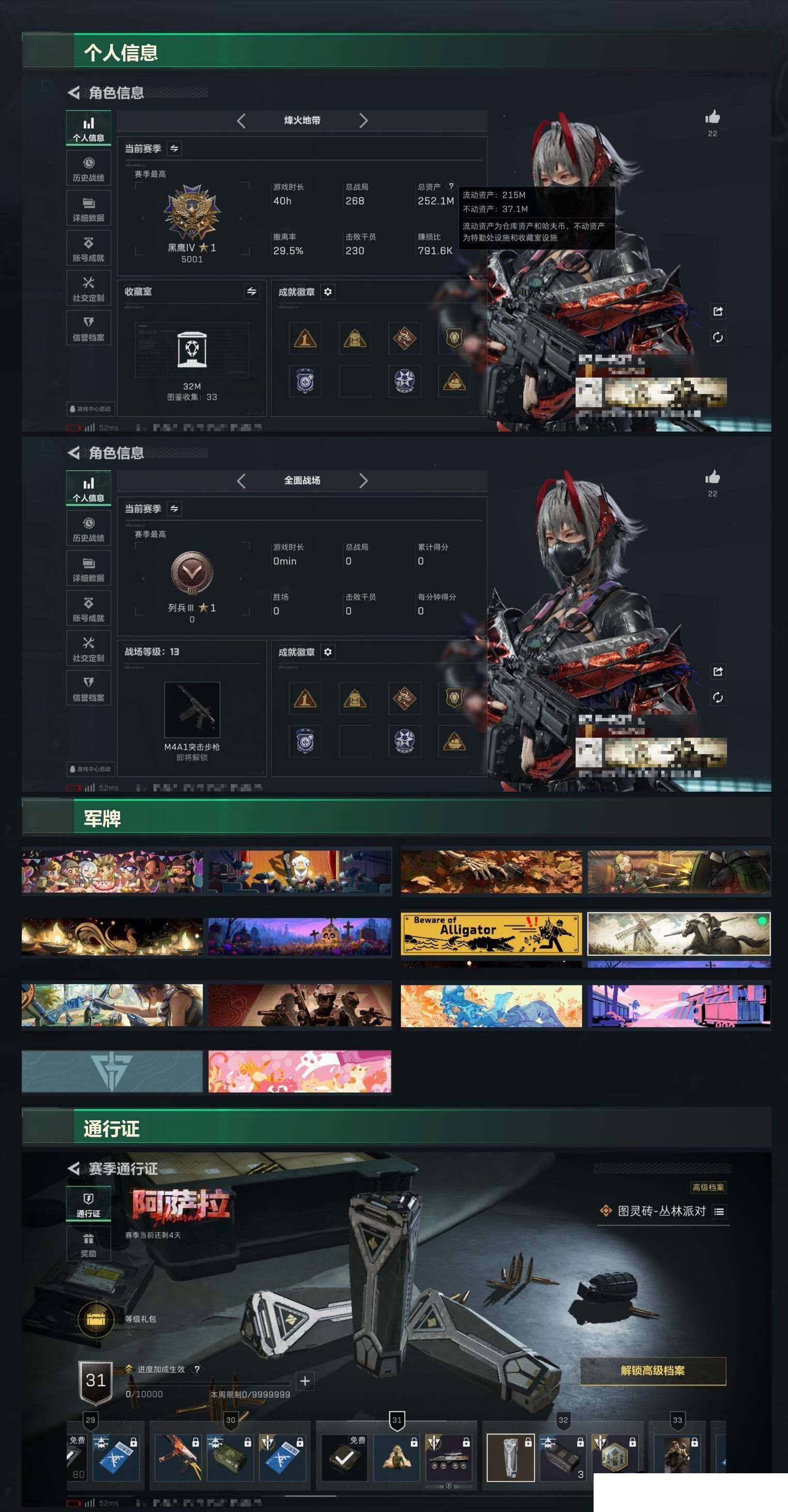 总资产260m 维什戴尔 训练中心7 靶场7烽火地带段位: 黑鹰 全面战场段位: 列兵 总资产: 252000000 哈夫币: 83621000