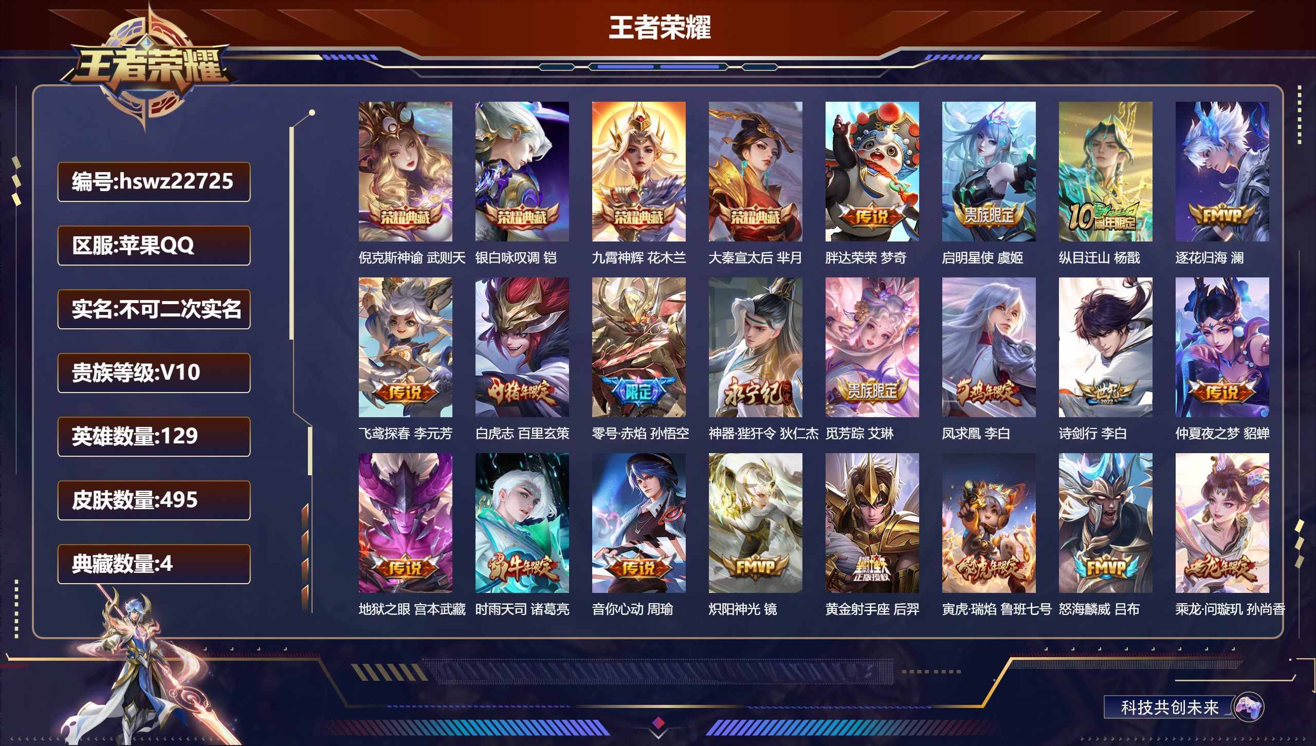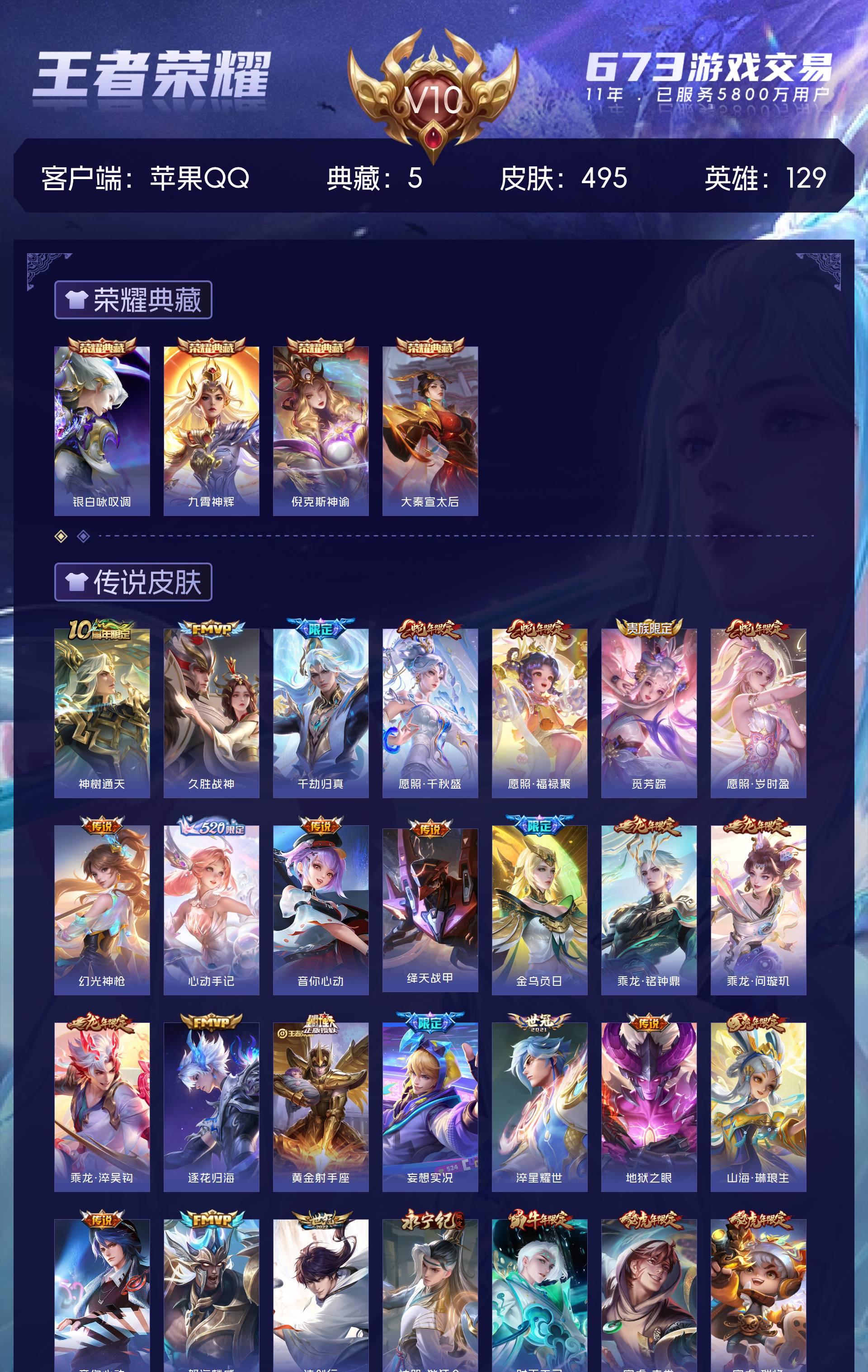 苹果QQ/至尊星耀/495皮肤/129英雄/4典藏/0珍品无双/0无双/0珍品传说/46传说/159