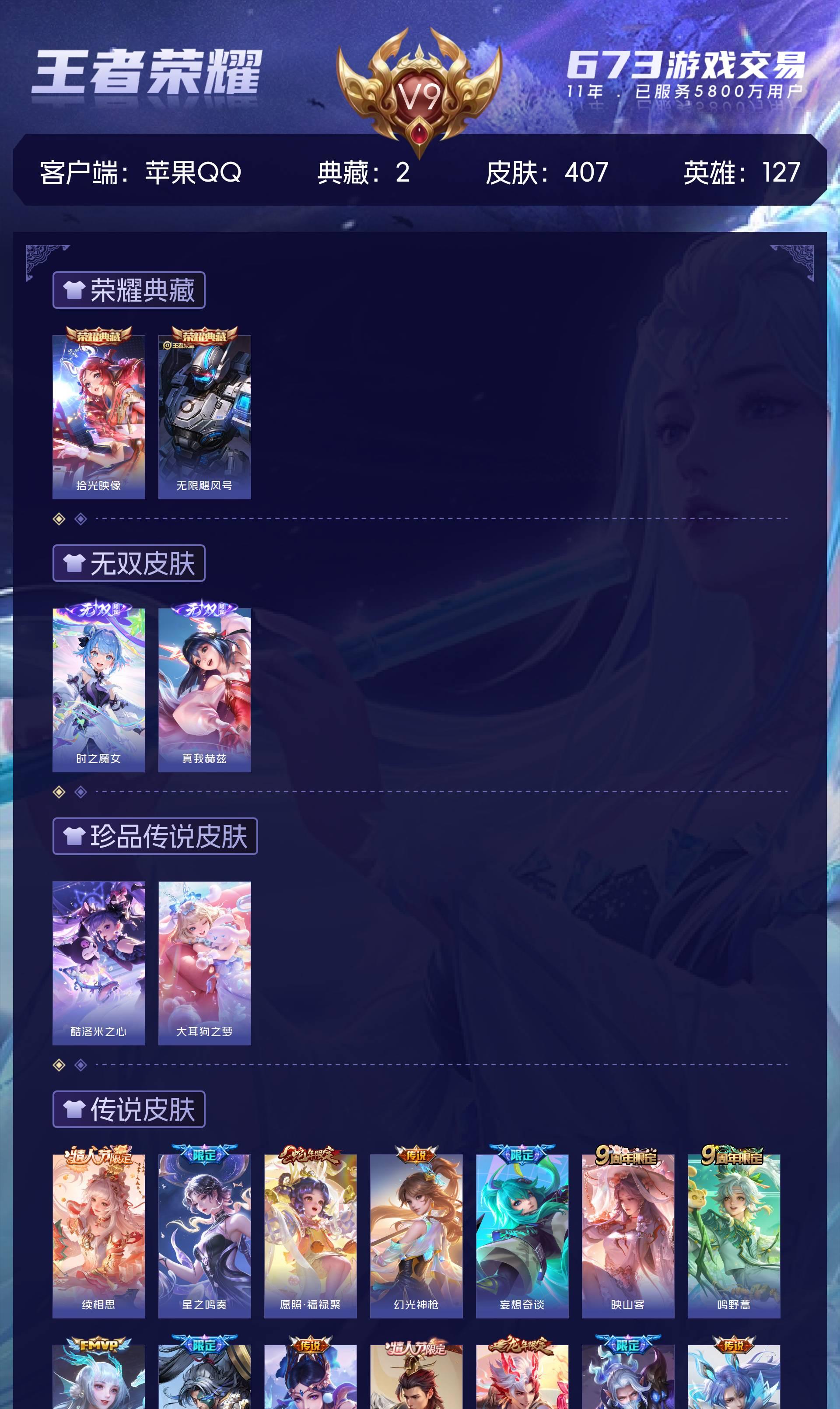 V9 皮肤407 英雄127 最强王者 荣耀典藏2 无双皮肤2 珍品传说2 传说22 其他皮肤383