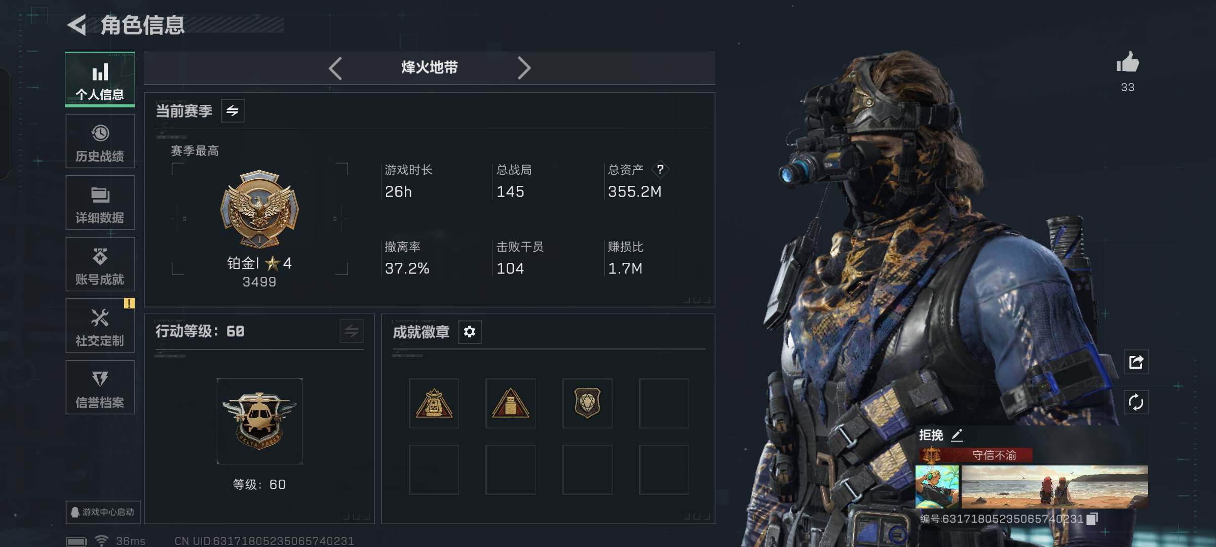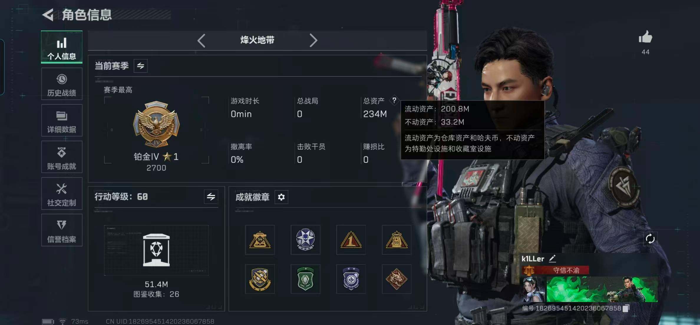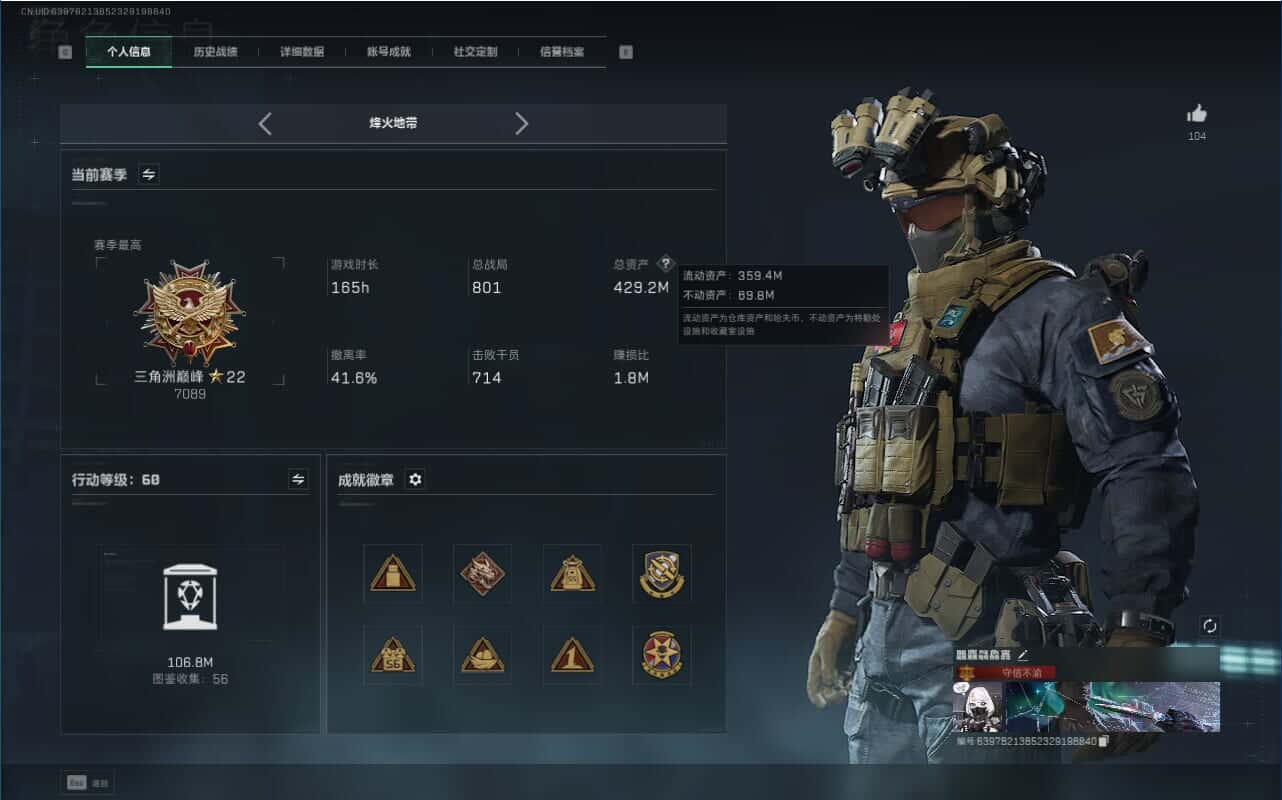 z76,黑海信条刀皮,骇爪红皮水墨云图夜鹰,总资产355.2M,部门全4级,9橙枪,天才少年,蚀金玫瑰差4发,多六甲,特勤快满级,仓库10级训练中心7级靶场7级