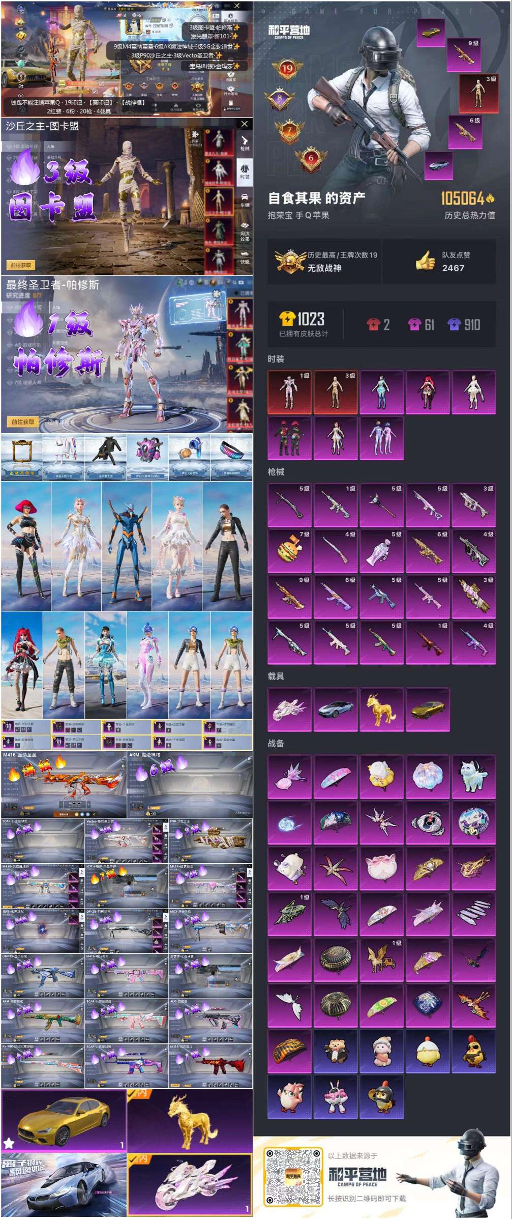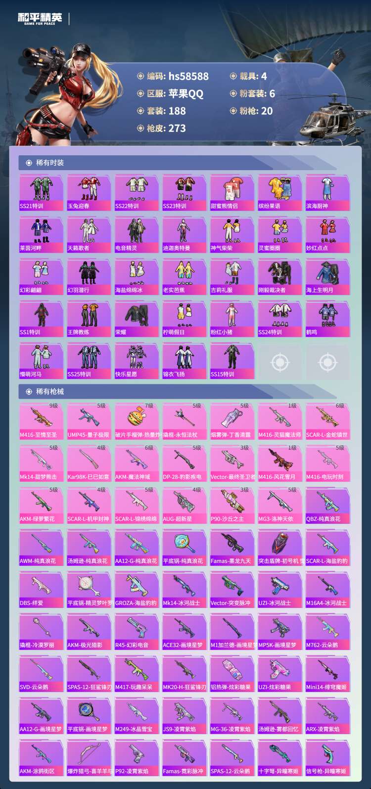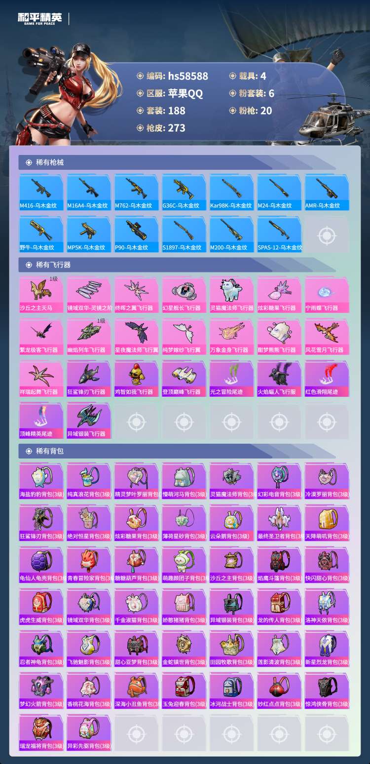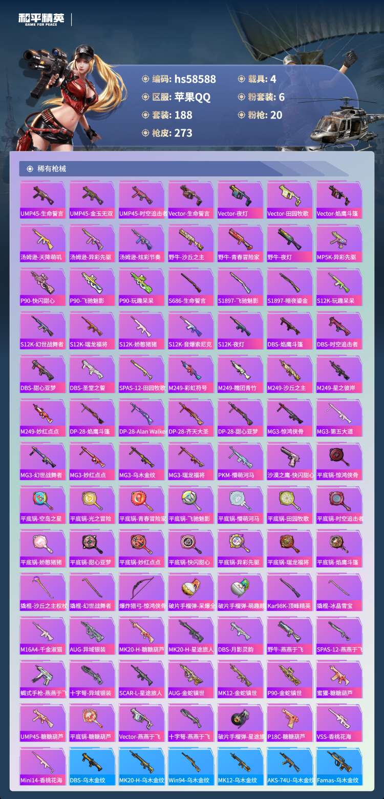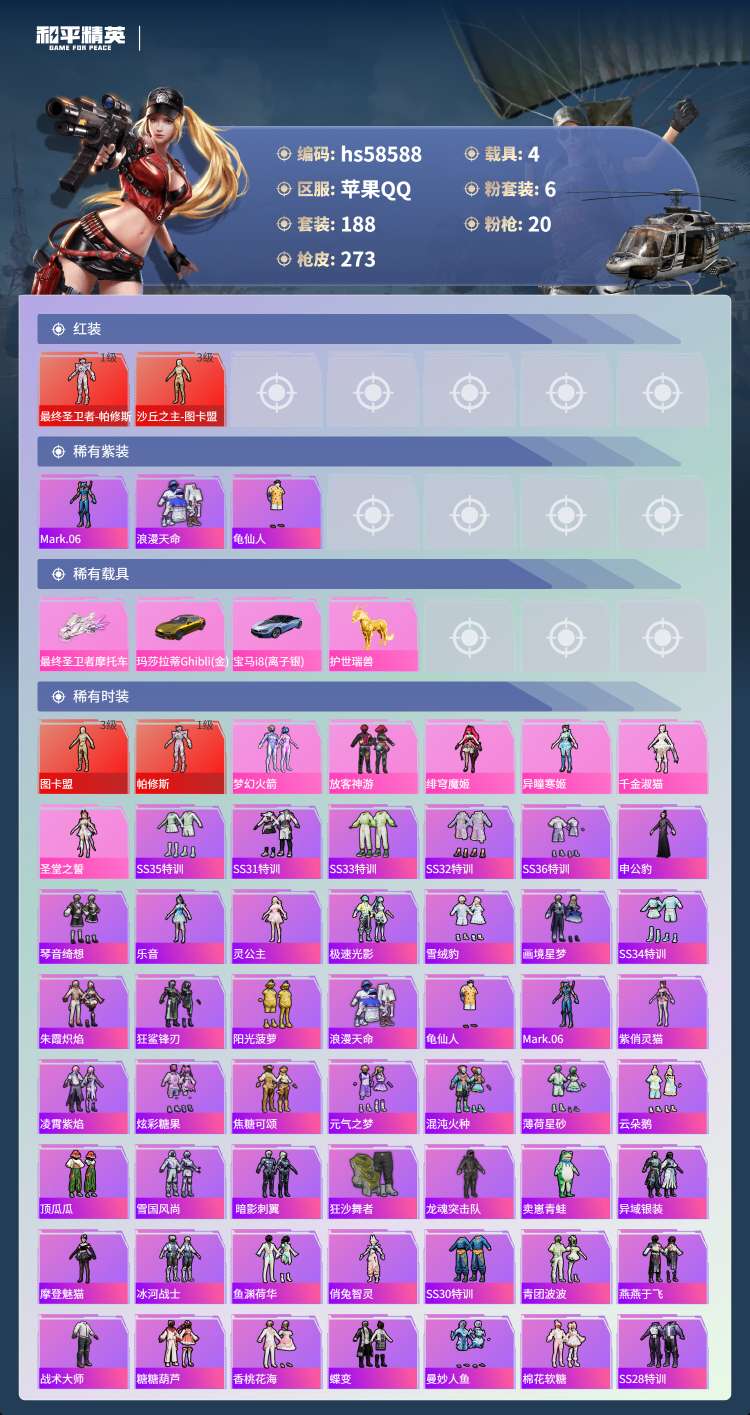 hs58588 苹果手Q-19王牌印记-有战神框-2红装-6粉装-20特效枪-4载具-105064热