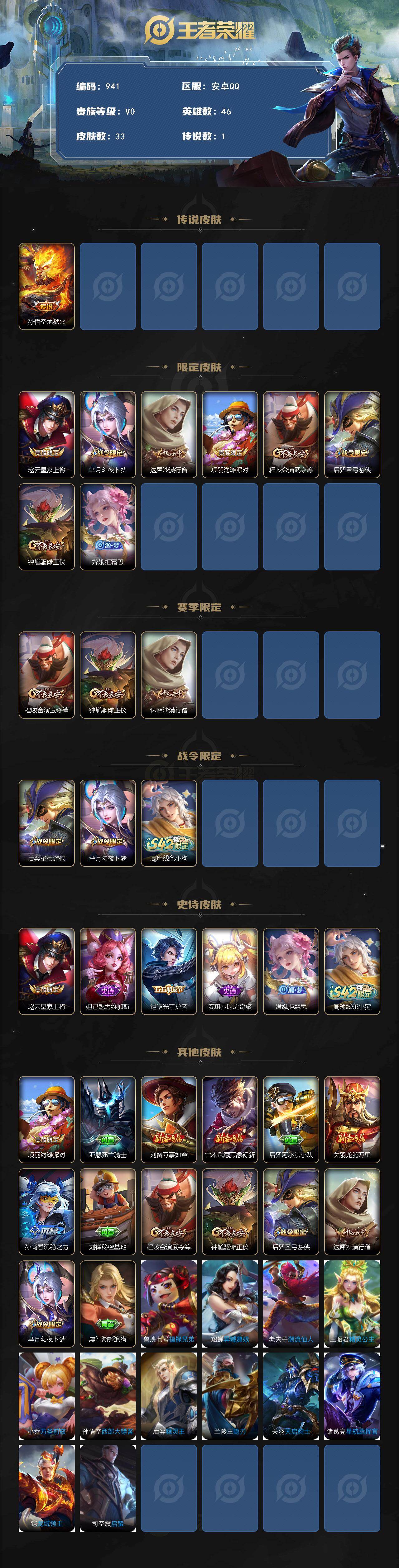2067740 王者荣耀账号 安卓Q-V0-尊贵铂金III段位-46英雄-33皮肤-1传说-5史诗