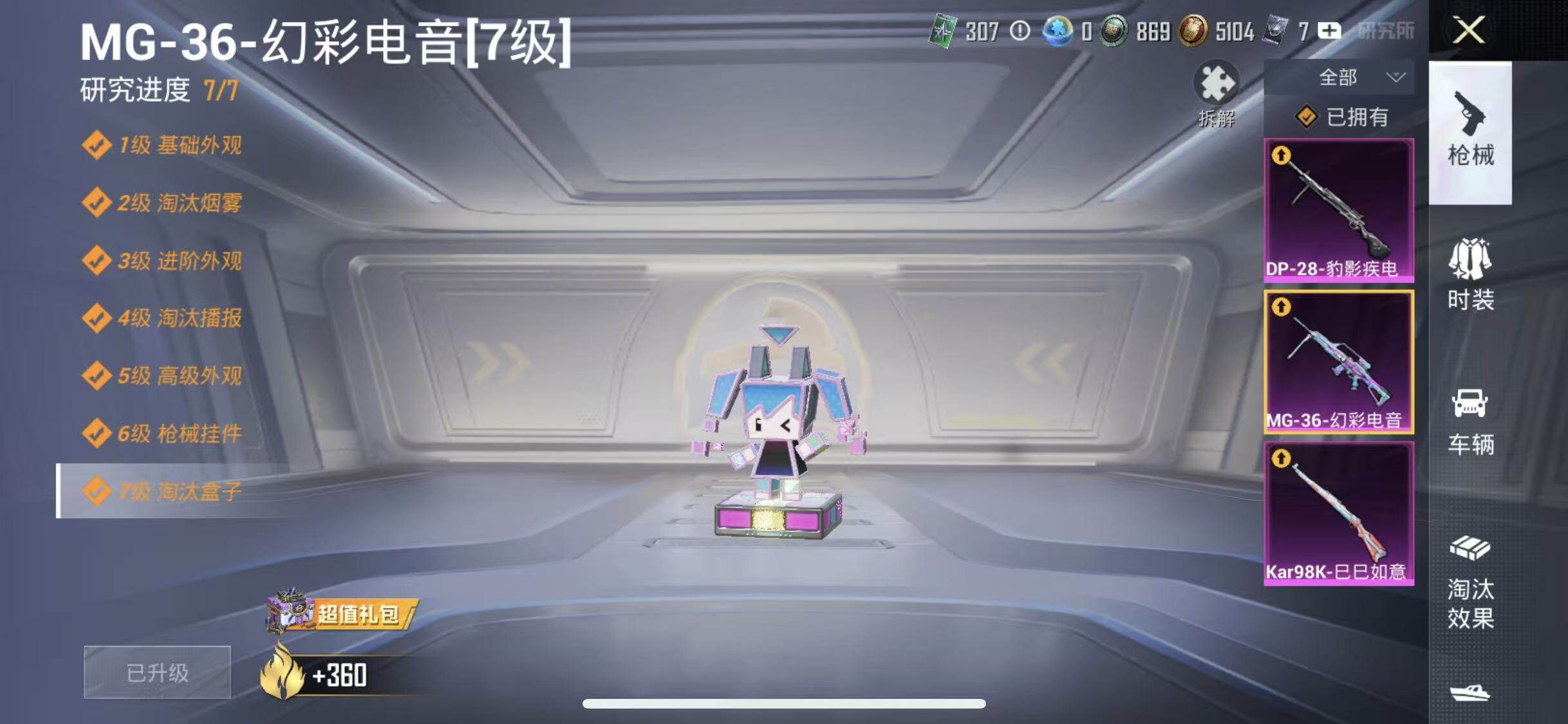 【粉色枪皮等级】:Kar98K-巳巳如意(五级),DP-28-豹影疾电(五级),MG-36-幻彩电音(七级)