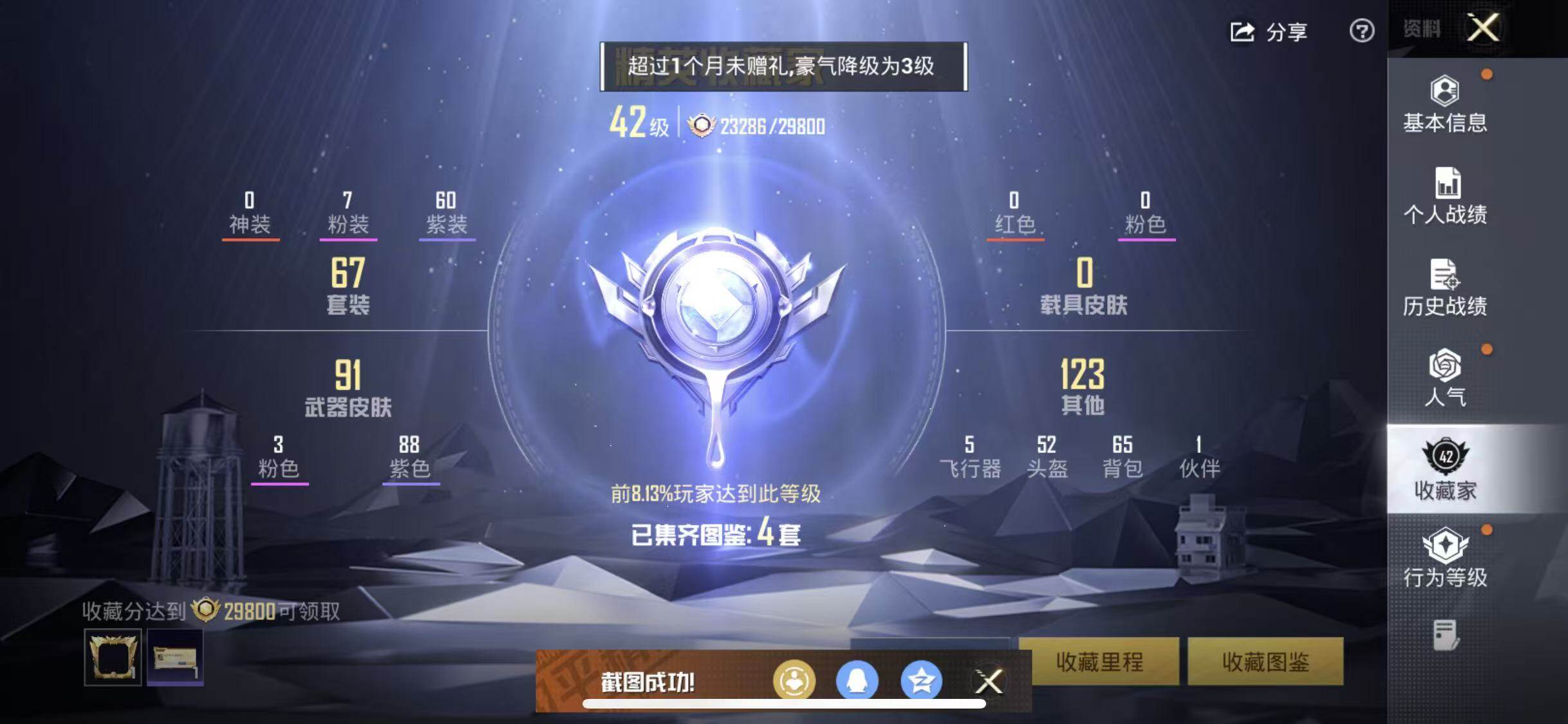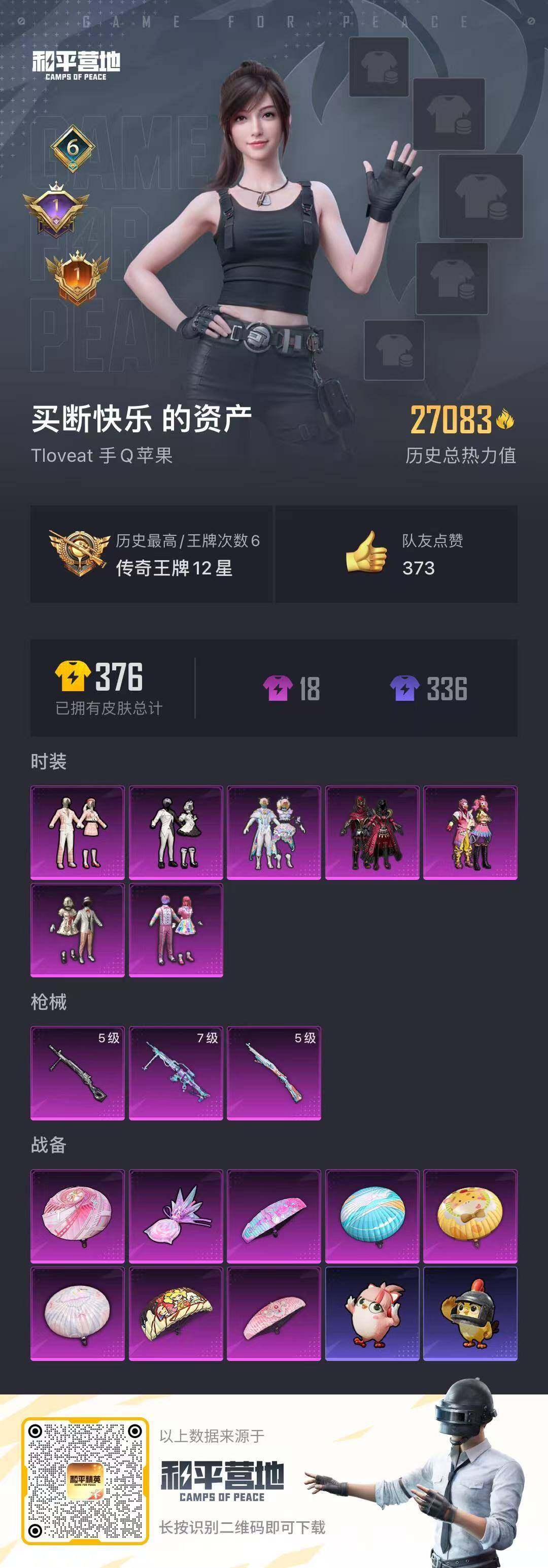 苹果 手Q-7粉装-3特效枪-0载具-1粉色飞行器-26903热力值-6王牌印记-67套装-98枪皮