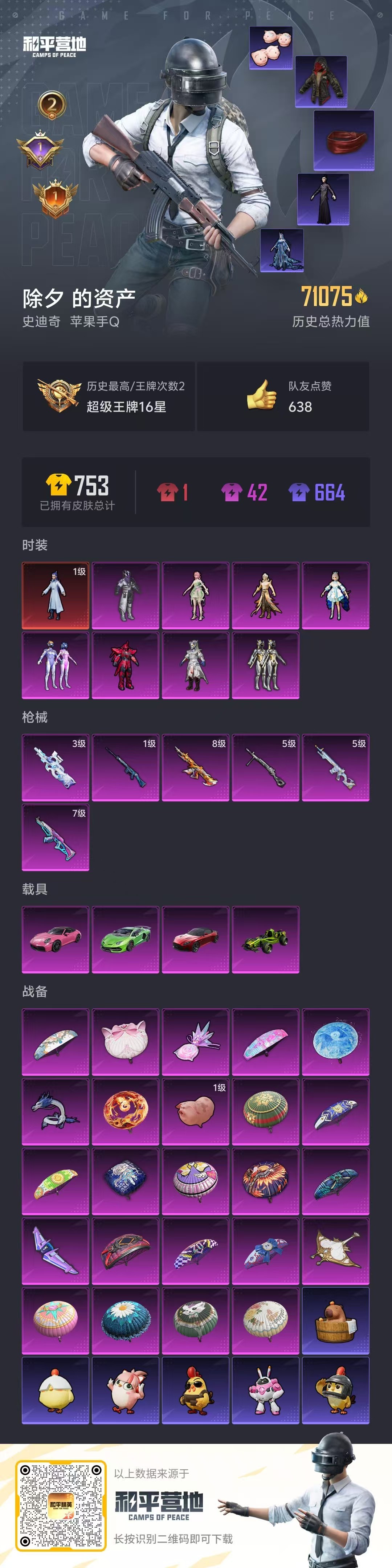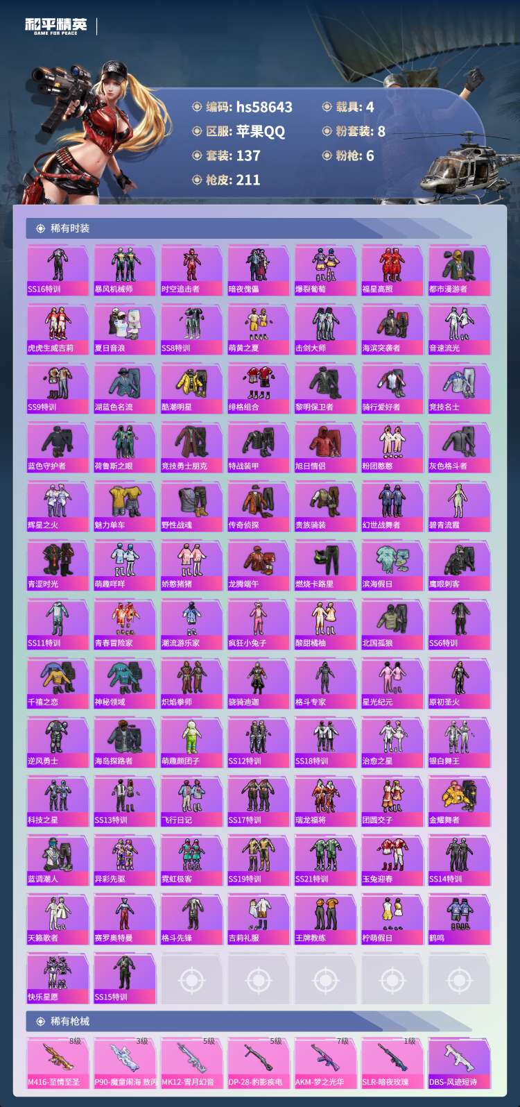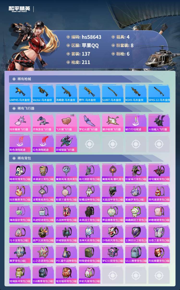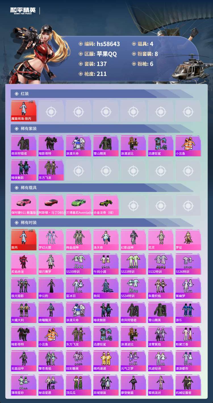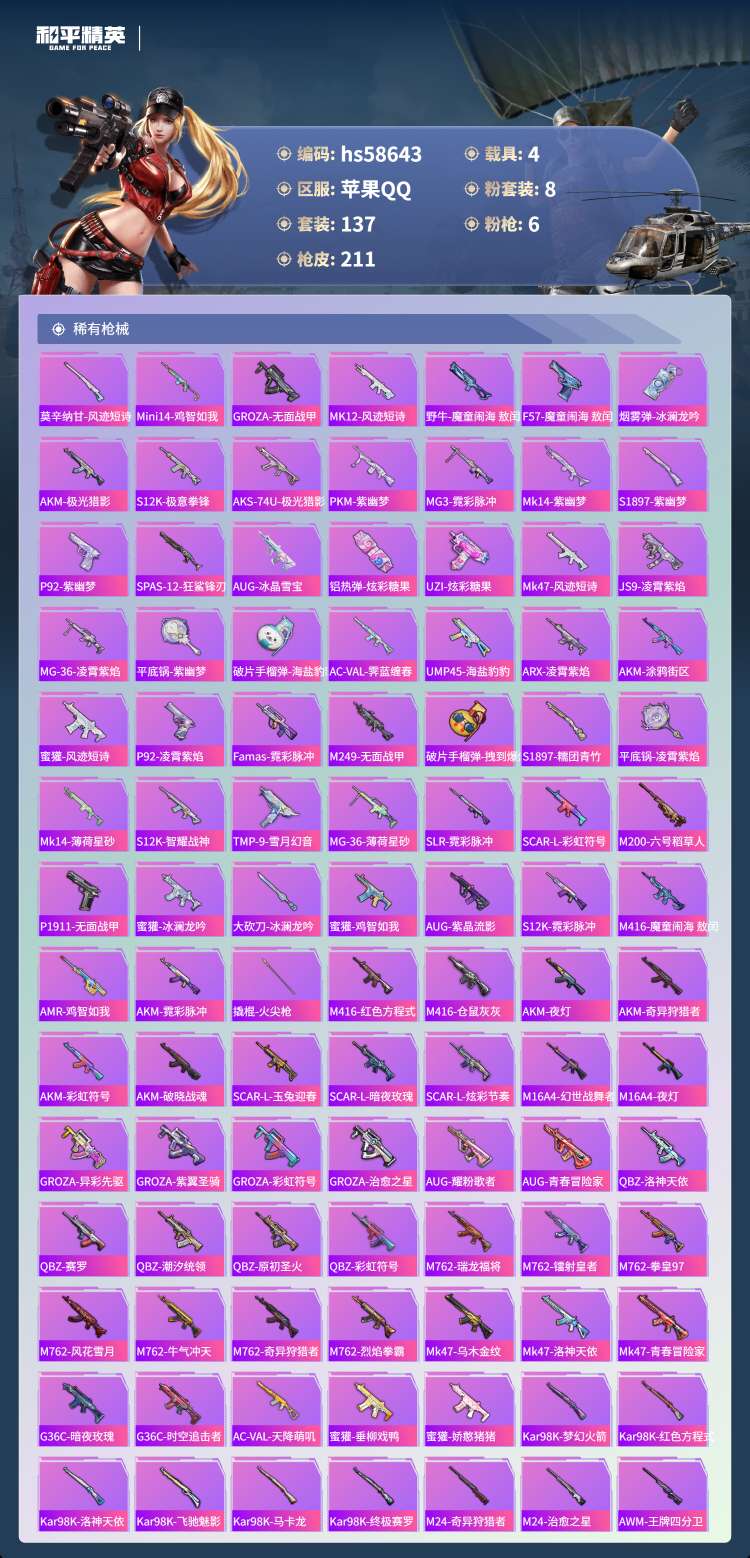 hs58643 苹果手Q-2王牌印记-1红装-8粉装-6特效枪-4载具-71075热力值-137套装