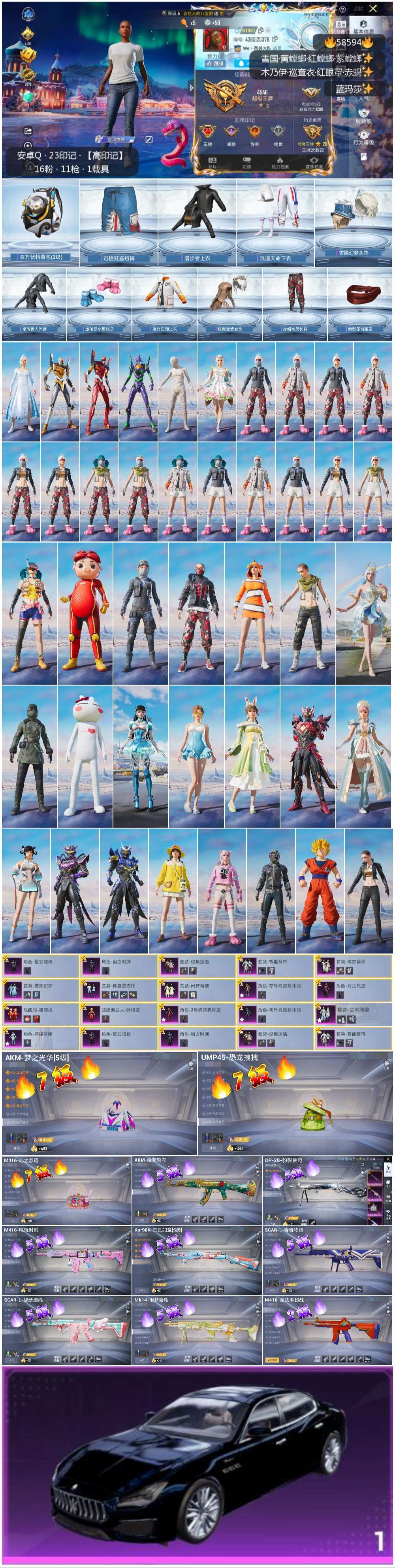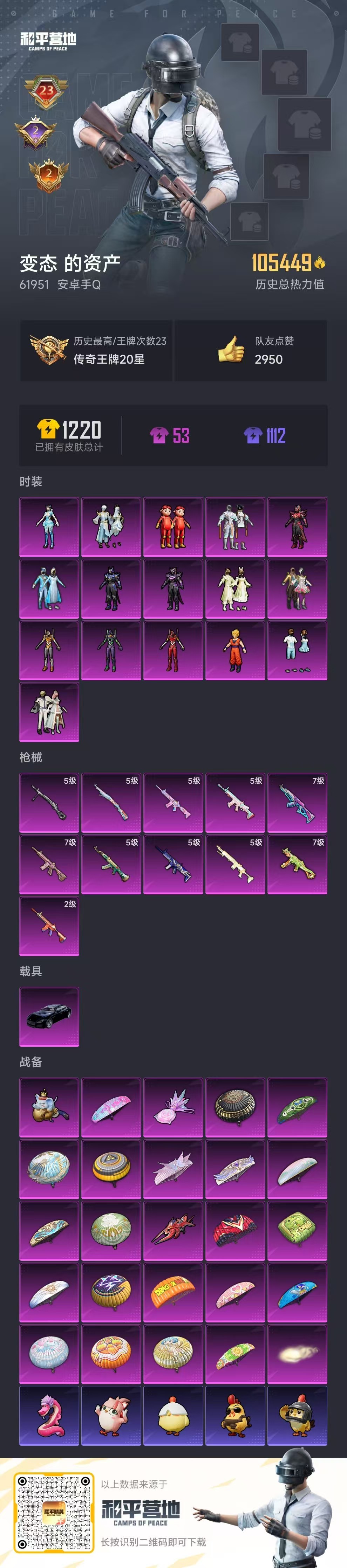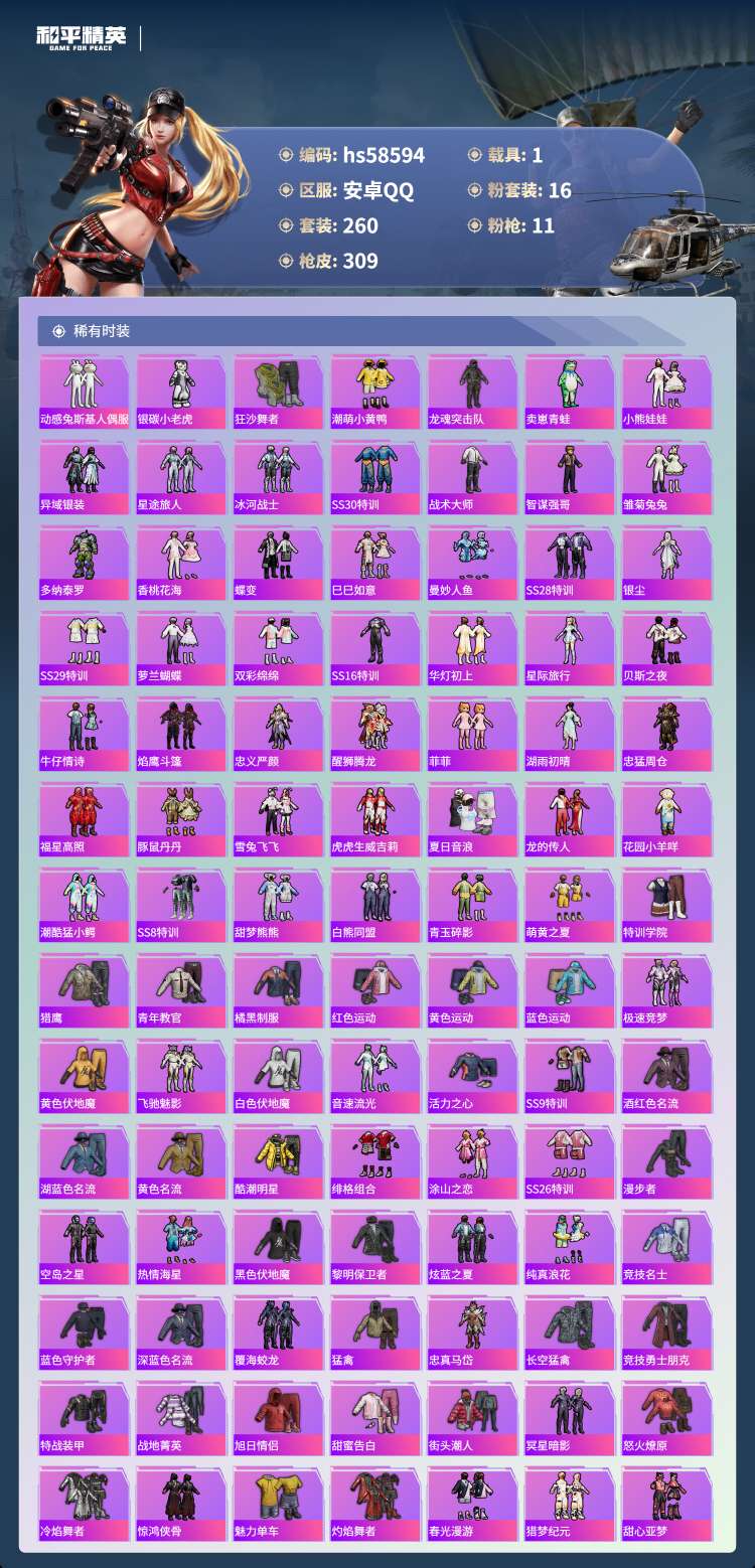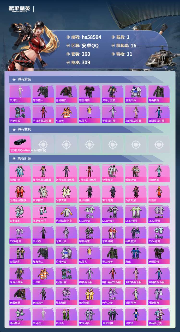 hs58594 安卓手Q-23王牌印记-16粉装-11特效枪-1载具-105449热力值-260套装
