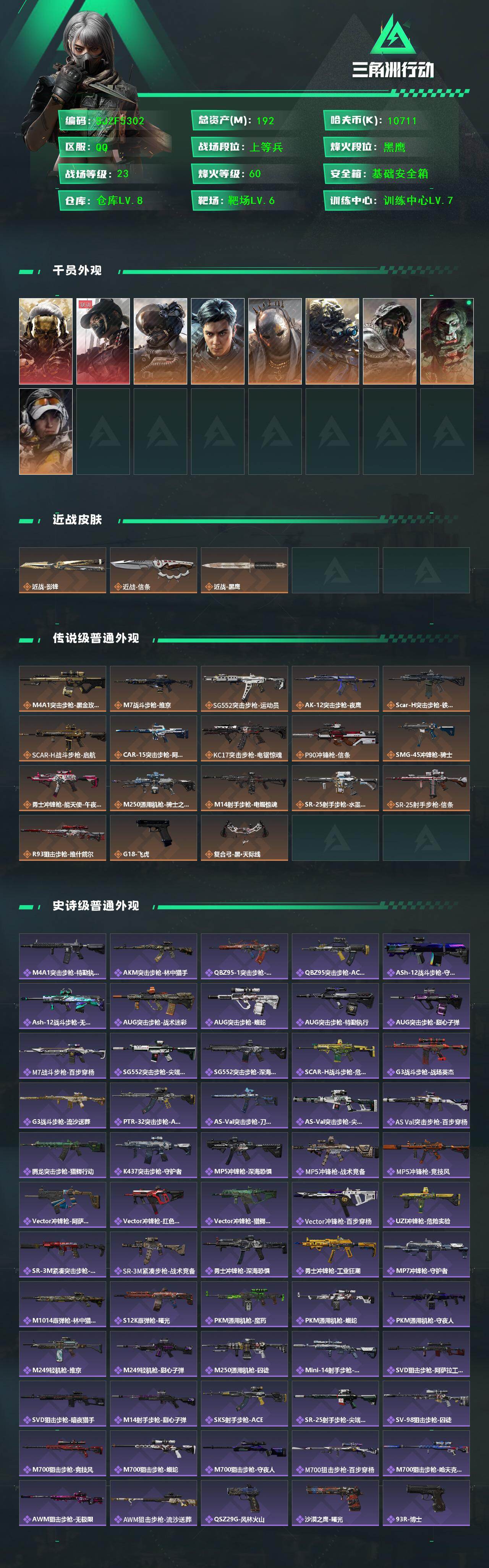 【SJZF5302】总资产(M):192M/哈夫币(K):10711K/哈夫币(K):10711K/传说枪皮数:18/全面战场等级:23_段位:上等兵/烽火地带等级:60_段位:黑鹰/红狼-蚀金玫瑰/露娜-黑·天际线/威龙-壮志凌云/威龙-飞虎/牧羊人-街头之王/无名-夜鹰/深蓝-不破誓约/红狼-电锯惊魂/露娜-金牌射手/近战-影锋/近战-信条/近战-黑鹰/M4A1突击步枪-蚀金玫瑰/M7战斗步枪-维京/SG552突击步枪-运动员/AK-12突击步枪-夜鹰/SCAR-H战斗步枪-铁艺苍穹/SCA