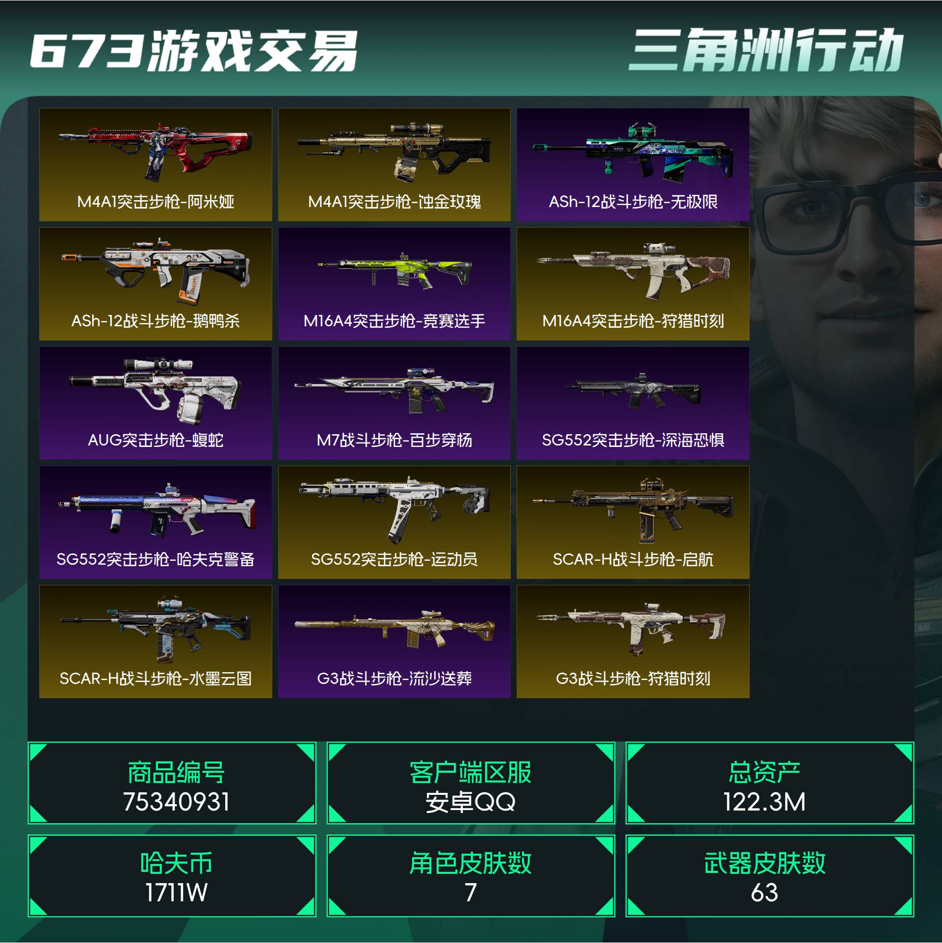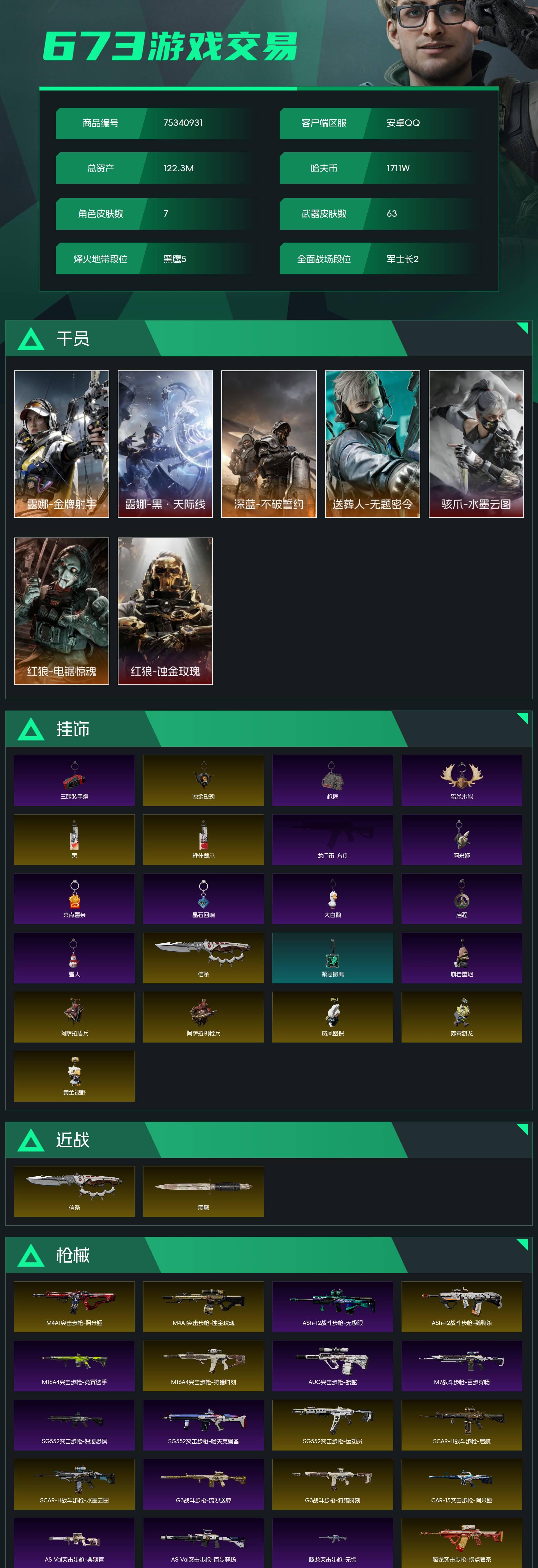 烽火段位黑鹰5 战场段位军士长2 总资产122.3M 哈夫币1711W 干员7 挂饰21 近战2 枪械63 载具41