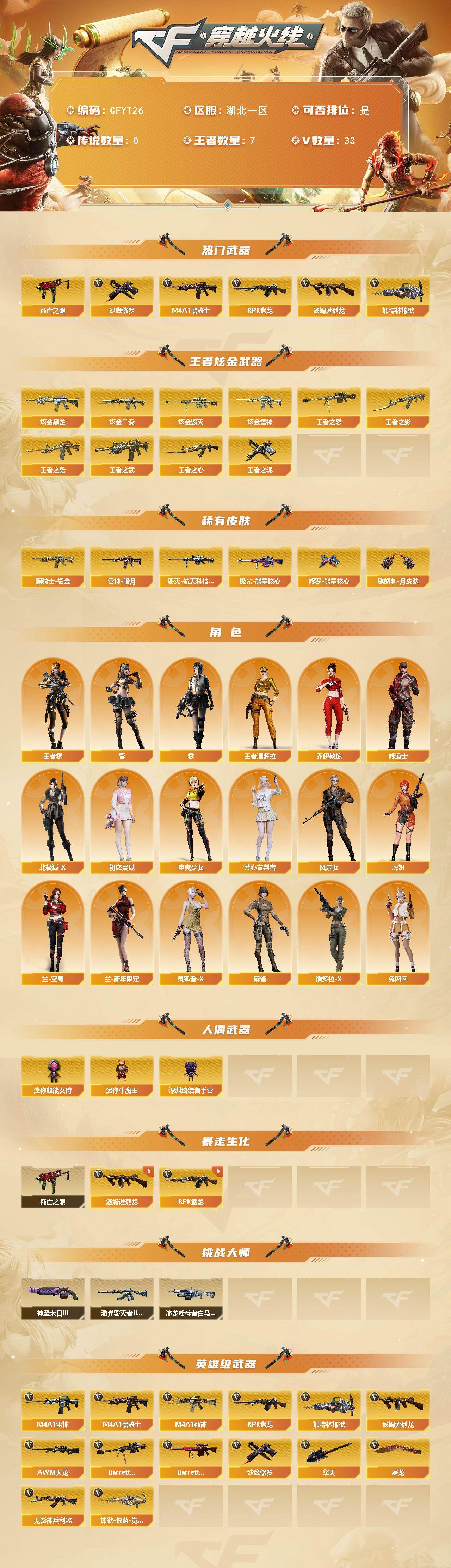 【CFYT26】31V/100级/元帅/7王者/5炫金/2英雄/死亡之眼/M4A1_黑骑士/汤姆逊烈龙/RPK_盘龙/加特林_炼狱/沙鹰_修罗/王者之势/王者之武/王者之影/王者之心/王者之怒/王者之魂/炫金黑龙/炫金千变/炫金雷神/炫金毁灭/雷神-暗月/毁灭-航天科技皮肤/黑骑士耀金皮肤/极光-能量核心/修罗-能量核心/麒麟刺-月皮肤/零/葵/王者-零/王者潘多拉/乔伊教练/修道士/北极狐-X/初恋灵狐/电竞少女/芳心审判者/风暴女/虎妞/兰-空鹰/兰-新年限定/灵狐者-X/麻雀/潘多拉-X/