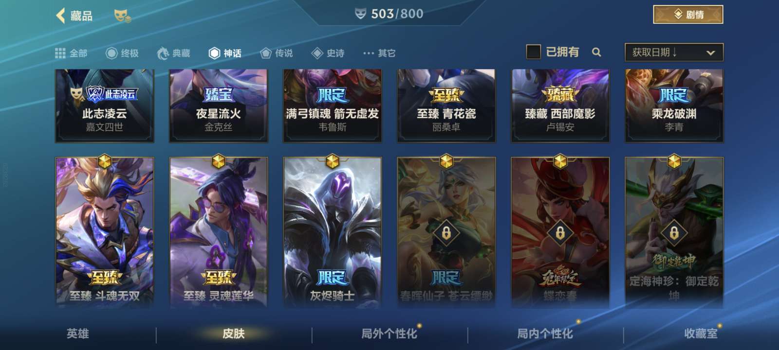 没时间玩了,大会员7级还有好多天,500多皮肤,59个传说,9个神话,还有1000原石,收藏快9万