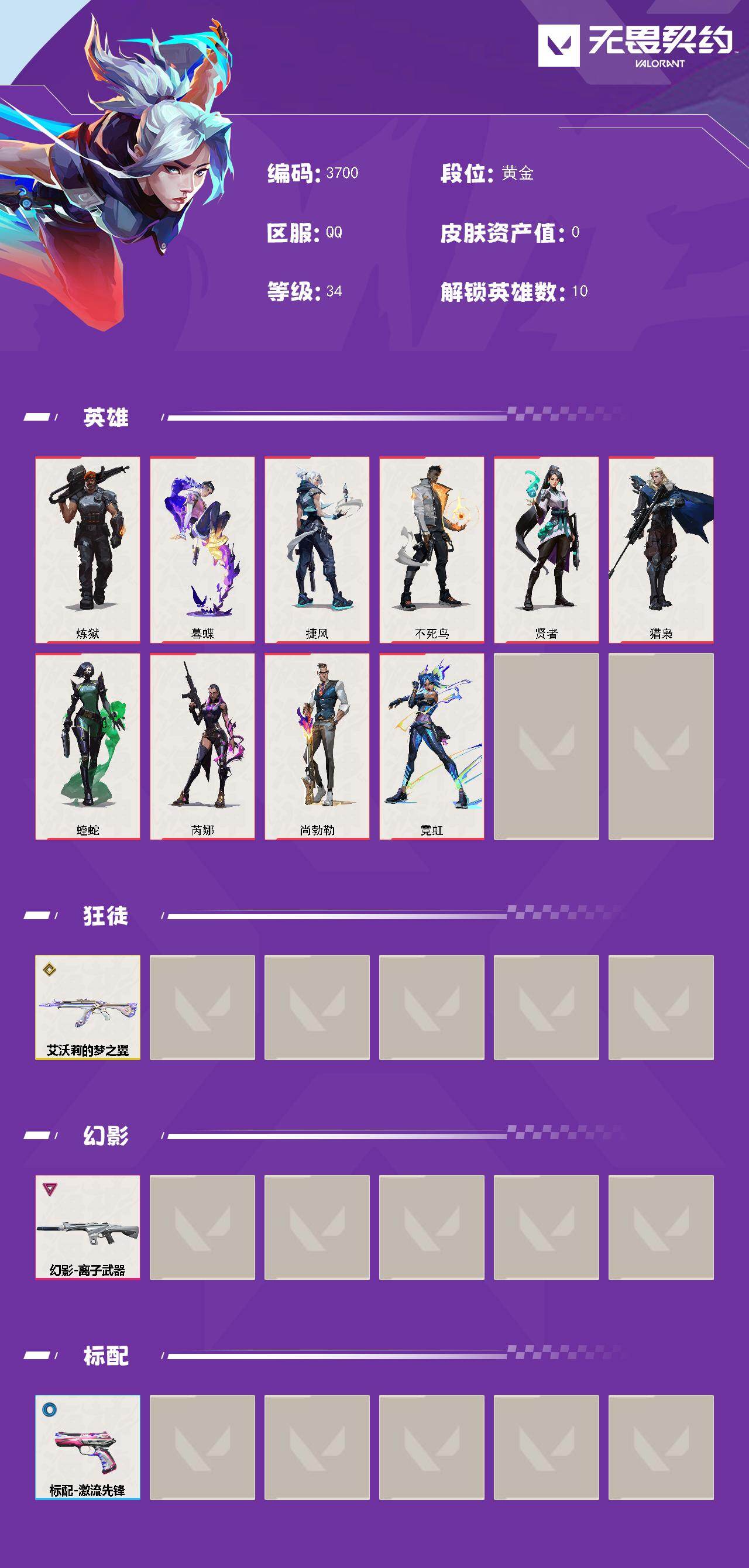 【英雄】:炼狱,暮蝶,捷风,不死鸟,贤者,猎枭,蝰蛇,芮娜,尚勃勒,霓虹【狂