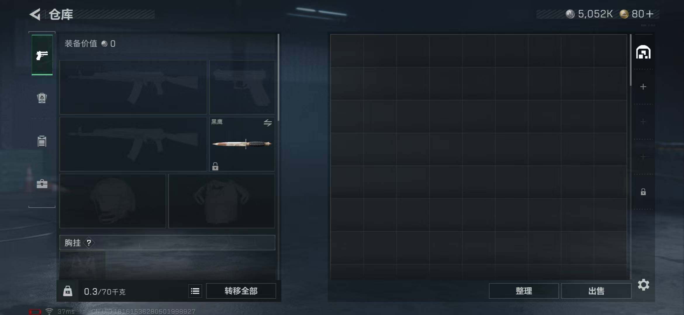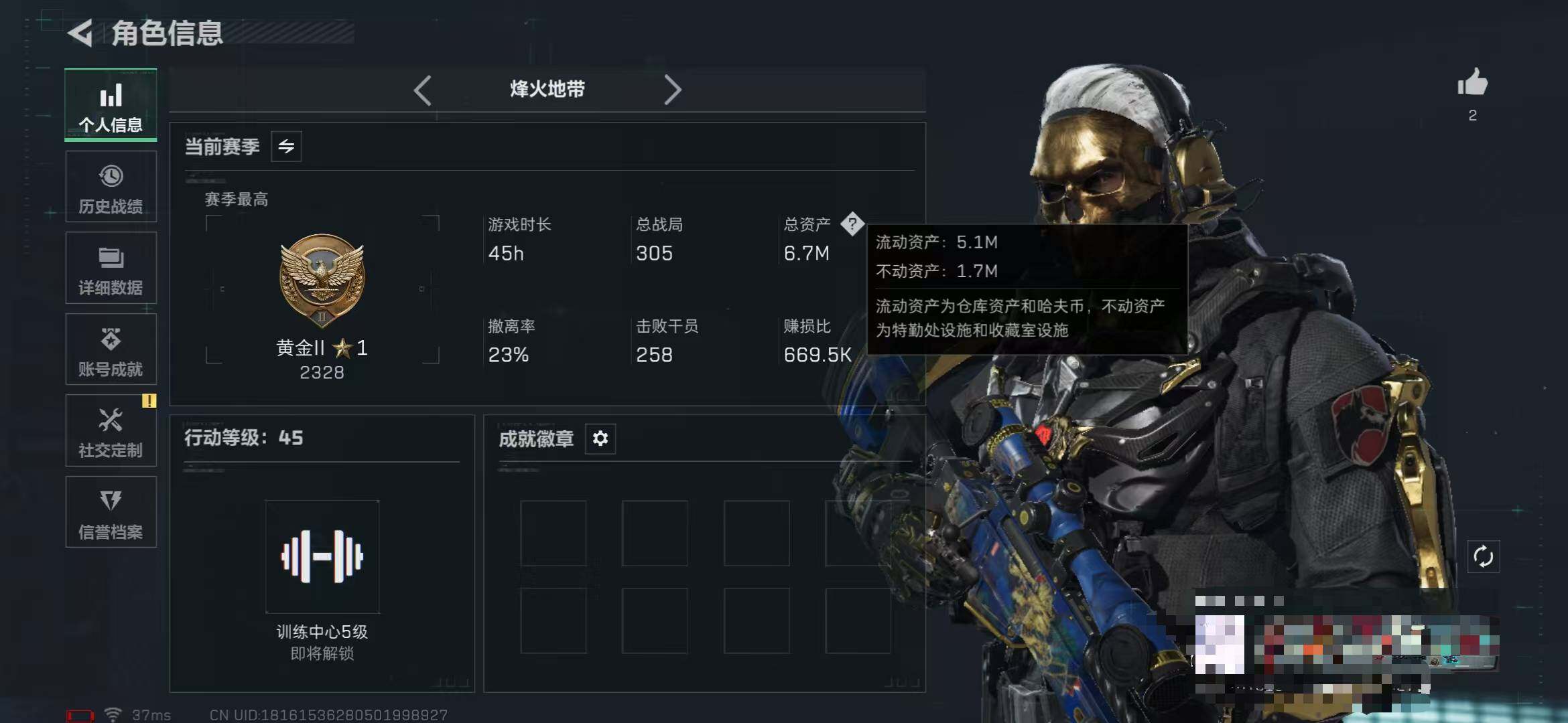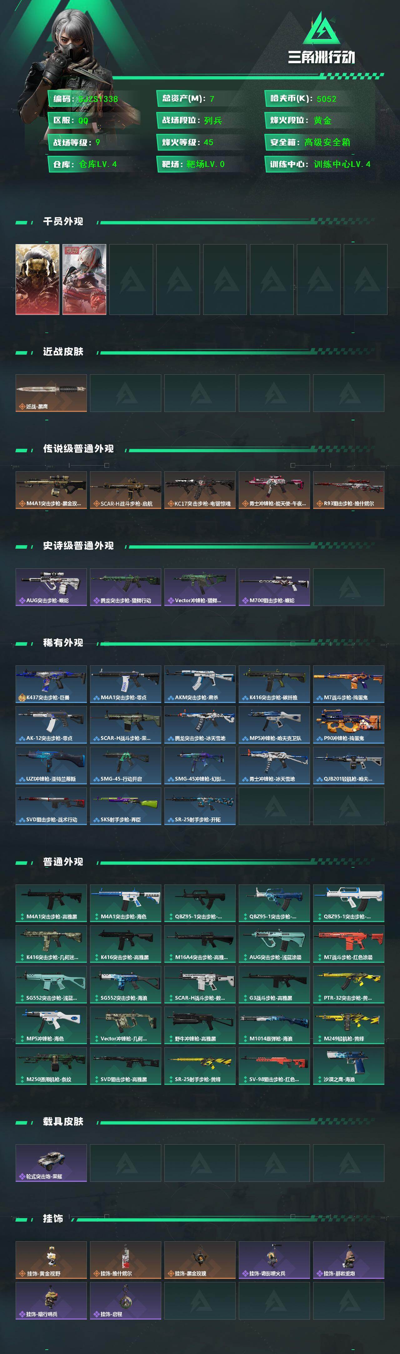总资产(M):7M/哈夫币(K):5052K/哈夫币(K):5052K/传说枪皮数:5/全面战场等级
