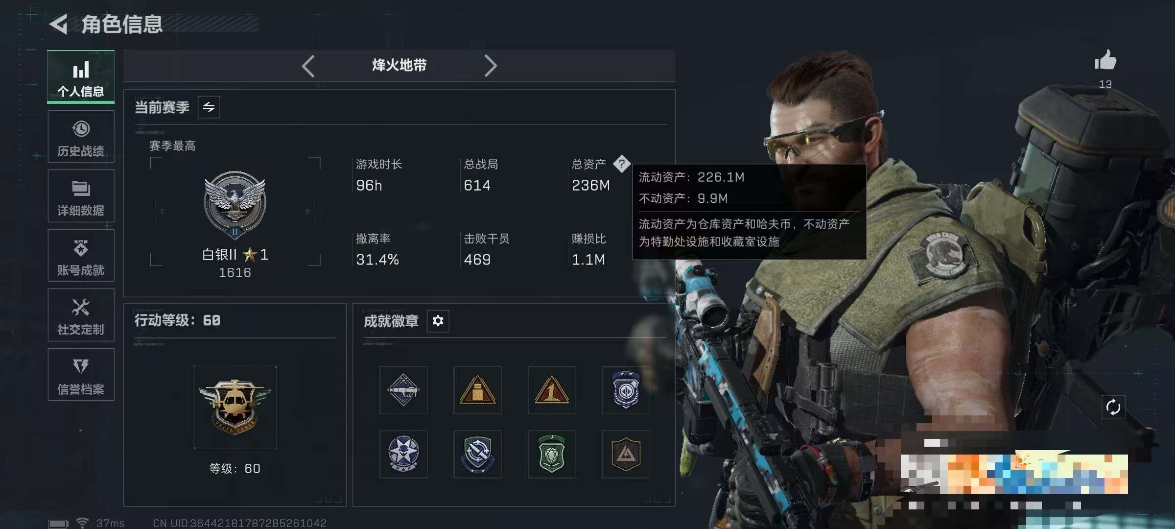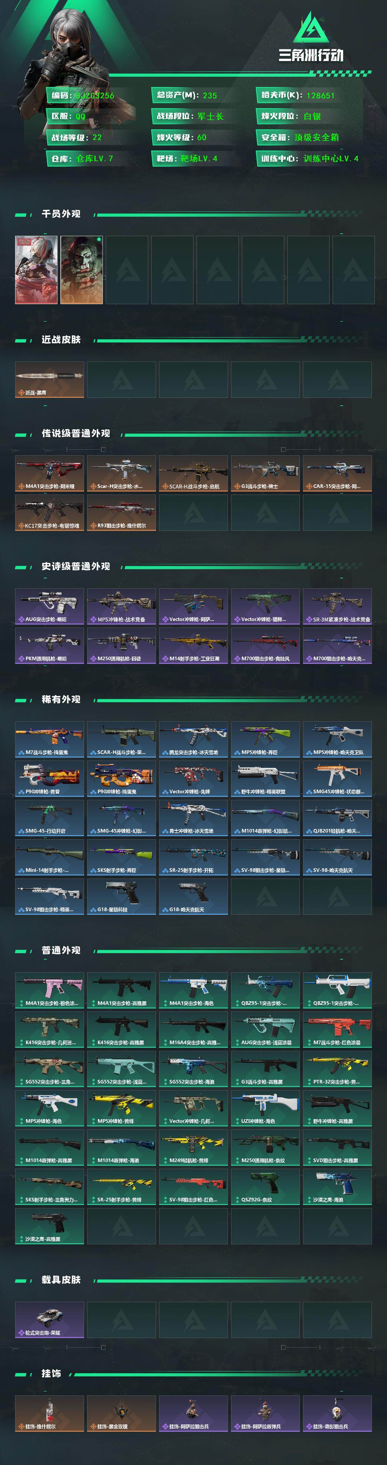 【SJZG3256】总资产(M):235M/哈夫币(K):128651K/哈夫币(K):128651K/传说枪皮数:7/全面战场等级:22_段位:军士长/烽火地带等级:60_段位:白银/骇爪-维什戴尔/红狼-电锯惊魂/近战-黑鹰/M4A1突击步枪-阿米娅/SCAR-H战斗步枪-水墨云图/SCAR-H战斗步枪-启航/G3战斗步枪-骑士/CAR-15突击步枪-阿米娅/KC17突击步枪-电锯惊魂/R93狙击步枪-维什戴尔/AUG突击步枪-蝮蛇/MP5冲锋枪-战术竞备/Vector冲锋枪-阿萨拉文明/V