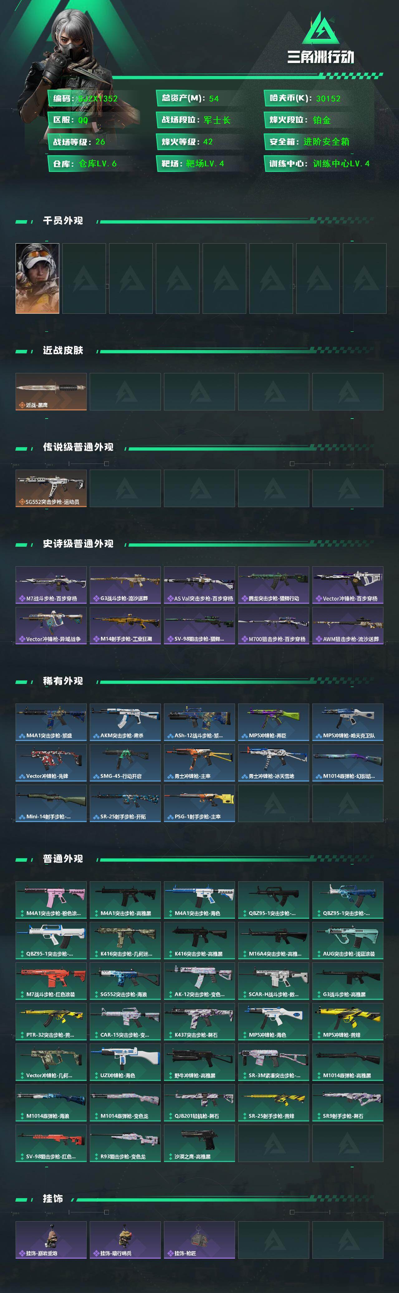 【SJZX1352】总资产(M):54M/哈夫币(K):30152K/哈夫币(K):30152K/传说枪皮数:1/全面战场等级:26_段位:军士长/烽火地带等级:42_段位:铂金/露娜-金牌射手/近战-黑鹰/SG552突击步枪-运动员/M7战斗步枪-百步穿杨/G3战斗步枪-流沙送葬/AS Val突击步枪-百步穿杨/腾龙突击步枪-猎鳄行动/Vector冲锋枪-百步穿杨/Vector冲锋枪-异域战争/M14射手步枪-工业狂潮/SV-98狙击步枪-猎鳄行动/M700狙击步枪-百步穿杨/AWM狙击步枪-