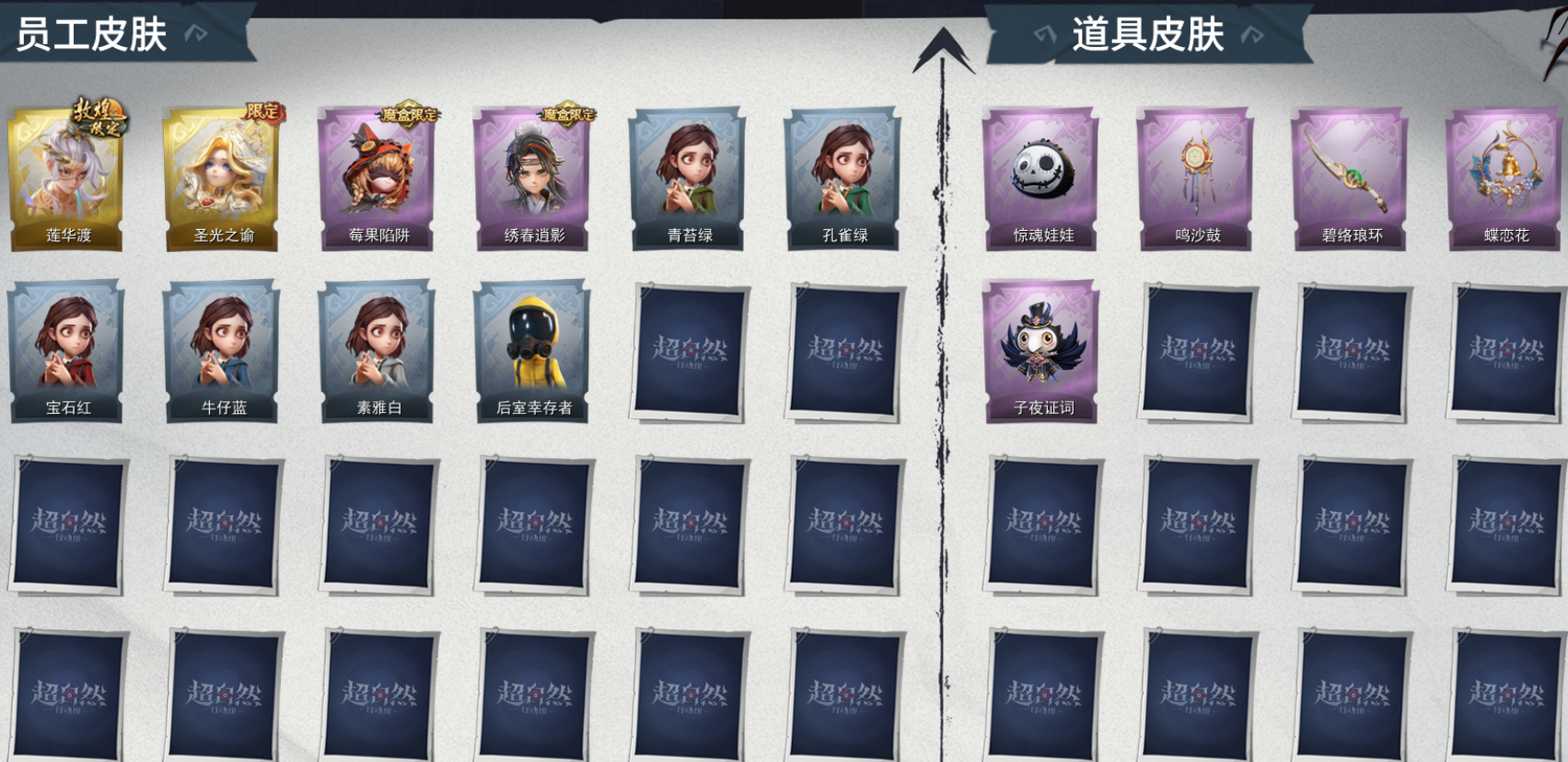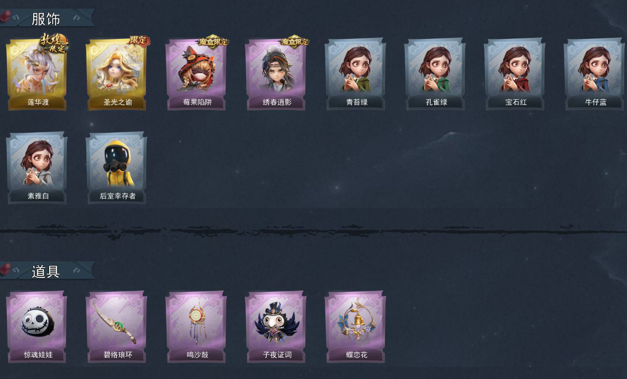 ZR232,金皮:2,紫皮:2,道具皮:5,铲铲币:3w,累充:300金砖,服装:逍遥-莲华渡、薇薇安-圣光之谕、莉莉-莓果陷阱、逍遥-绣春逍影,员工:小黄、爱丽丝、零、逍遥、薇薇安、莉莉,赛季魔盒:普通魔盒,头饰:惊魂南瓜头套、鱼头怪头套、烈焰红唇头套、大葱明头套、火爆了头套、面具马头套、哈士奇头套、萨卡班甲鱼头套、嘻嘻头套、滑稽头套、呆滞头套、卑微头套、小狗蛇点点头套、像素朋克墨镜、后室幸存者