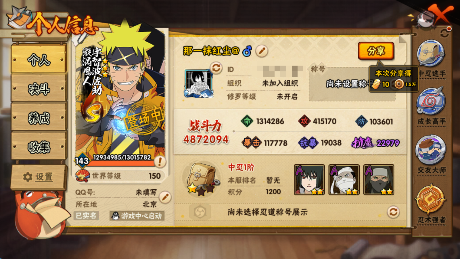 487W战力三雷子破面秽土斑6S+漂泊再不斩妖怪纲手2个19