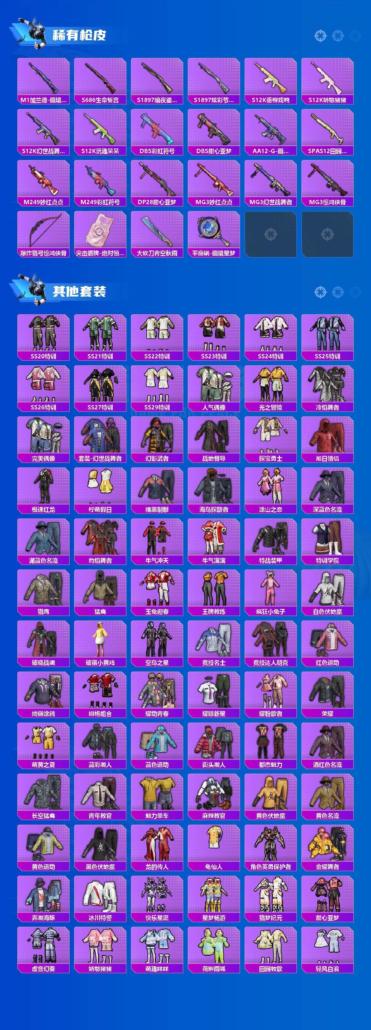 【粉色枪皮等级】:Vector-环太平洋(四级),Kar98K-巳巳如意(五级),M249-绝对恒星(七级),DP-28-豹影疾电(五级)