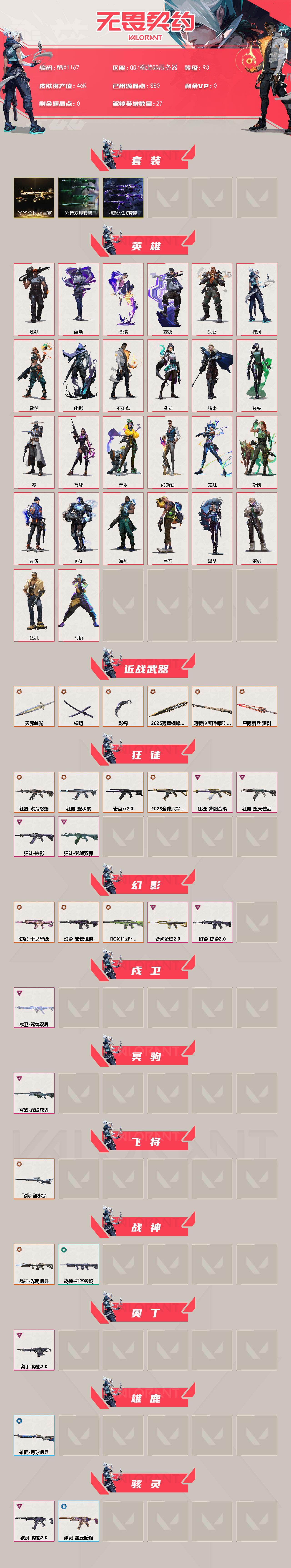 【WWX1167】终极*18/卓越*12/皮肤*71/等级*93/段位:未定级/2025全球冠军赛套装/咒缚双界套装/掠影//2.0套装/幻棱/炼狱/维斯/暮蝶/钛狐/壹决/铁臂/捷风/雷兹/幽影/不死鸟/贤者/猎枭/蝰蛇/零/芮娜/奇乐/尚勃勒/霓虹/斯凯/夜露/K/O/海神/盖可/黑梦/钢锁/近战武器-2025全球冠军赛 蝴蝶刀/近战武器-影钩/近战武器-镭切/近战武器-天界荣光/近战武器-阿特拉斯指挥部 甩棍/近战武器-星际猎兵 短剑/狂徒-2025全球冠军赛/狂徒-洪荒怒焰/狂徒-奇点/
