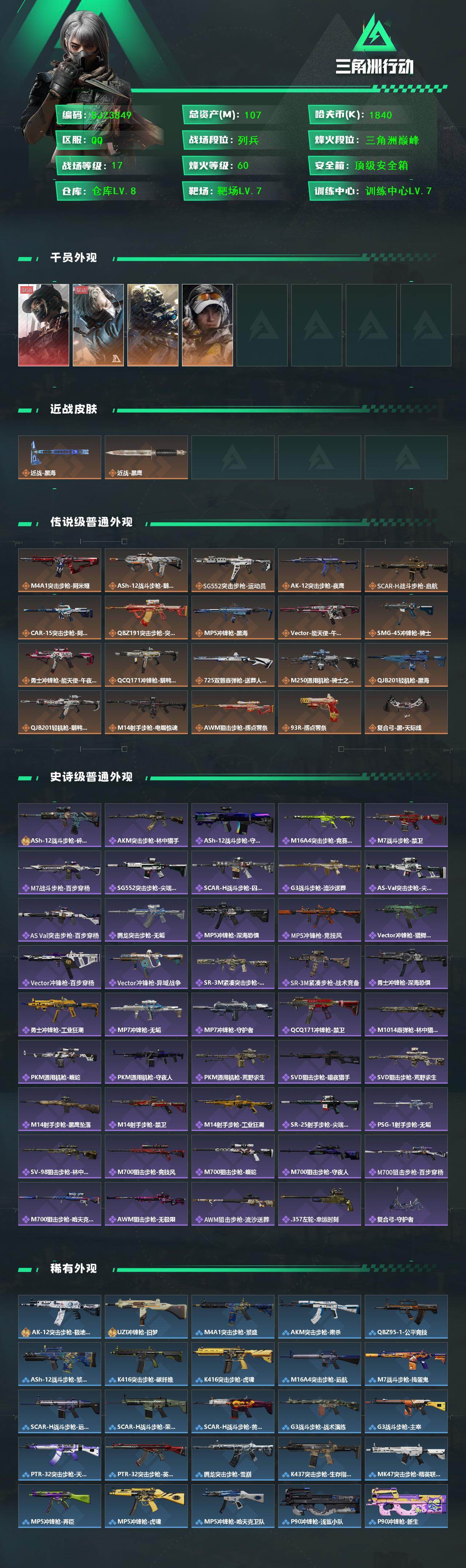 【SJZ3849】总资产(M):107M/哈夫币(K):1840K/哈夫币(K):1840K/传说枪皮数:20/全面战场等级:17_段位:列兵/烽火地带等级:60_段位:三角洲巅峰/露娜-黑·天际线/蜂医-送葬人·无题密令/无名-夜鹰/露娜-金牌射手/近战-黑海/近战-黑鹰/M4A1突击步枪-阿米娅/ASh-12战斗步枪-鹅鸭杀/SG552突击步枪-运动员/AK-12突击步枪-夜鹰/SCAR-H战斗步枪-启航/CAR-15突击步枪-阿米娅/腾龙突击步枪-捞点薯条/MP5冲锋枪-黑海/Vector