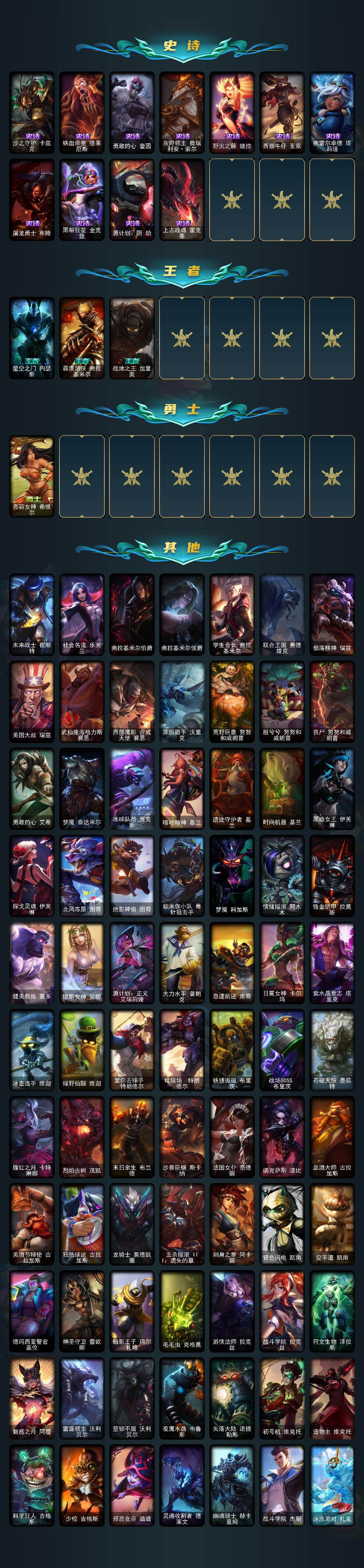 172英雄/171皮肤/5神话/17限定/1臻彩/23炫彩/18传说/46史诗