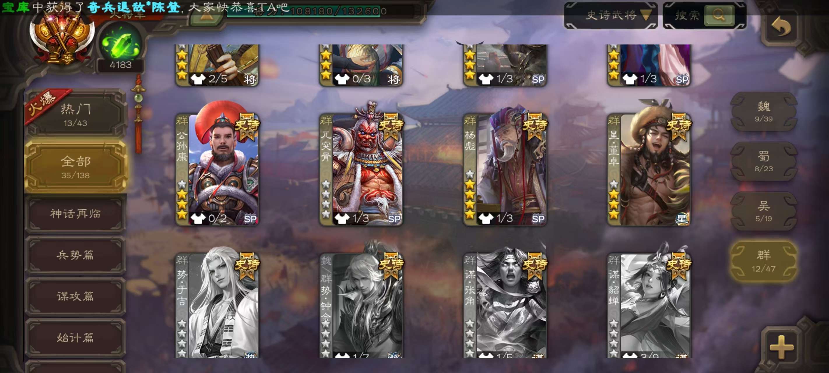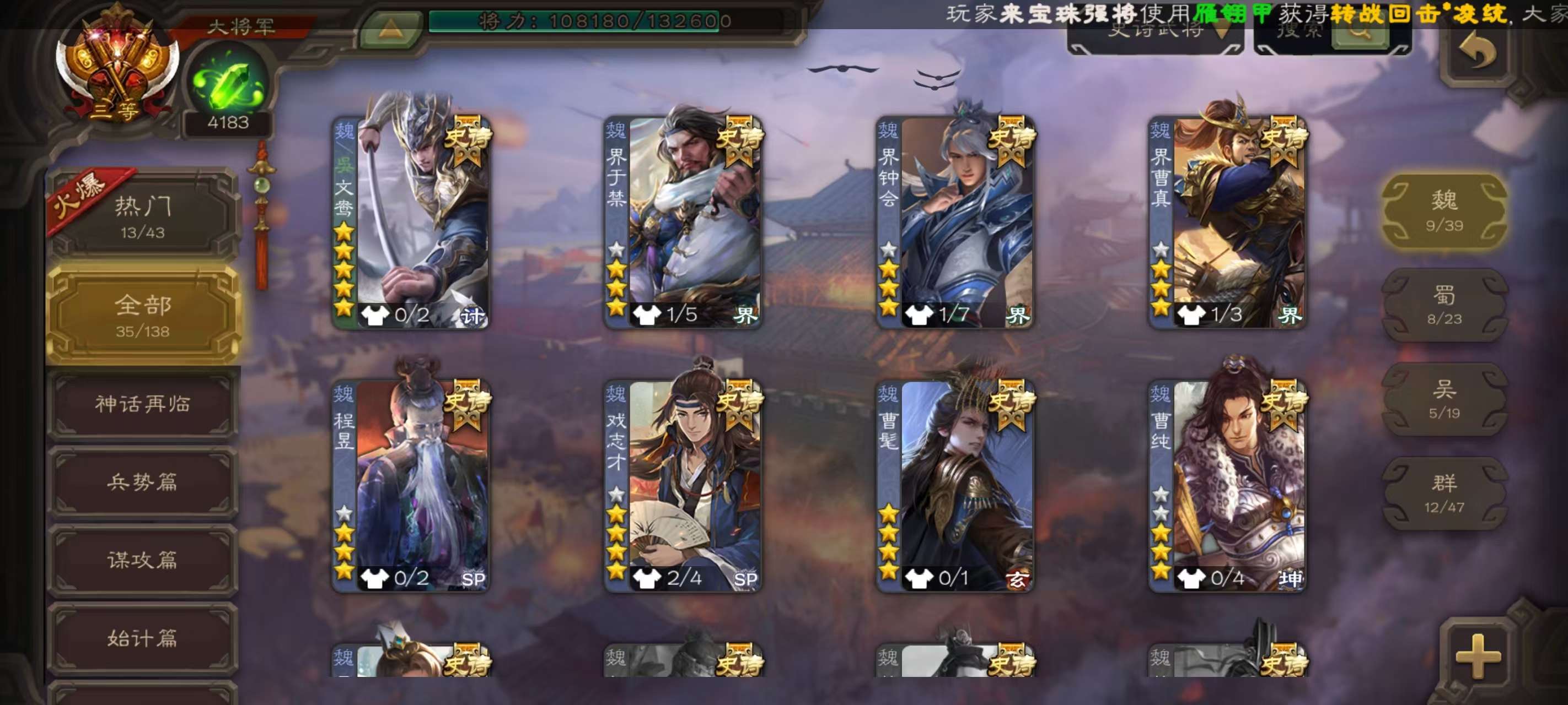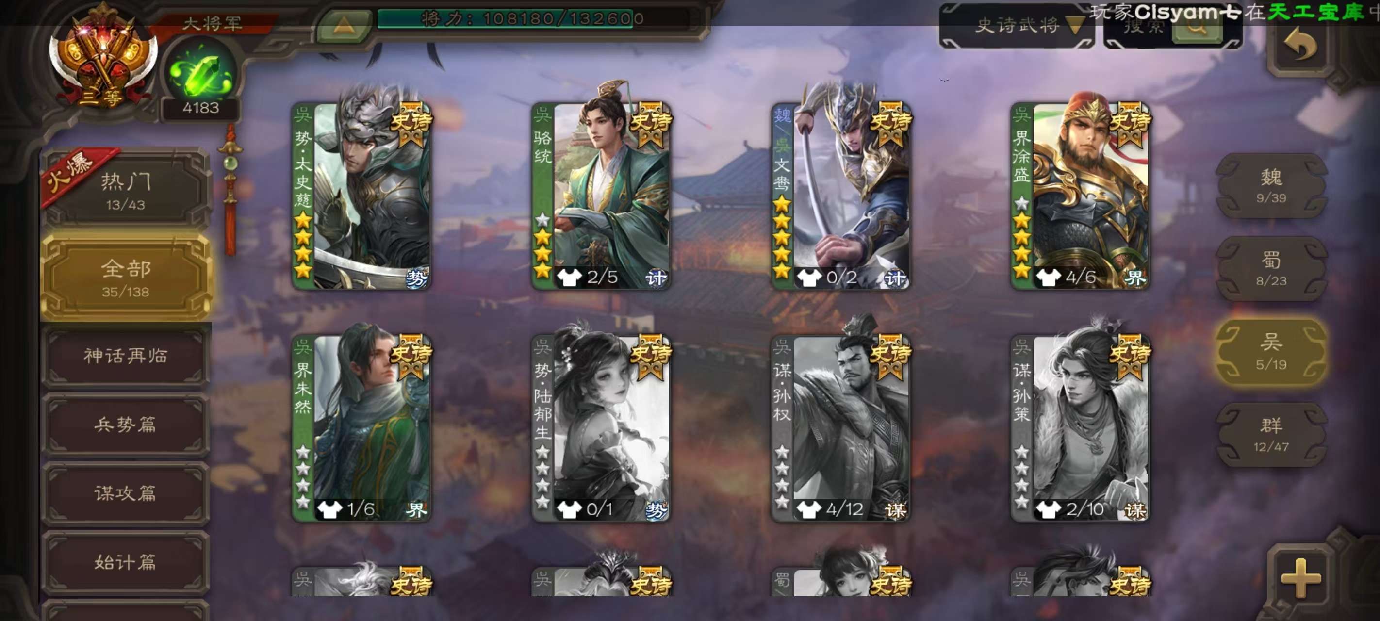 V6,三等大将军,35史诗武将,19动皮,史诗宝珠:64,武将:曹髦,势太史慈,文鸯,界徐盛(动),