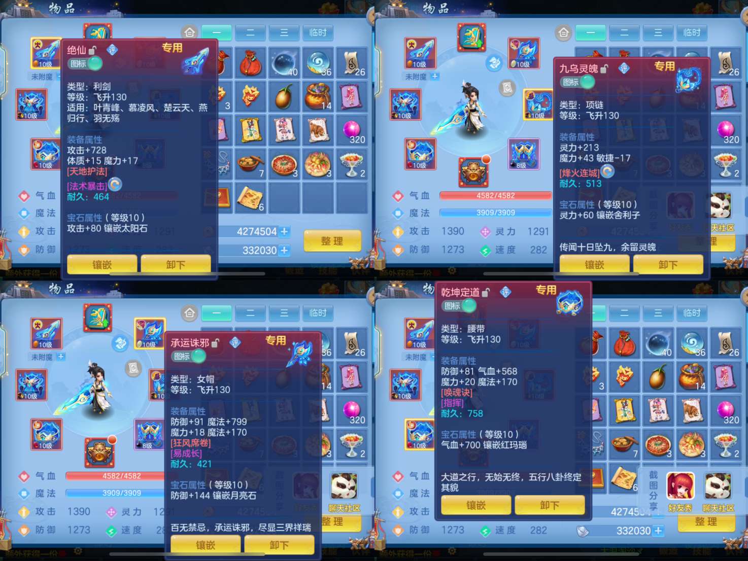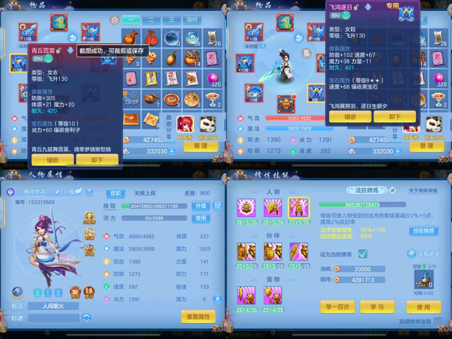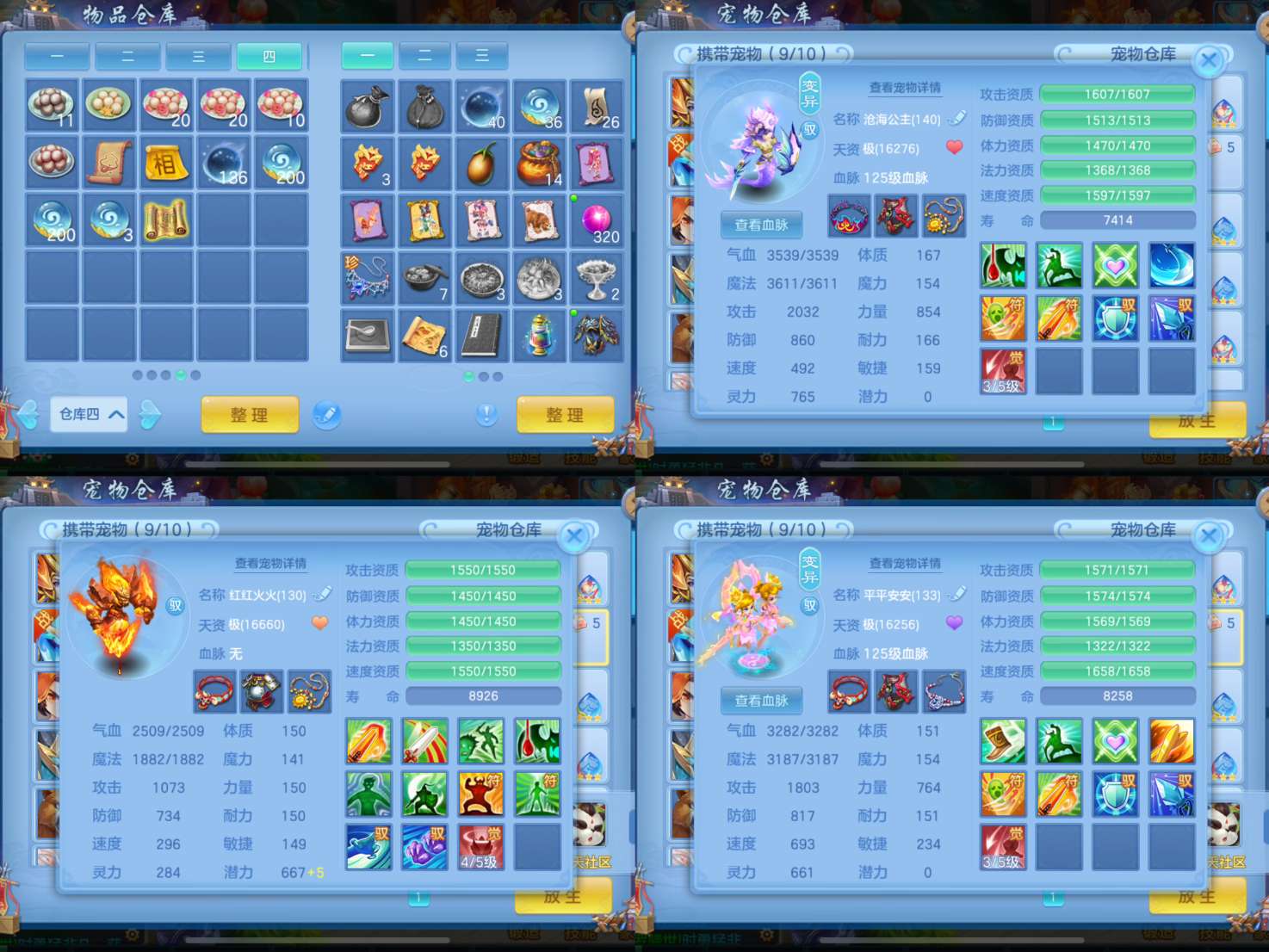 成品飞升136魔王 满修为 满宝宝 人物坐骑三染 各种极品特技装备 仓库有头像券 买回即玩 看图吧