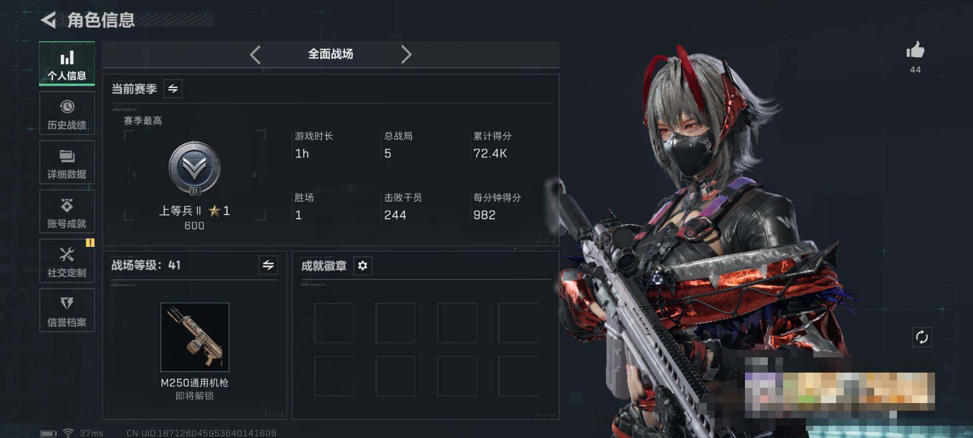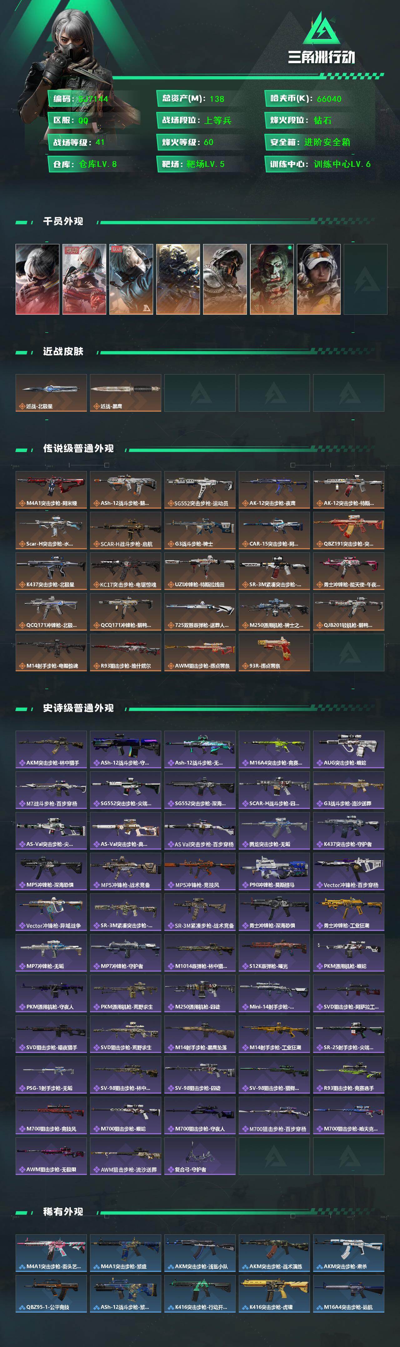 【SJ7144】总资产(M):138M/哈夫币(K):66040K/哈夫币(K):66040K/传说枪皮数:24/全面战场等级:41_段位:上等兵/烽火地带等级:60_段位:钻石/骇爪-水墨云图/骇爪-维什戴尔/蜂医-送葬人·无题密令/无名-夜鹰/深蓝-不破誓约/红狼-电锯惊魂/露娜-金牌射手/近战-北极星/近战-黑鹰/M4A1突击步枪-阿米娅/ASh-12战斗步枪-鹅鸭杀/SG552突击步枪-运动员/AK-12突击步枪-夜鹰/AK-12突击步枪-特斯拉线圈/SCAR-H战斗步枪-水墨云图/SC