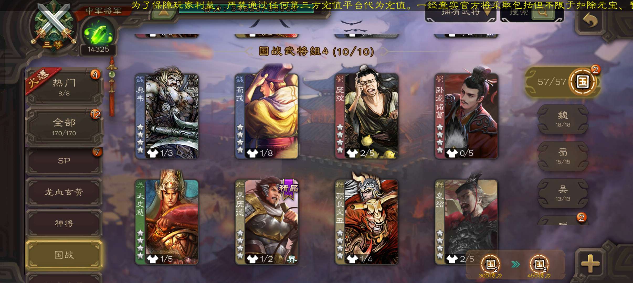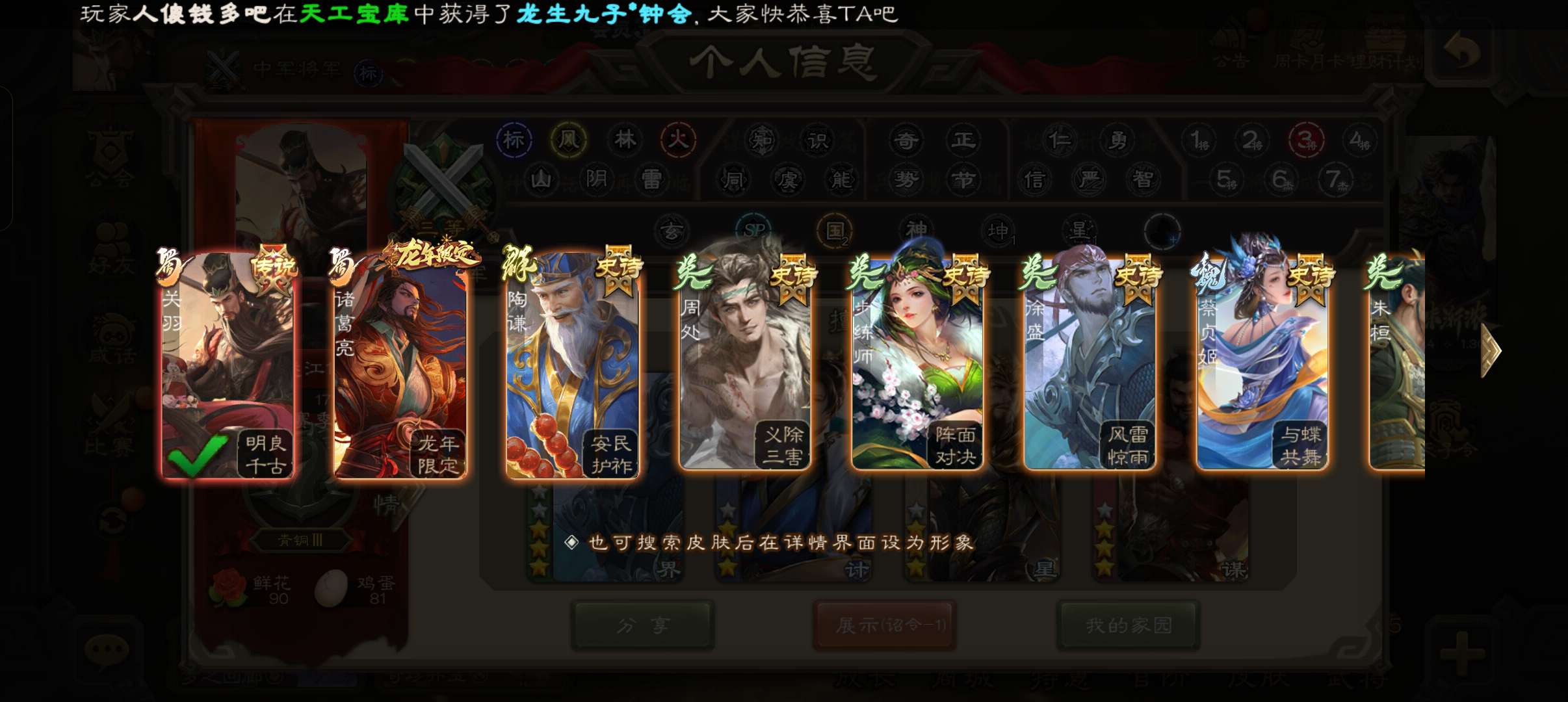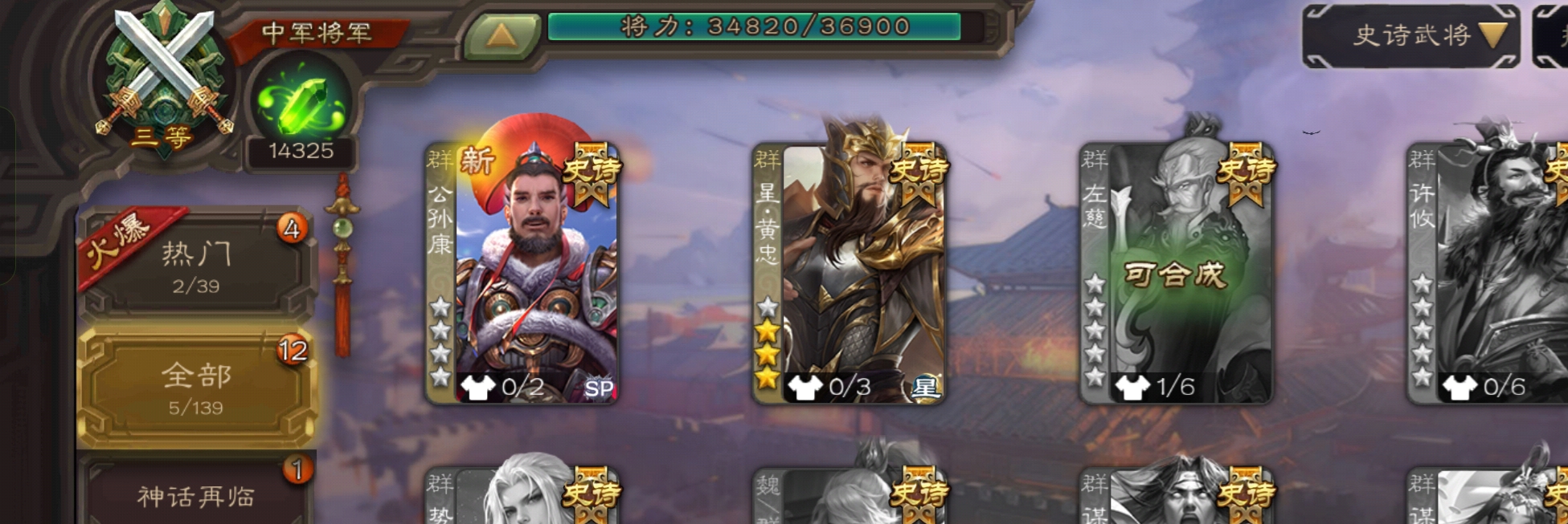 10万羽毛1.4万将魂,金皮大宝界徐盛星黄忠王粲公孙康程昱5史诗中军,谋张飞关银屏动态界关羽170将