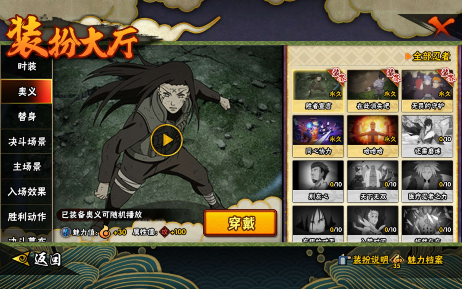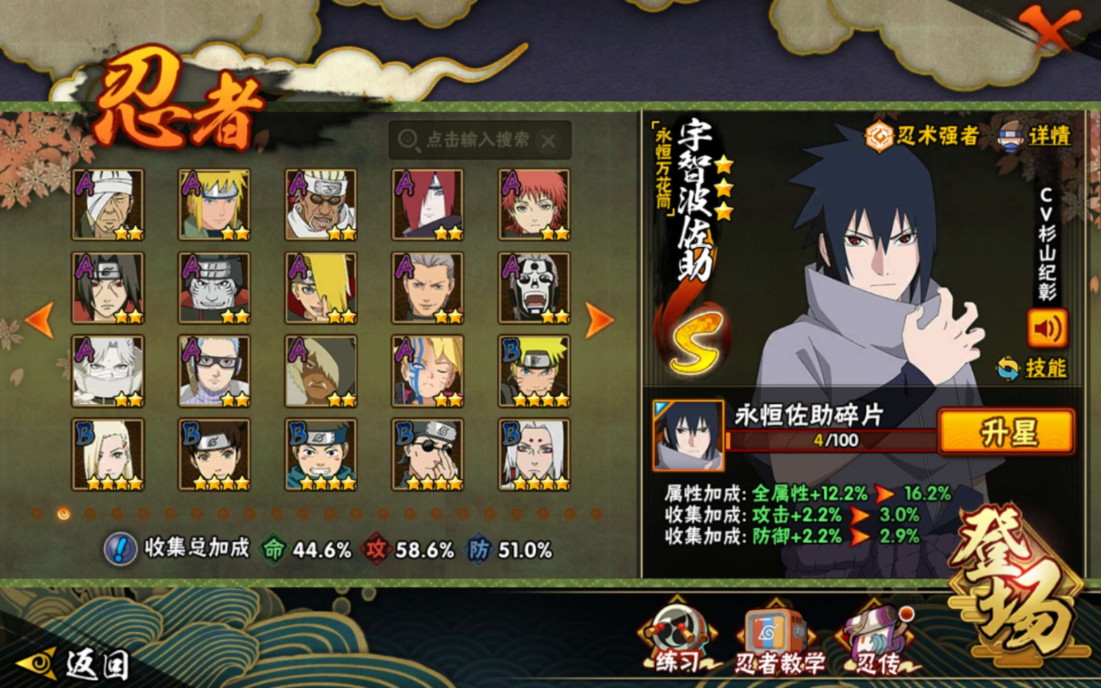 【S级忍者】宇智波佐助「永恒万花筒」(3星),漩涡鸣人「九喇嘛连结」(3星),自来也「舞之豪杰」(3星),宇智波鼬「须佐能乎」(3星),漩涡鸣人·宇智波佐助(3星),佩恩「天道」(3星),波风水门(3星),大蛇丸(3星),