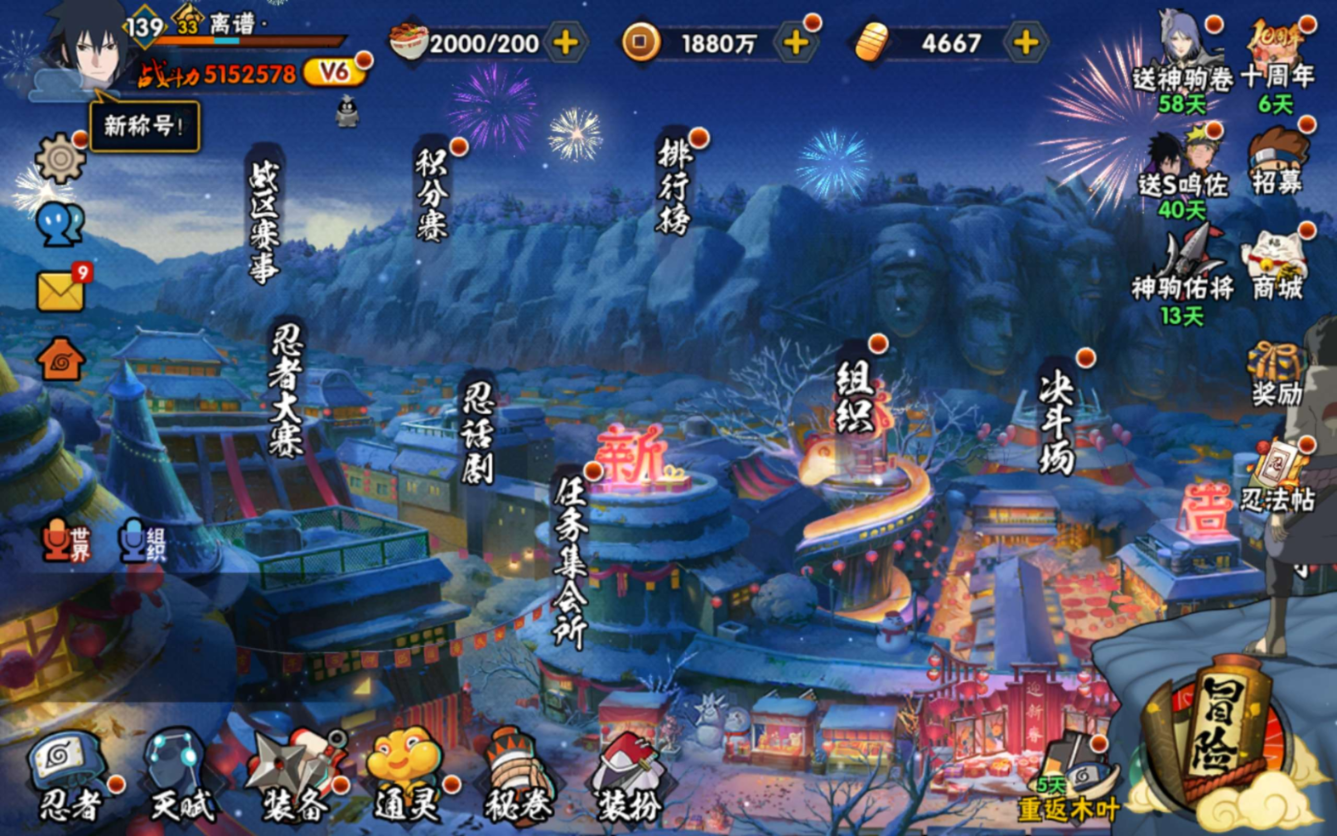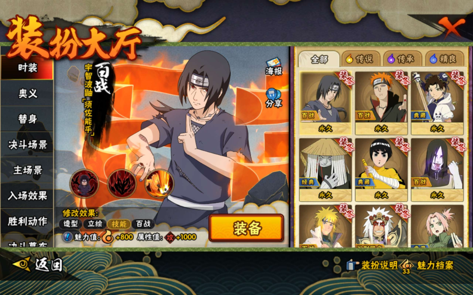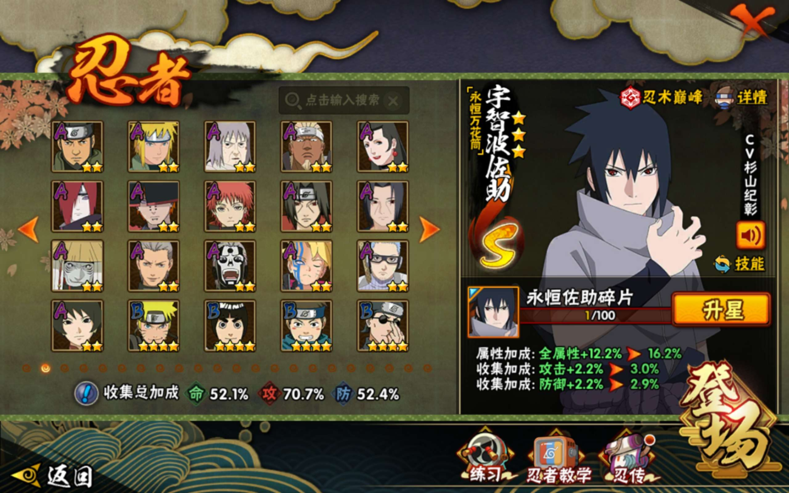 【S级忍者】宇智波带土「忍界大战」(3星),宇智波斑「秽土转生·解」(3星),宇智波佐助「永恒万花筒」(3星),漩涡鸣人「九喇嘛连结」(3星),宇智波斑「白面具」(3星),自来也「舞之豪杰」(3星),宇智波鼬「须佐能乎」(3星),佩恩「天道」(3星),波风水门(3星),大蛇丸(3星),猿飞日斩「秽土转生」(3星),
