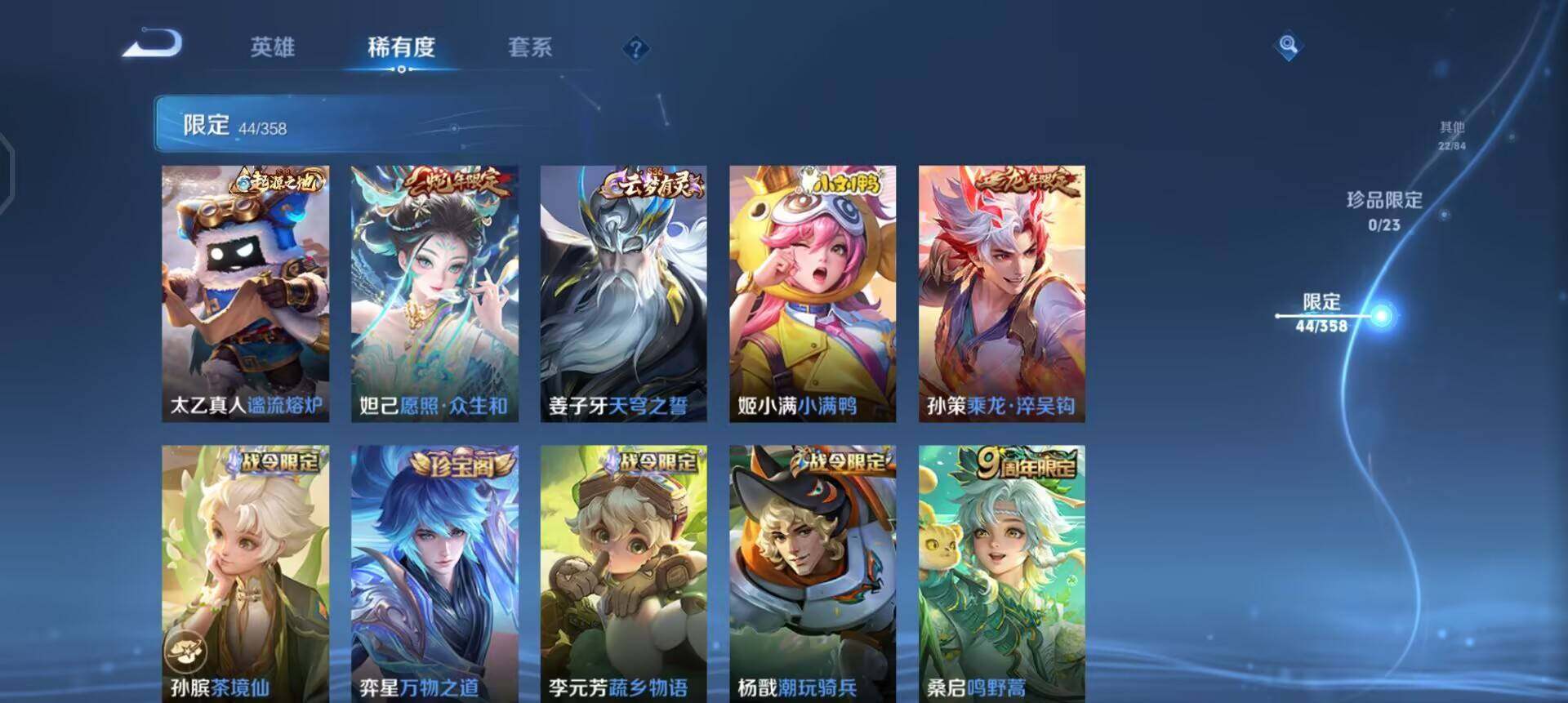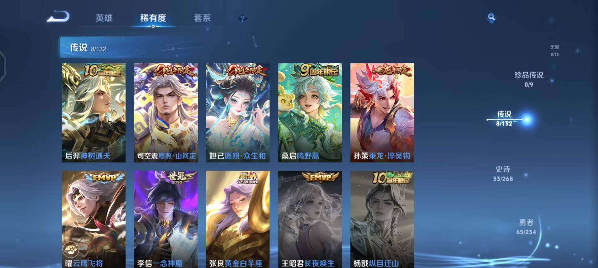 【传说皮肤】:后羿神树通天,司空震愿照山河定,妲己愿照众生和,桑启鸣野蒿,孙策乘龙淬吴钩,曜云鹰飞将,李信一念神魔,张良黄金白羊座