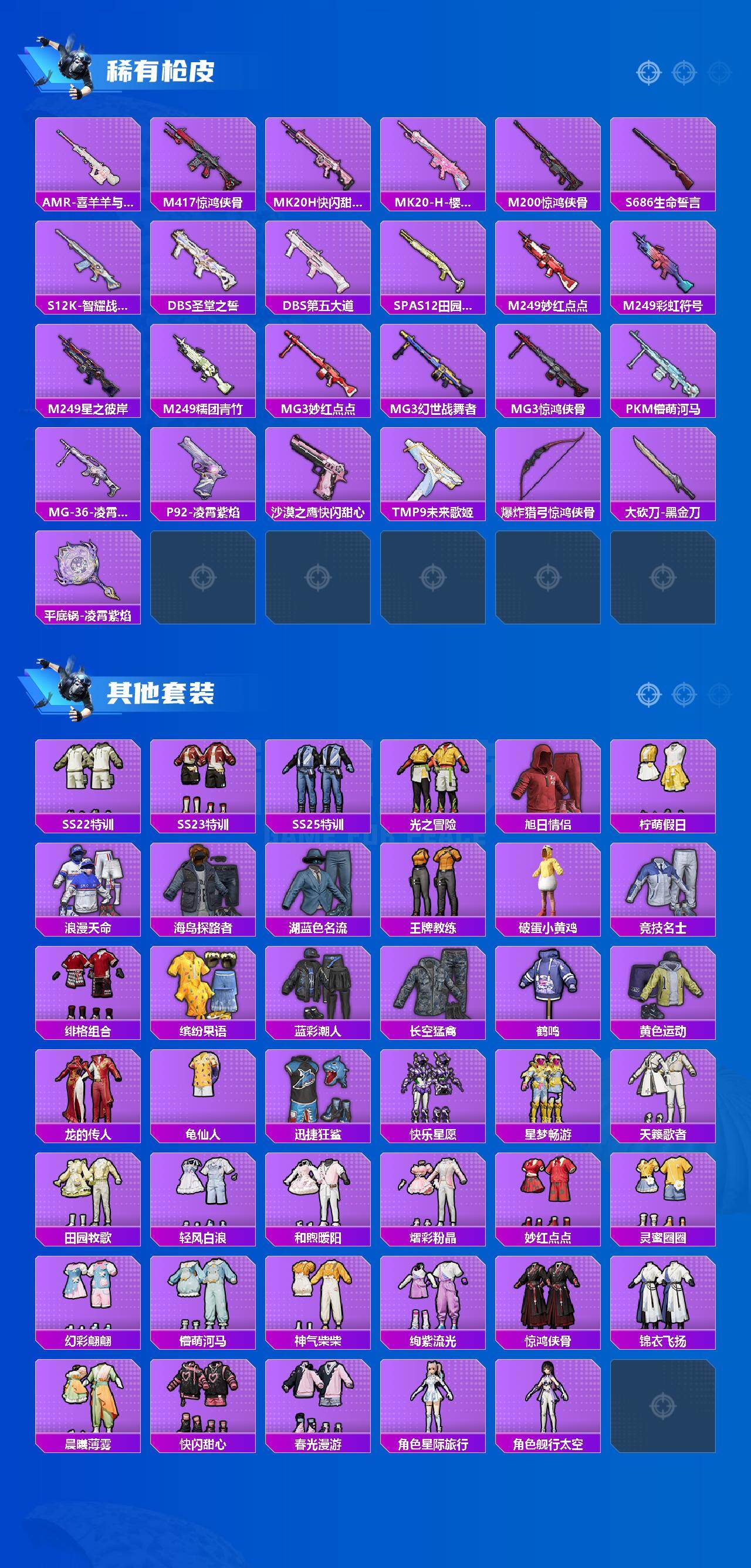 【粉色枪皮等级】:AKM-星际浪客(六级),SCAR-L-纯梦嫁纱(六级),AUG-星之彼岸(四级),Kar98K-巳巳如意(五级),AMR-智耀战神