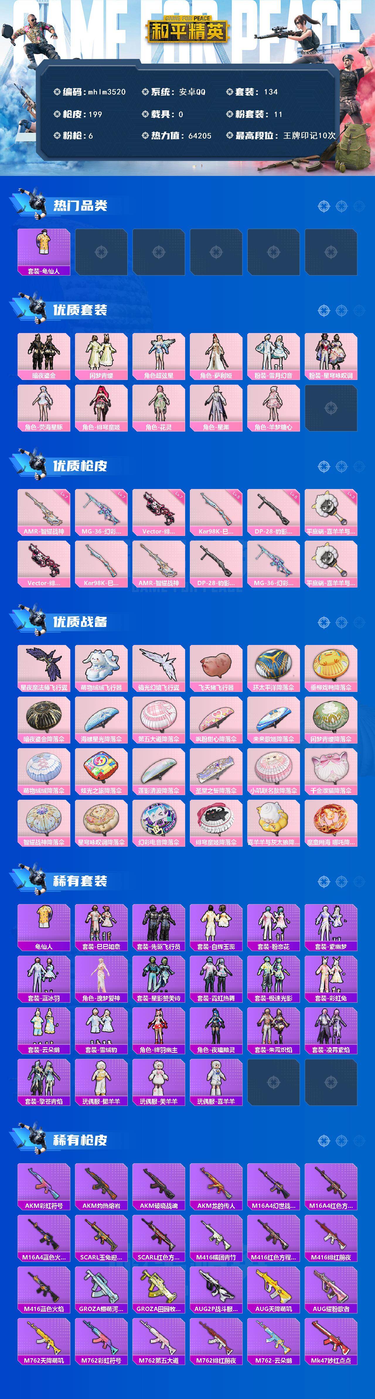 【mhlm3520】安卓 手Q-11粉装-6特效枪-0载具-4粉色飞行器-64205热力值-10王牌印记-134套装-199枪皮